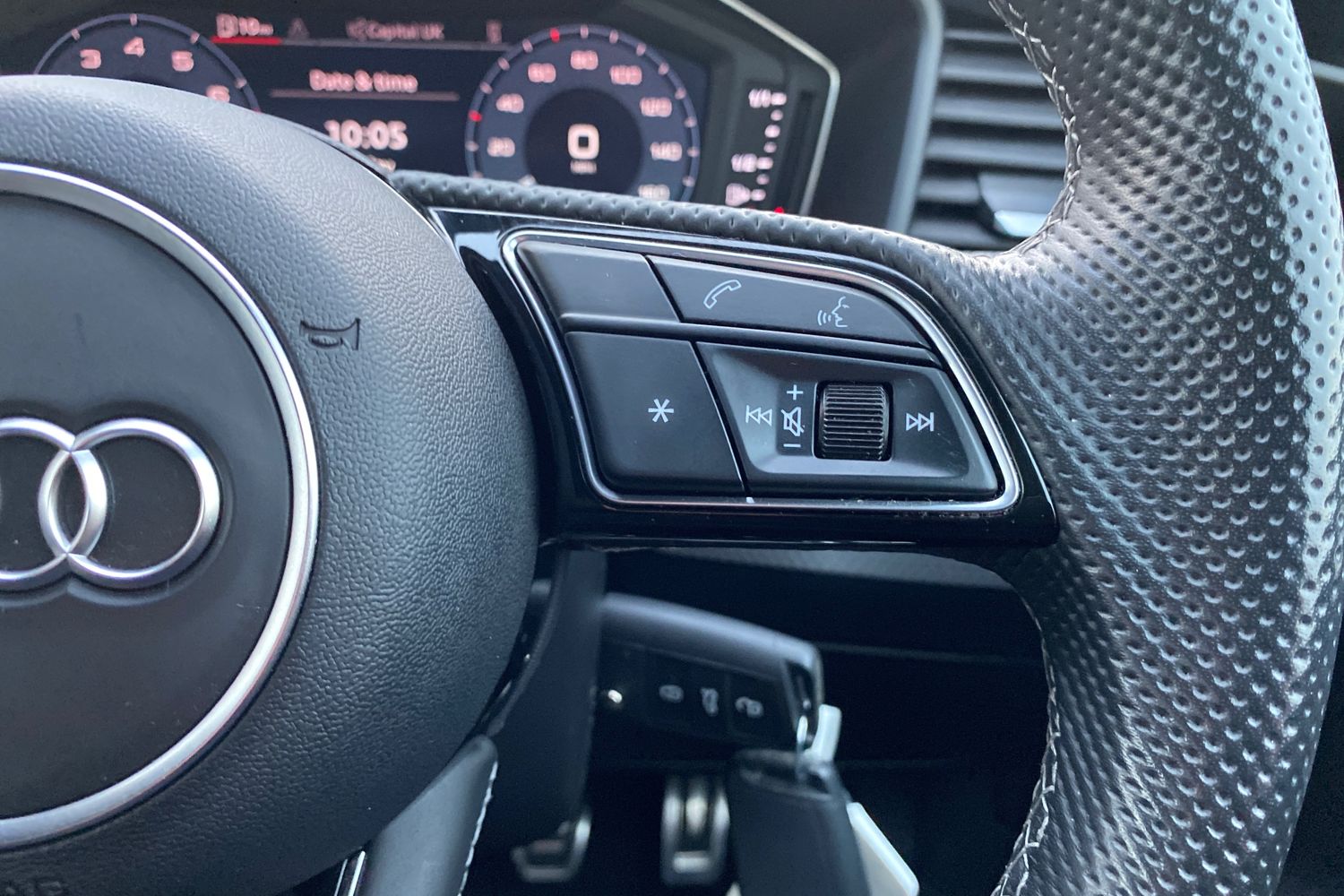 "Synthetic leather sport steering wheel with triple topstitching and alcantara finish",