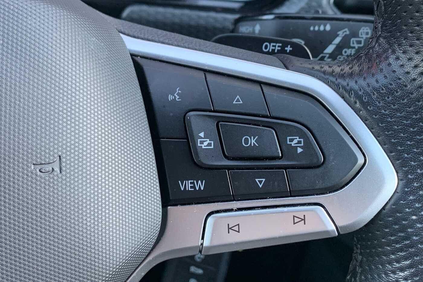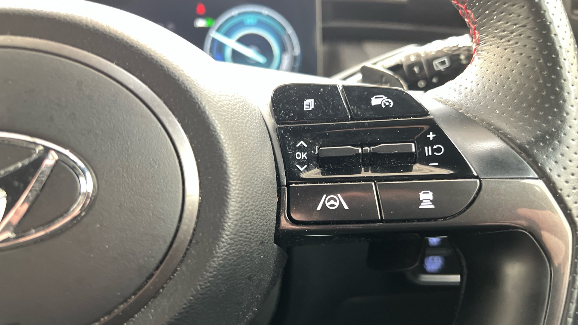 "Flat bottomed leather steering wheel in sensico with red stitching",