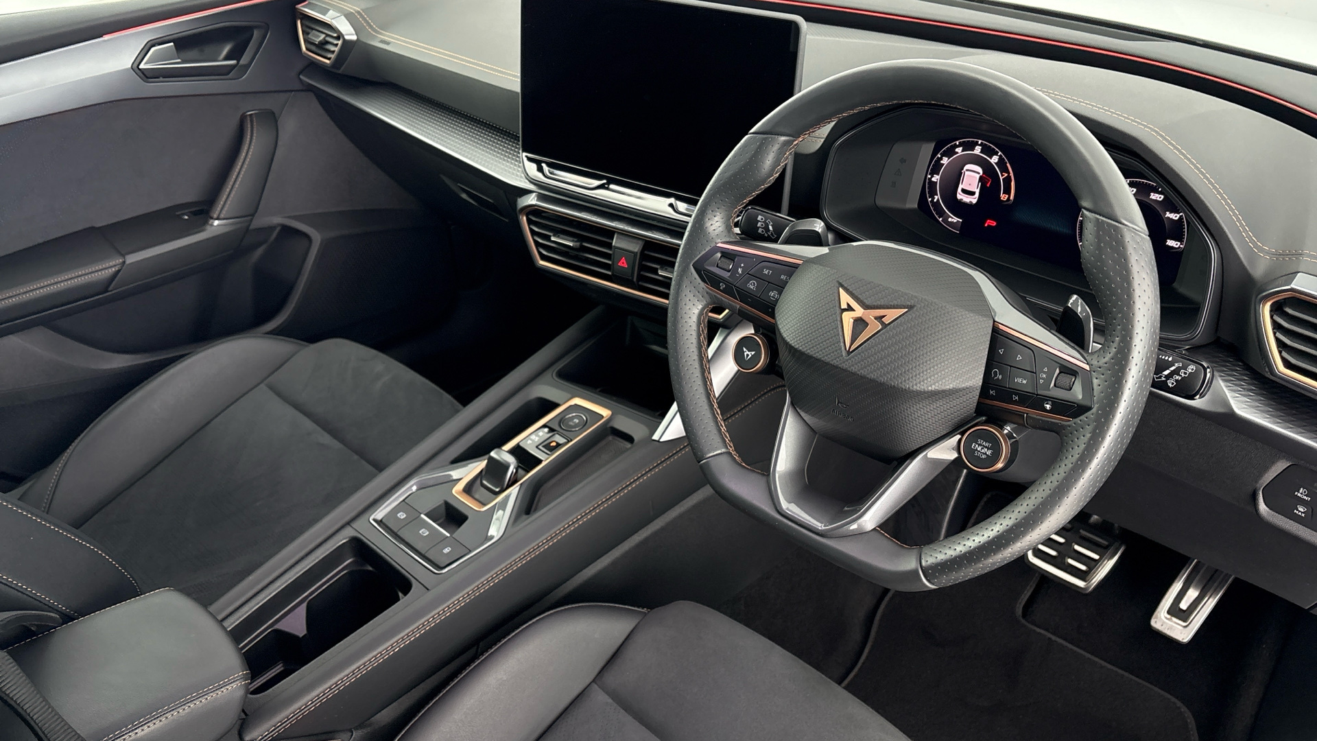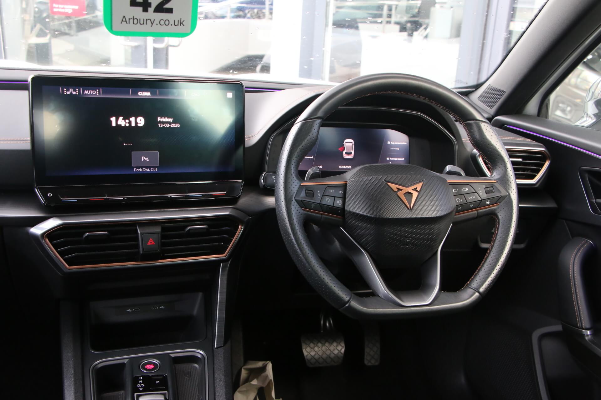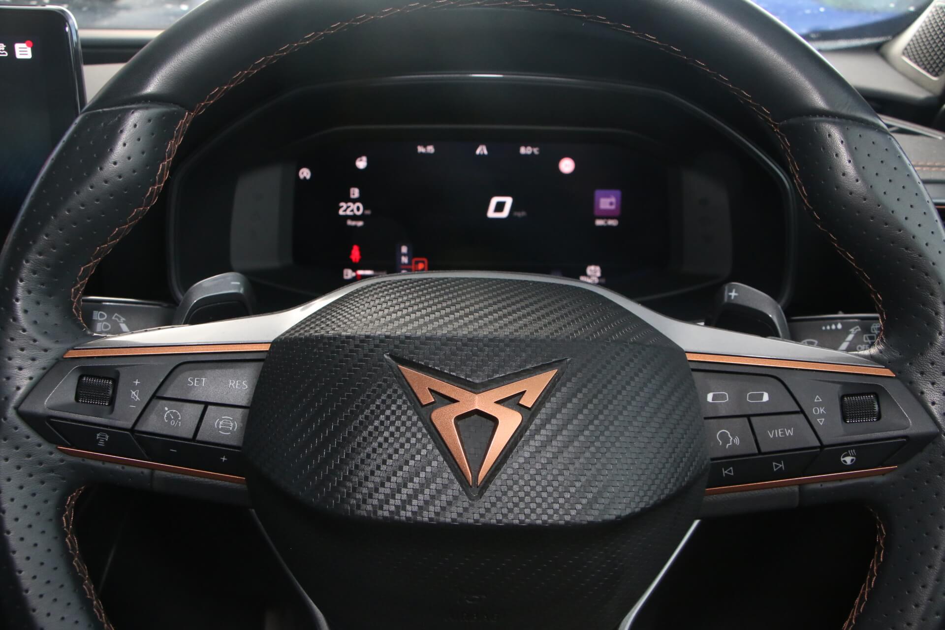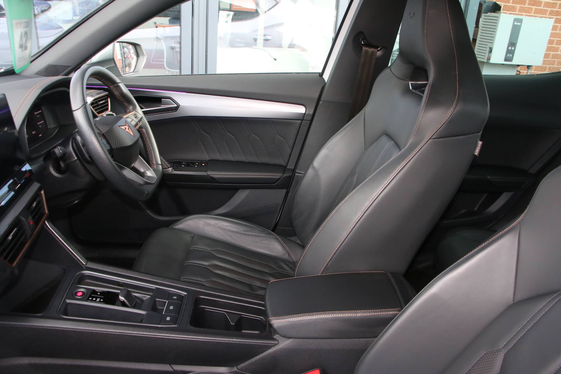 "features": "Digital cockpit and configurable dashboard, Driver alert system, Driving profile selection, Forward collision warning with automatic braking, Lane assist, Navigation system with 12'' Touchscreen Display, Park assist (inc front/rear parking sensors), PAS, Predictive adaptive cruise control with speed limiter, Rear view camera, RPM, trip computer, outside temp gauge, instrument light brightness, low fuel warning light, lights on reminder, gearshift indicator, Service interval indicator, Start/stop system with regenerative braking, Voice control system, Wired Android Auto, Wireless apple carplay, Wireless phone charger, Electronic locking differential and dynamic traction support, Standard suspension, 2 front and 2 rear USB type C sockets, Auxiliary input socket, DAB radio, Auto dimming rear view mirror, Body colour door handles, Body coloured bumpers, Dark grey wing mirror, Daytime running light with automatic headlight control and coming home feature, Dynamic headlight range control, Electric front/rear windows, Electrically adjustable heated and folding door mirrors with memory function, Front fog lamps with cornering function, Gloss black roof rails and window surrounds, LED Headlights, LED Taillights with dynamic indicator, Rain sensing wipers, Rear diffuser with black simulated exhaust pipes, Rear side wing doors, Rear wash/wipe, Third brake light, Tinted rear windows, Welcome lights, 12v power supply in centre console, 12V socket, 12v socket in loadspace, 2 front and 2 rear reading lights, 230V socket, 3 seat bench in 2nd row, 60/40 split rear bench seat with armrest and mechanical seat release, Black headlining, Dust/pollen filter, Front and rear head restraints, Front centre armrest, Height/reach adjust steering wheel, Illuminated interior front door sills, Illuminated sunvisor with mirror, Isofix, Leather multi function heated steering wheel with gear shift paddles, Luggage tie-down hooks, Single front passenger seat, Three zone climate control with control panel in rear, Variable luggage/load compartment floor, Wraparound lighting, Genuine Nappa leather Pack - Cupra, 3 point seatbelts on all rear seats, ABS, Brake control system - ESC and brake booster, Child proof door locks, Driver and front passenger airbags with front passenger airbag de-activation, Electronic parking brake, Front and rear disc brakes, Front side curtain airbags, Hill hold control, Public e-call, Seat belt reminder for front and rear seats, Tyre pressure monitoring system, Anti theft alarm system, Keyless entry and start system (KESSY), Locking wheel bolts, Copper and aluminium interior detailing, 19\" 'Exclusive' machined sport matte black and silver alloy wheels, ",