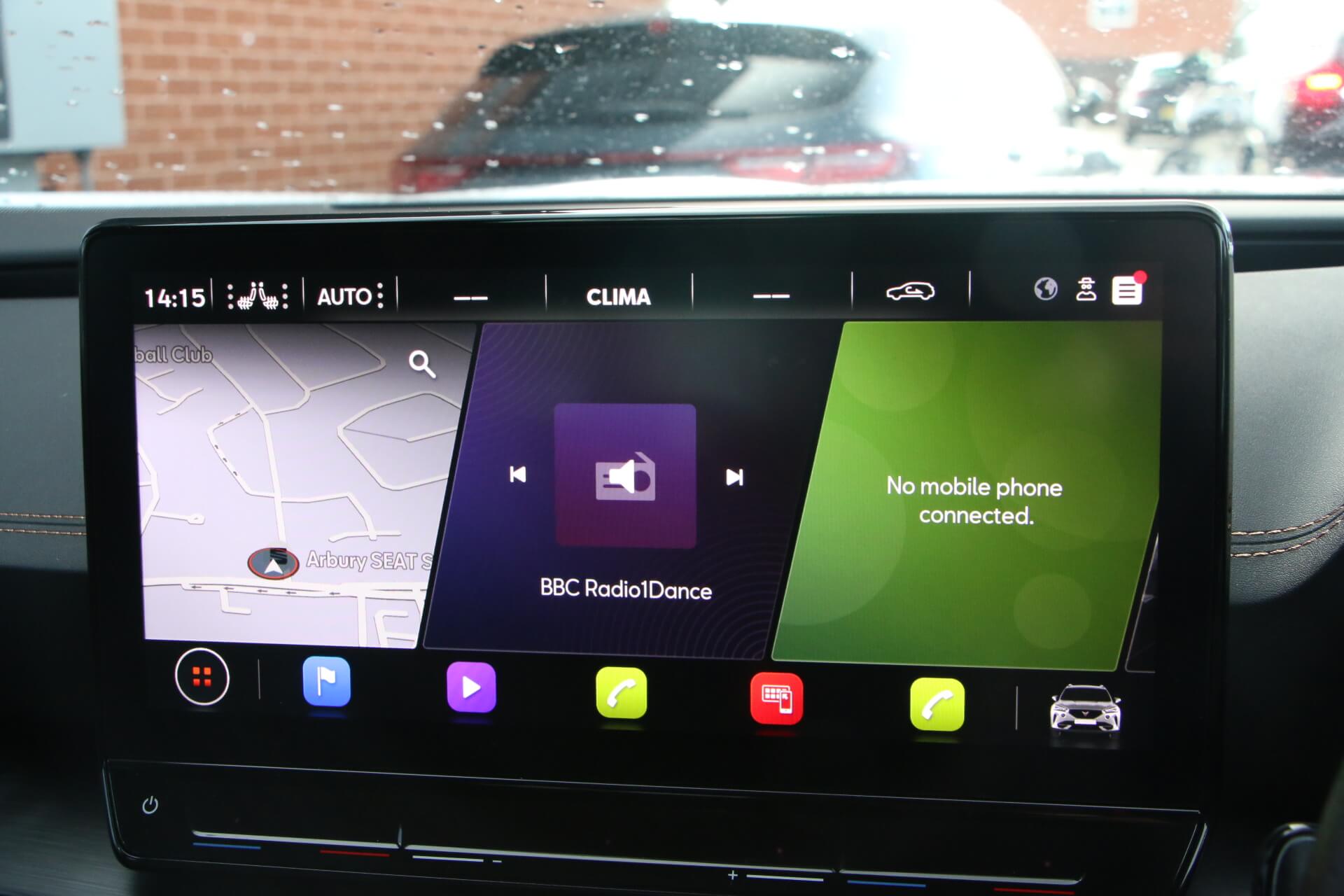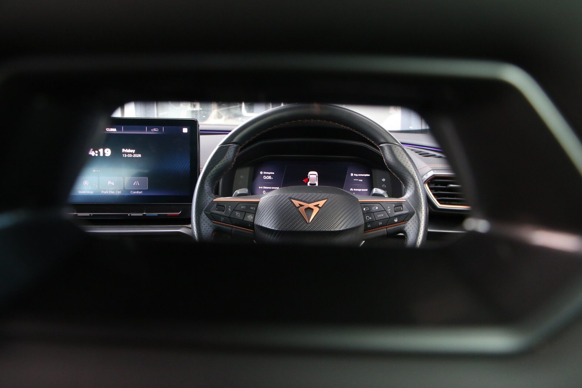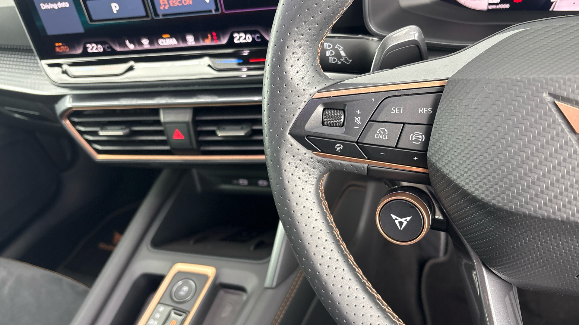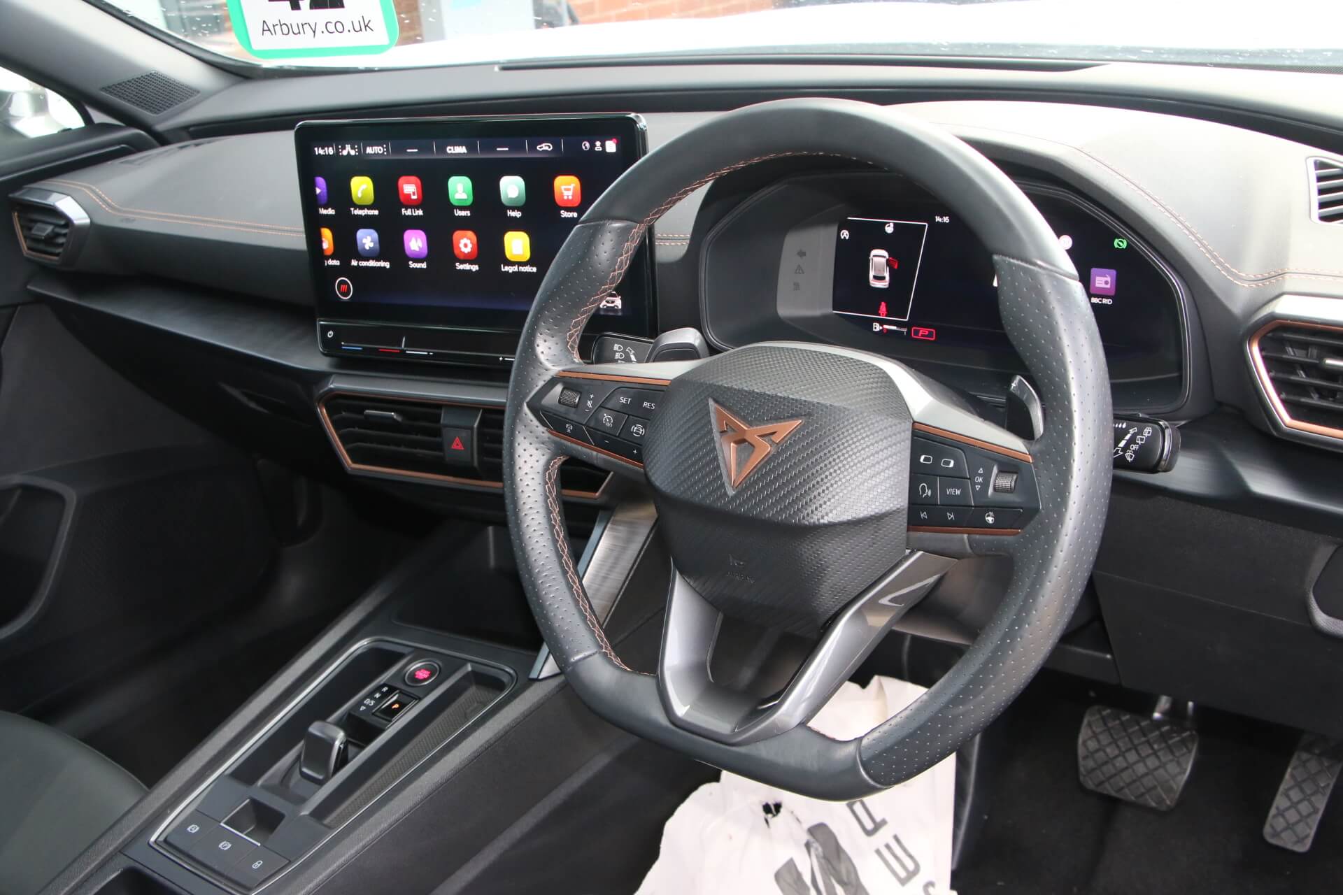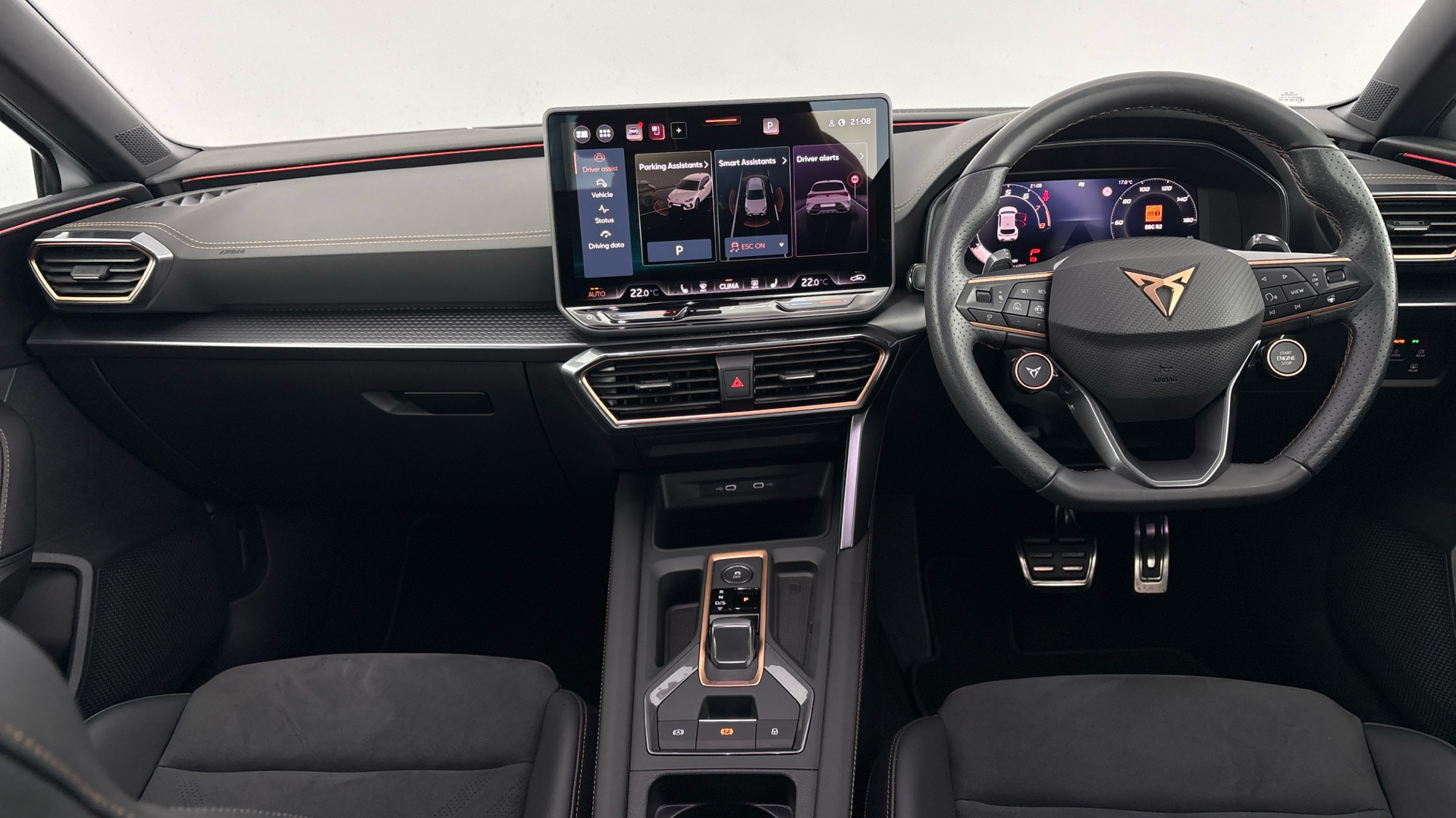 "features": "Digital cockpit and configurable dashboard, Driver alert system, Driving profile selection, Forward collision warning with automatic braking, Lane assist, Navigation system with 12'' Touchscreen Display, Park assist (inc front/rear parking sensors), PAS, Predictive adaptive cruise control with speed limiter, Rear view camera, RPM, trip computer, outside temp gauge, instrument light brightness, low fuel warning light, lights on reminder, gearshift indicator, Service interval indicator, Start/stop system with regenerative braking, Voice control system, Wired Android Auto, Wireless apple carplay, Wireless phone charger, Electronic locking differential and dynamic traction support, Standard suspension, 2 front and 2 rear USB type C sockets, Auxiliary input socket, DAB radio, Auto dimming rear view mirror, Body colour door handles, Body coloured bumpers, Dark grey wing mirror, Daytime running light with automatic headlight control and coming home feature, Dynamic headlight range control, Electric front/rear windows, Electrically adjustable heated and folding door mirrors with memory function, Front fog lamps with cornering function, Gloss black roof rails and window surrounds, LED Headlights, LED Taillights with dynamic indicator, Rain sensing wipers, Rear diffuser with black simulated exhaust pipes, Rear side wing doors, Rear wash/wipe, Third brake light, Tinted rear windows, Welcome lights, 12v power supply in centre console, 12V socket, 12v socket in loadspace, 2 front and 2 rear reading lights, 230V socket, 3 seat bench in 2nd row, 60/40 split rear bench seat with armrest and mechanical seat release, Black headlining, Dust/pollen filter, Front and rear head restraints, Front centre armrest, Height/reach adjust steering wheel, Illuminated interior front door sills, Illuminated sunvisor with mirror, Isofix, Leather multi function heated steering wheel with gear shift paddles, Luggage tie-down hooks, Single front passenger seat, Three zone climate control with control panel in rear, Variable luggage/load compartment floor, Wraparound lighting, Genuine Nappa leather Pack - Cupra, 3 point seatbelts on all rear seats, ABS, Brake control system - ESC and brake booster, Child proof door locks, Driver and front passenger airbags with front passenger airbag de-activation, Electronic parking brake, Front and rear disc brakes, Front side curtain airbags, Hill hold control, Public e-call, Seat belt reminder for front and rear seats, Tyre pressure monitoring system, Anti theft alarm system, Keyless entry and start system (KESSY), Locking wheel bolts, Copper and aluminium interior detailing, 19\" 'Exclusive' machined sport matte black and silver alloy wheels, ",