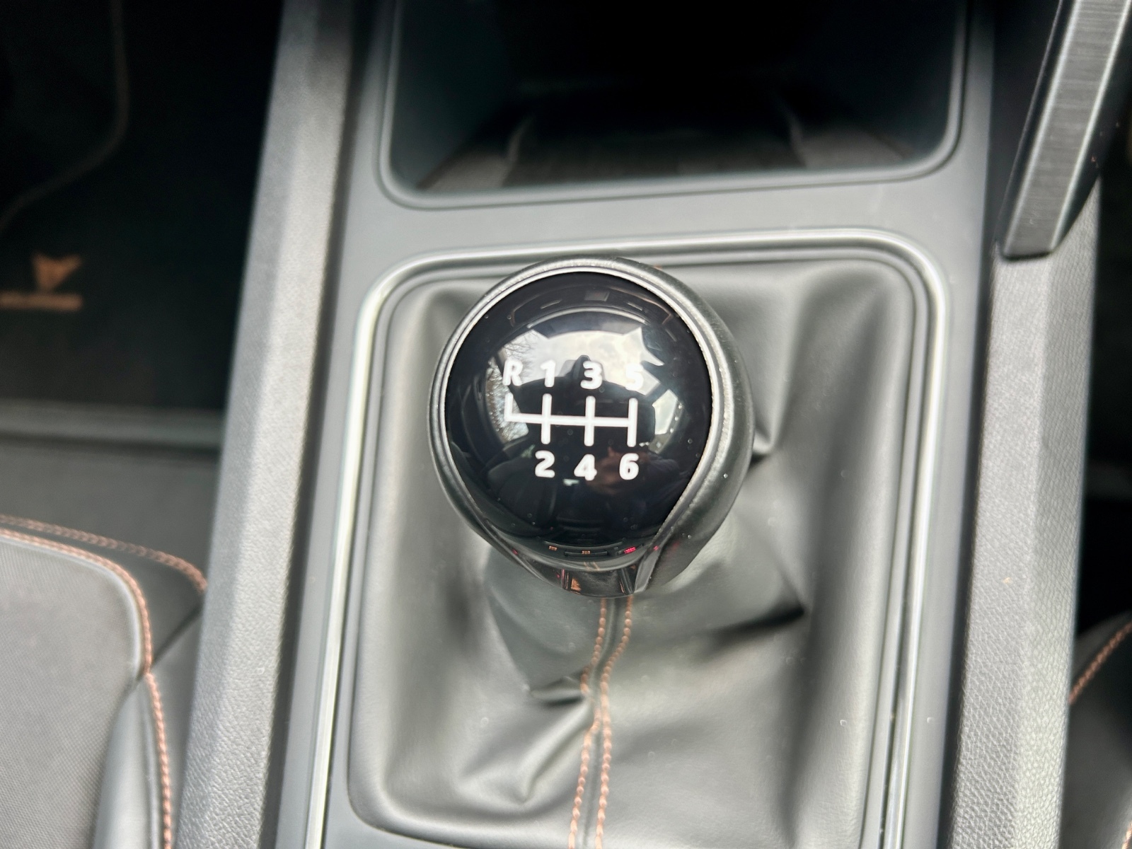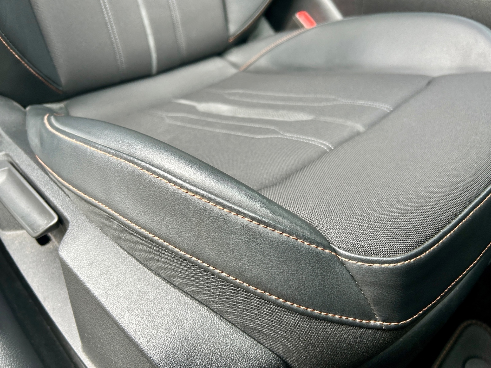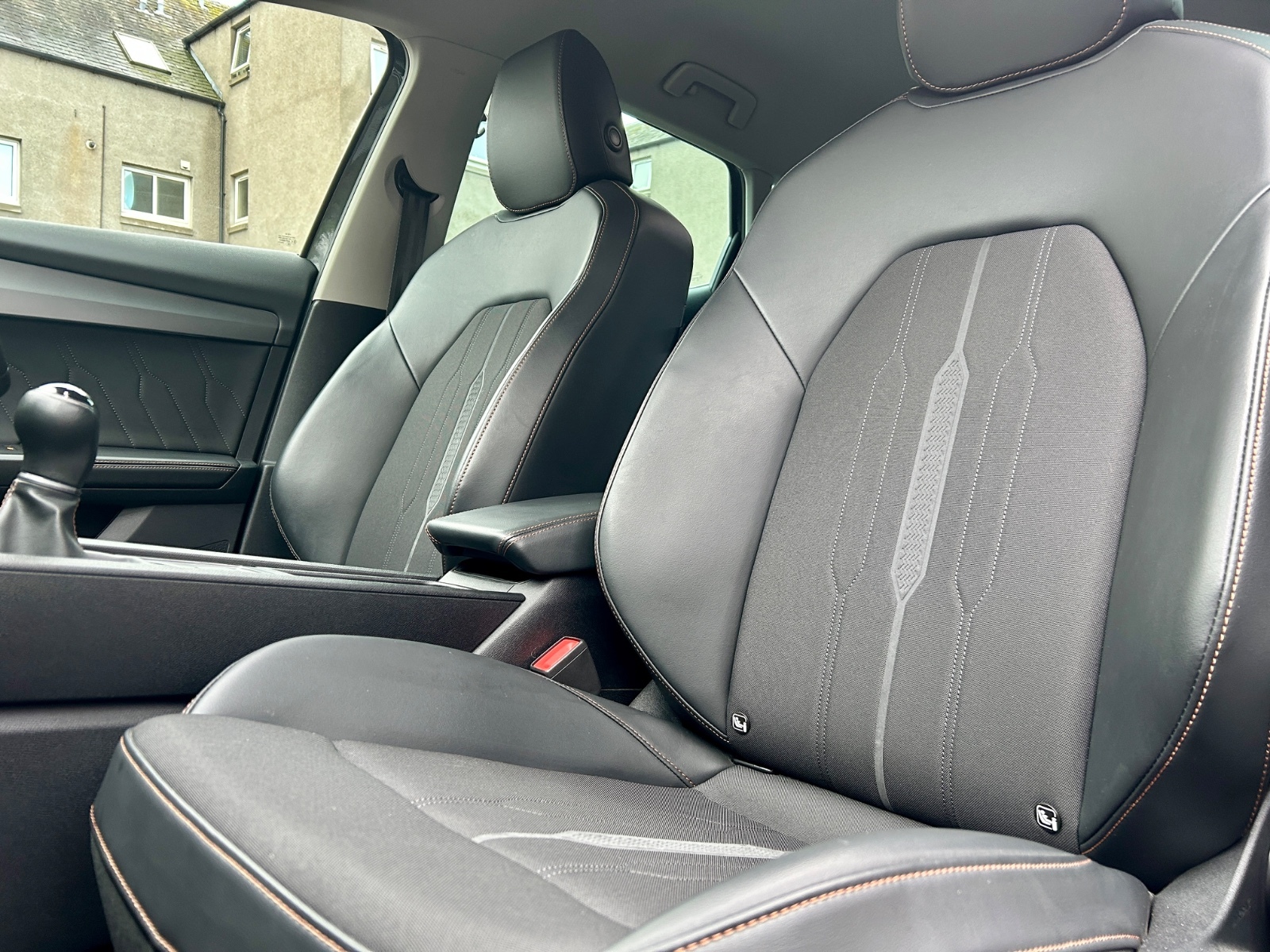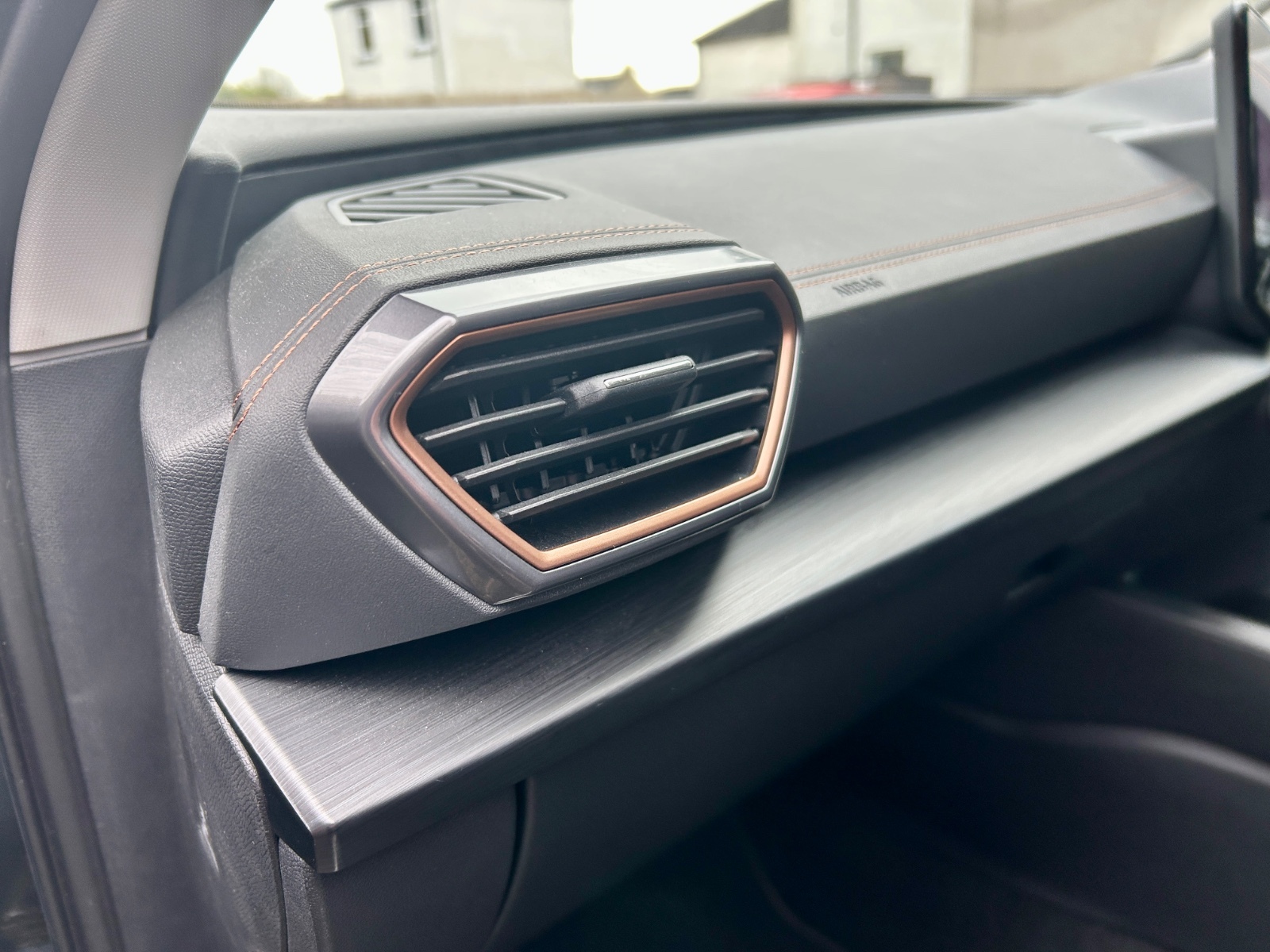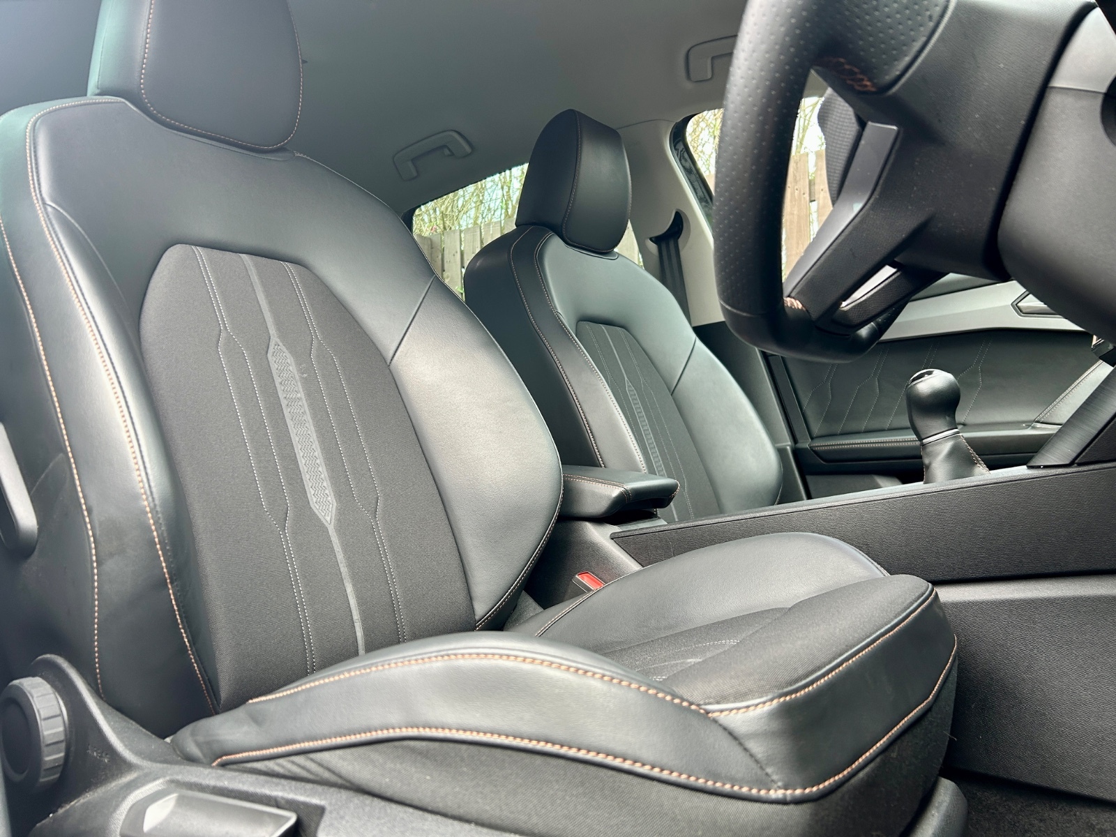 "Black artificial leather dashboard with grey stitching",