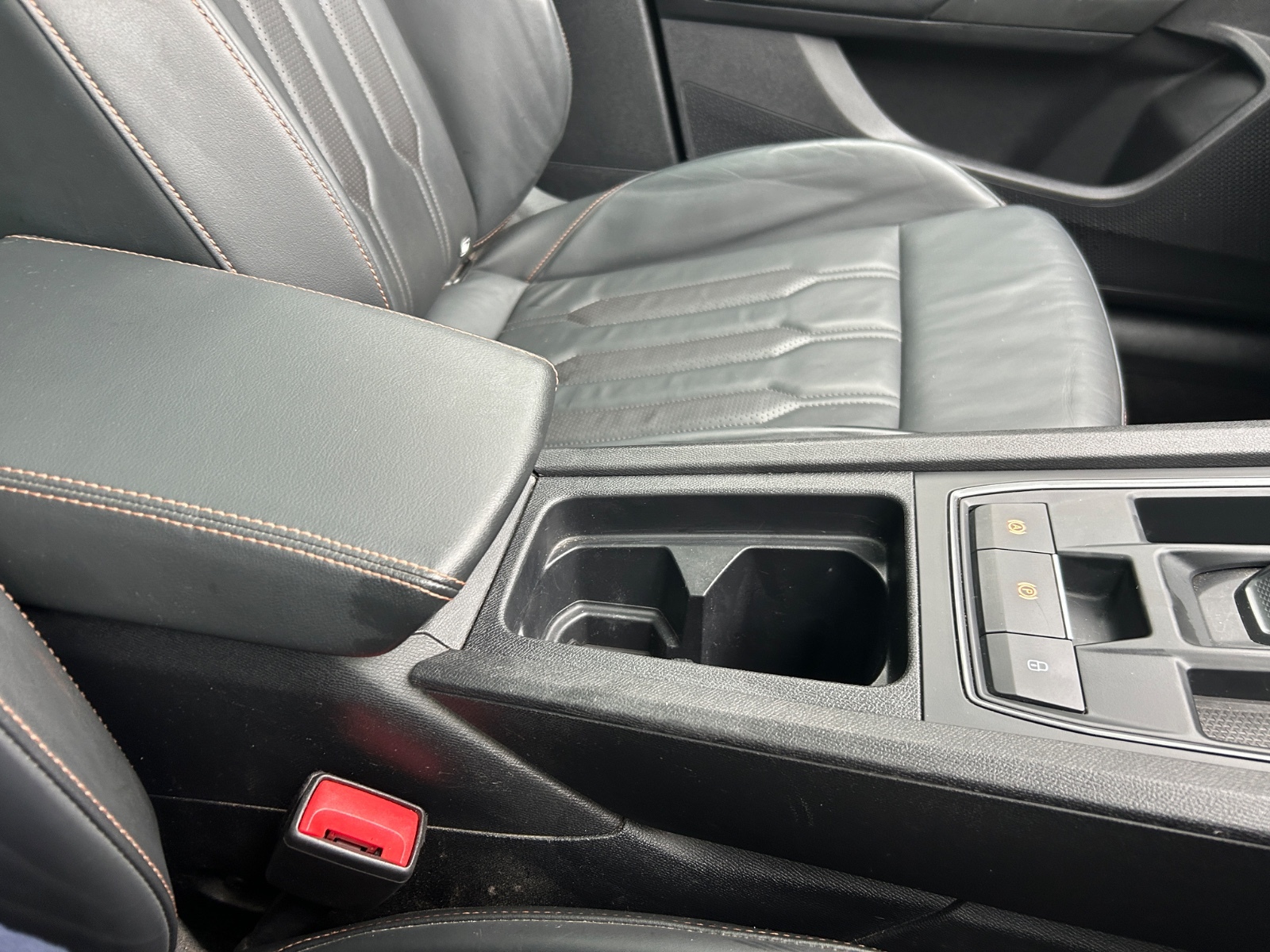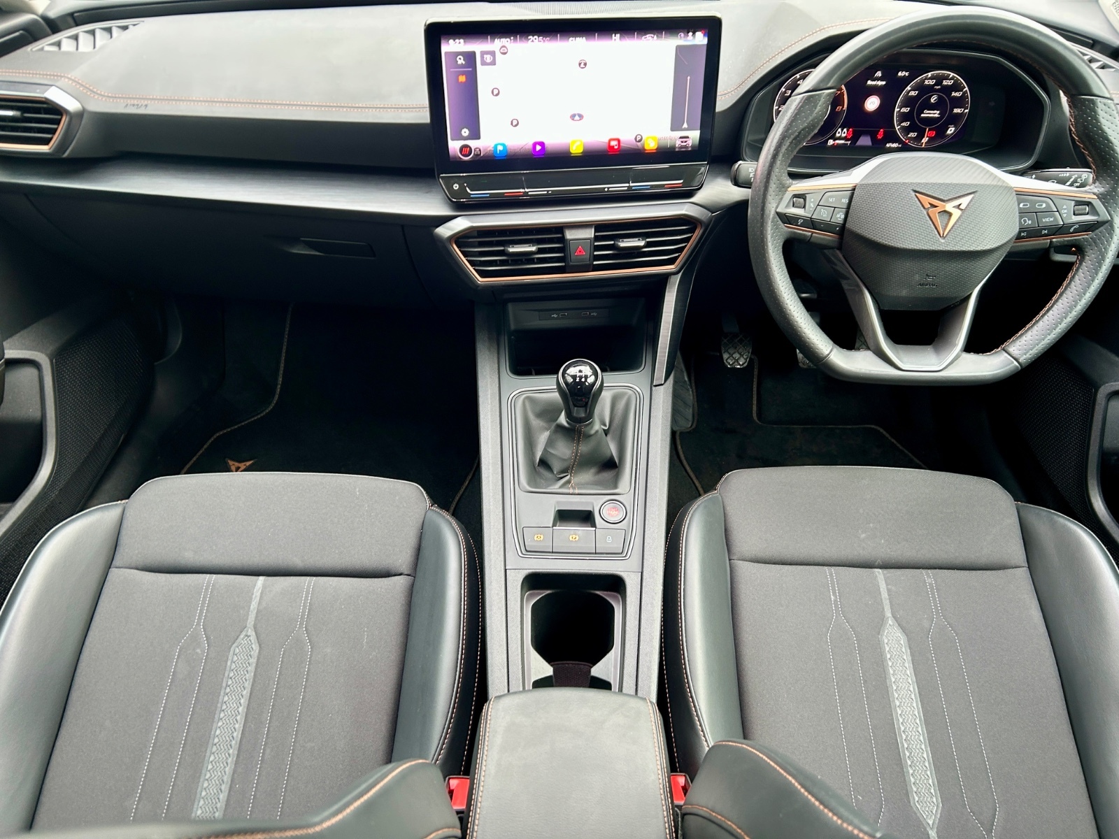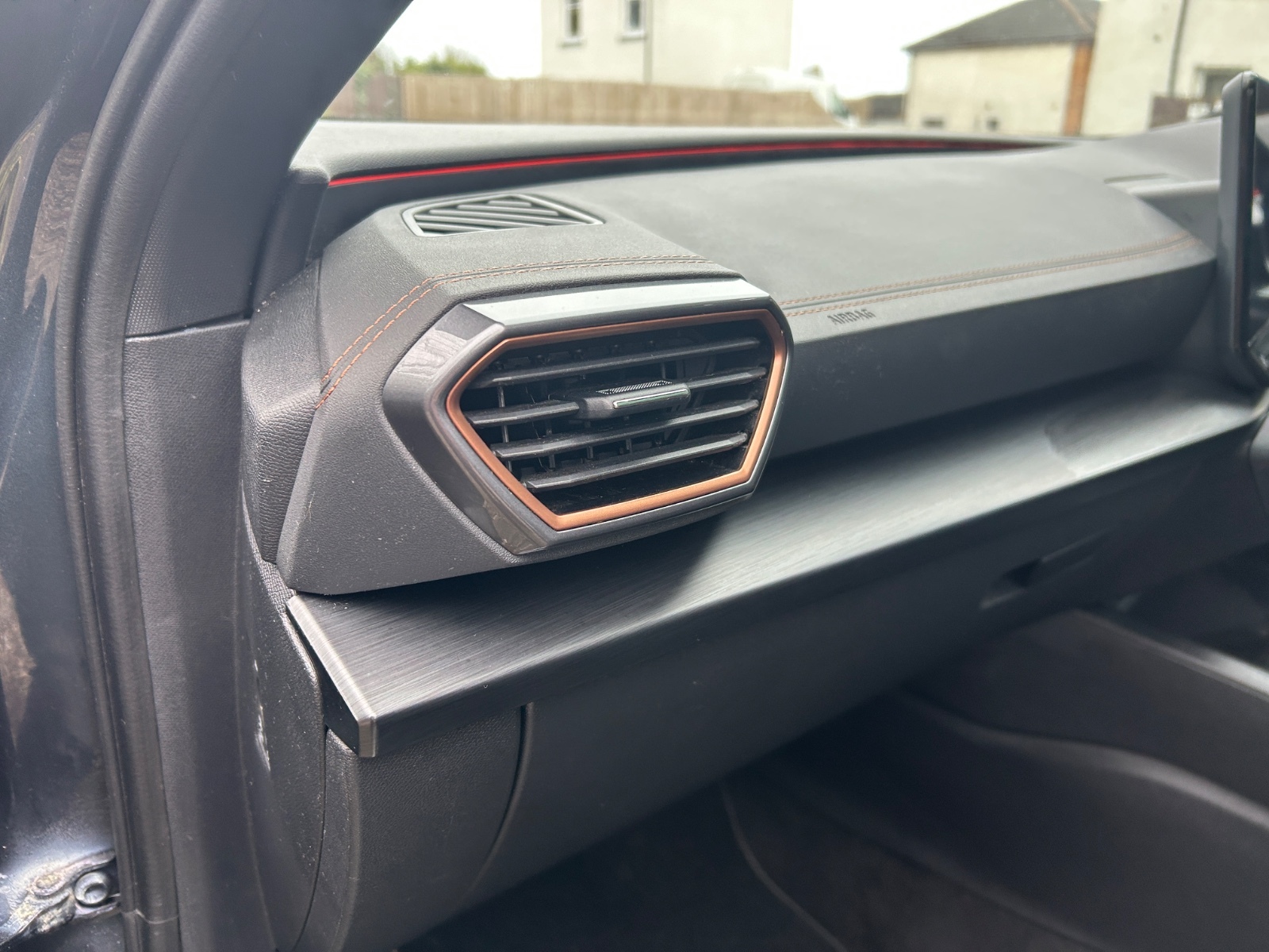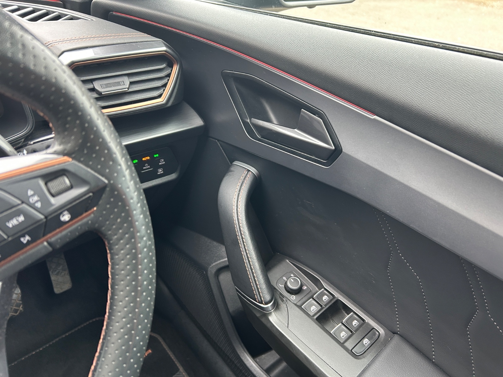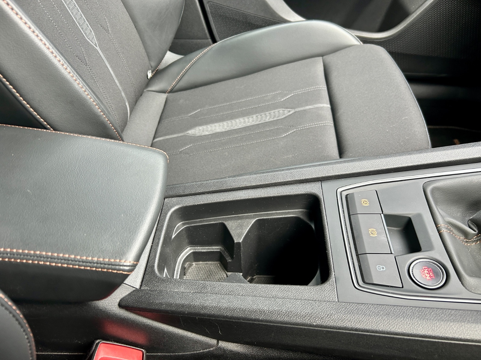 "Black artificial leather dashboard with grey stitching",