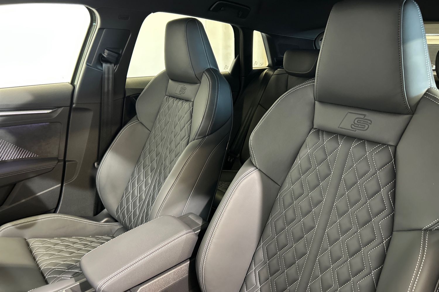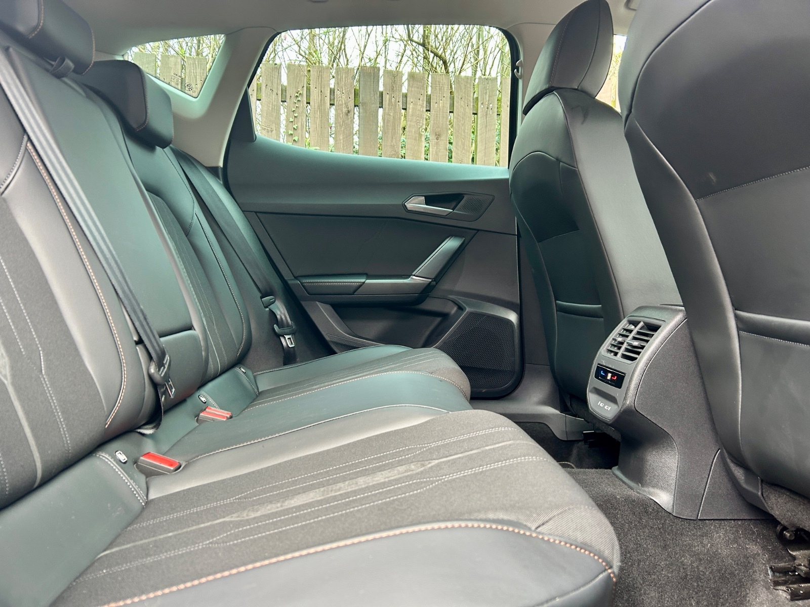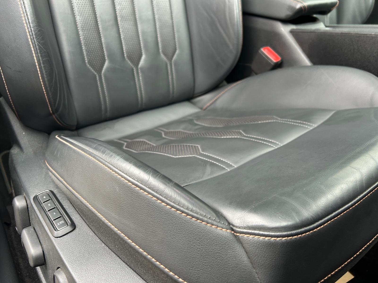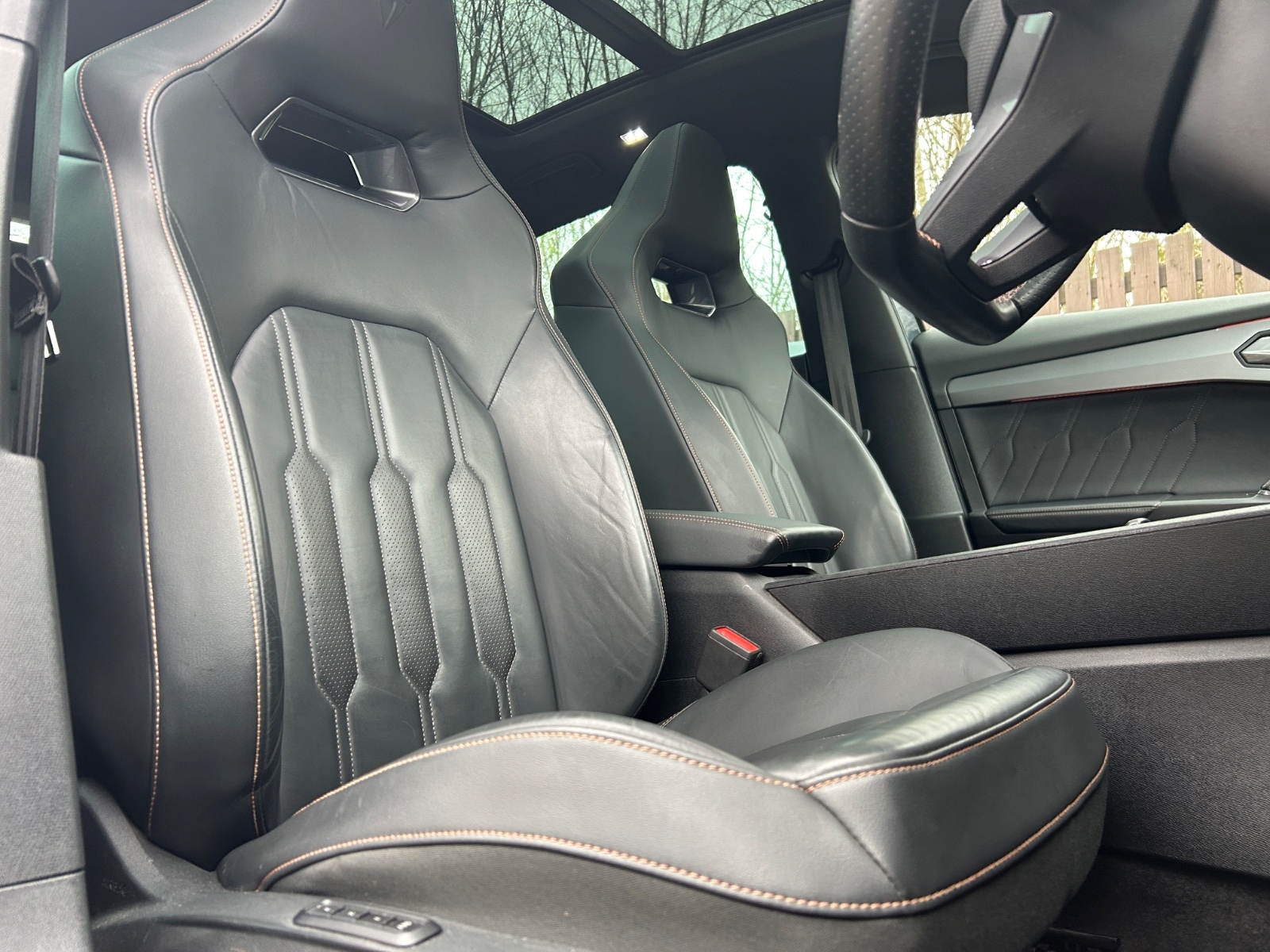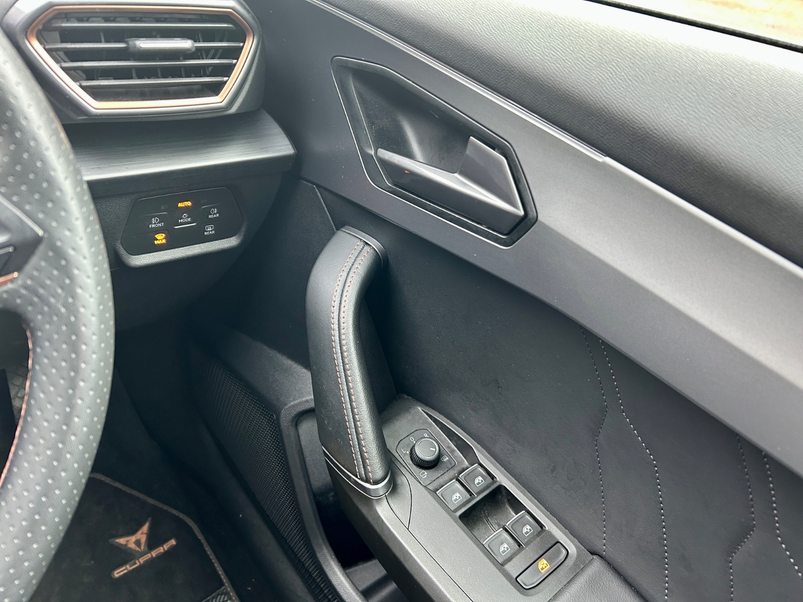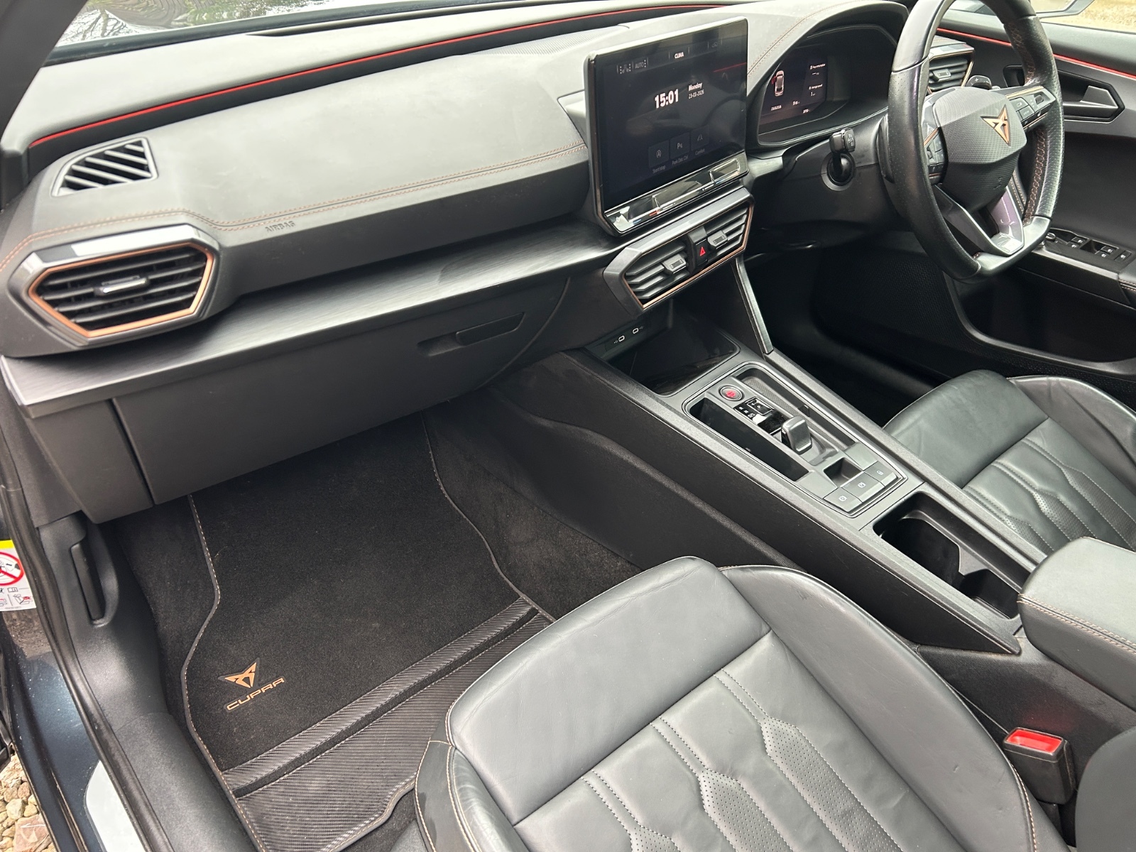 "Black artificial leather dashboard with grey stitching",