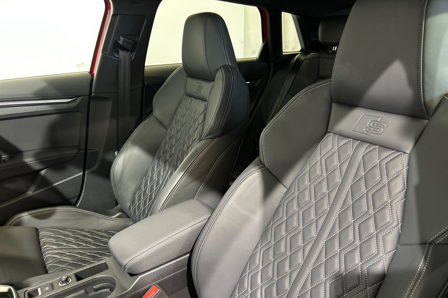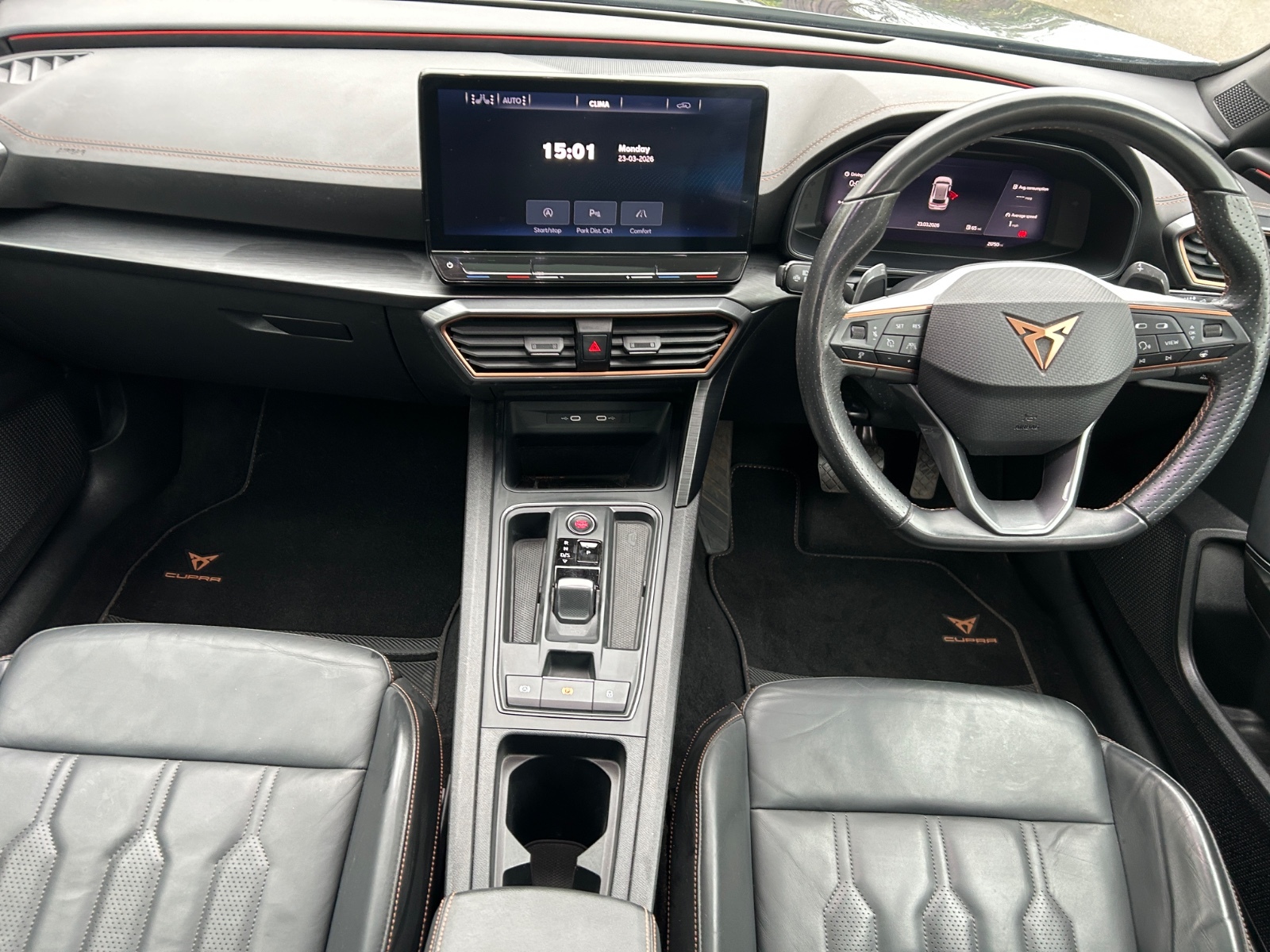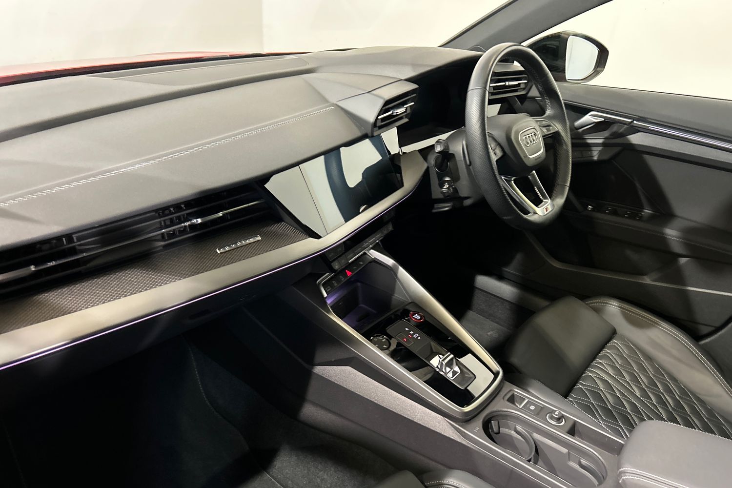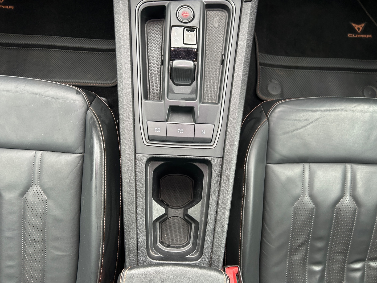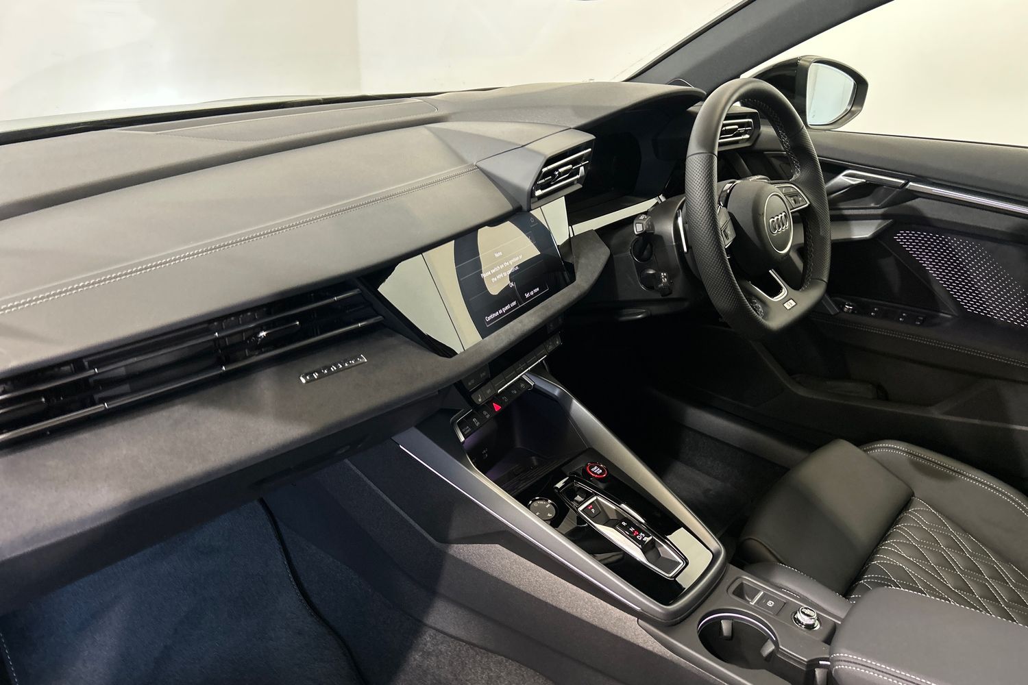 "Black artificial leather dashboard with grey stitching",