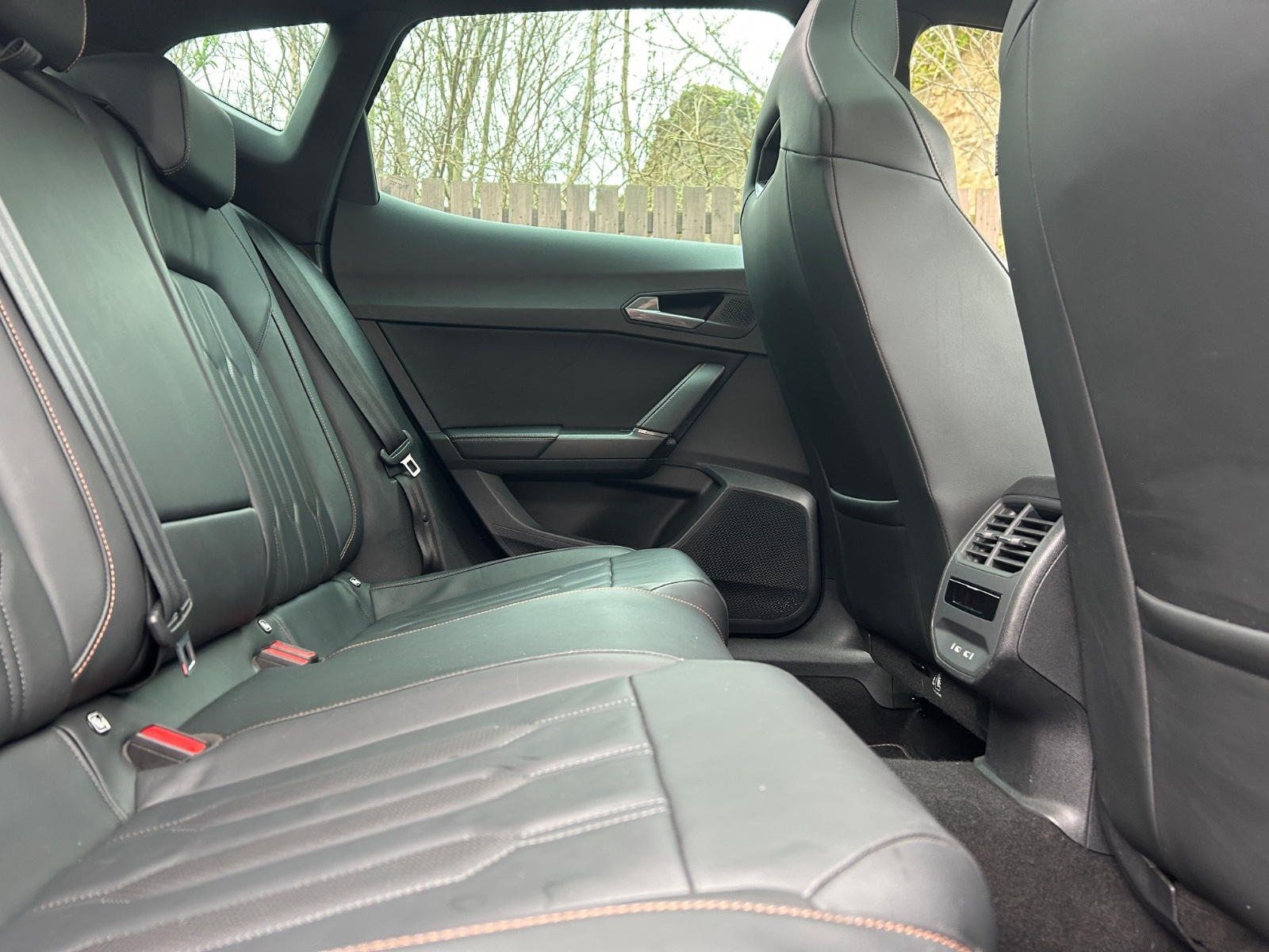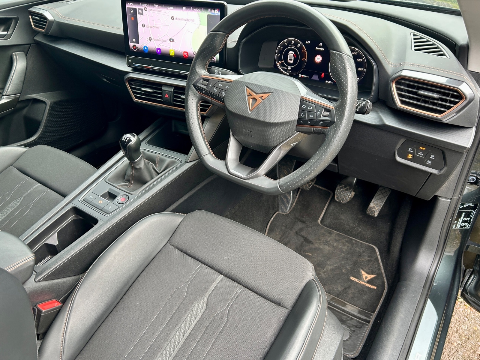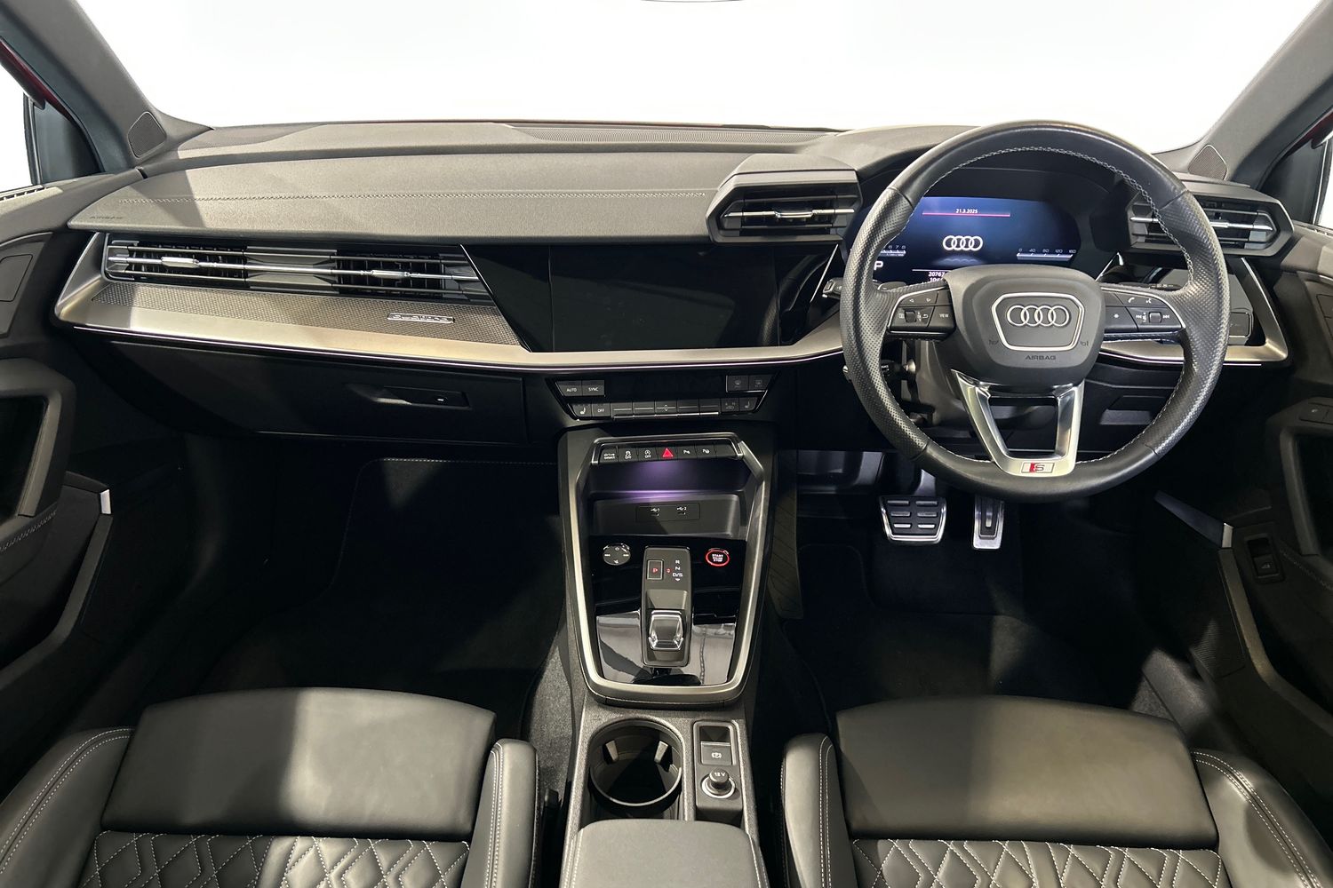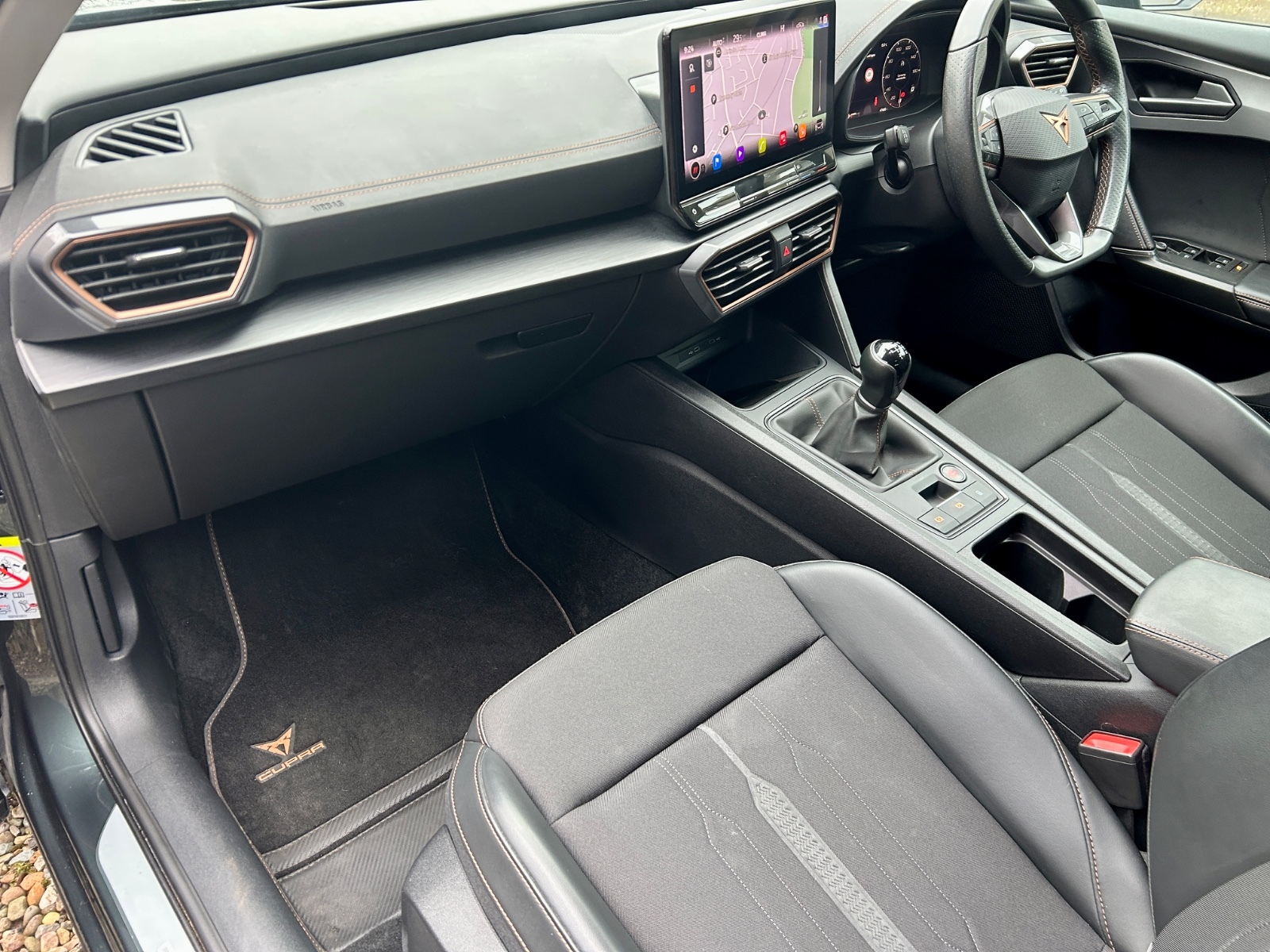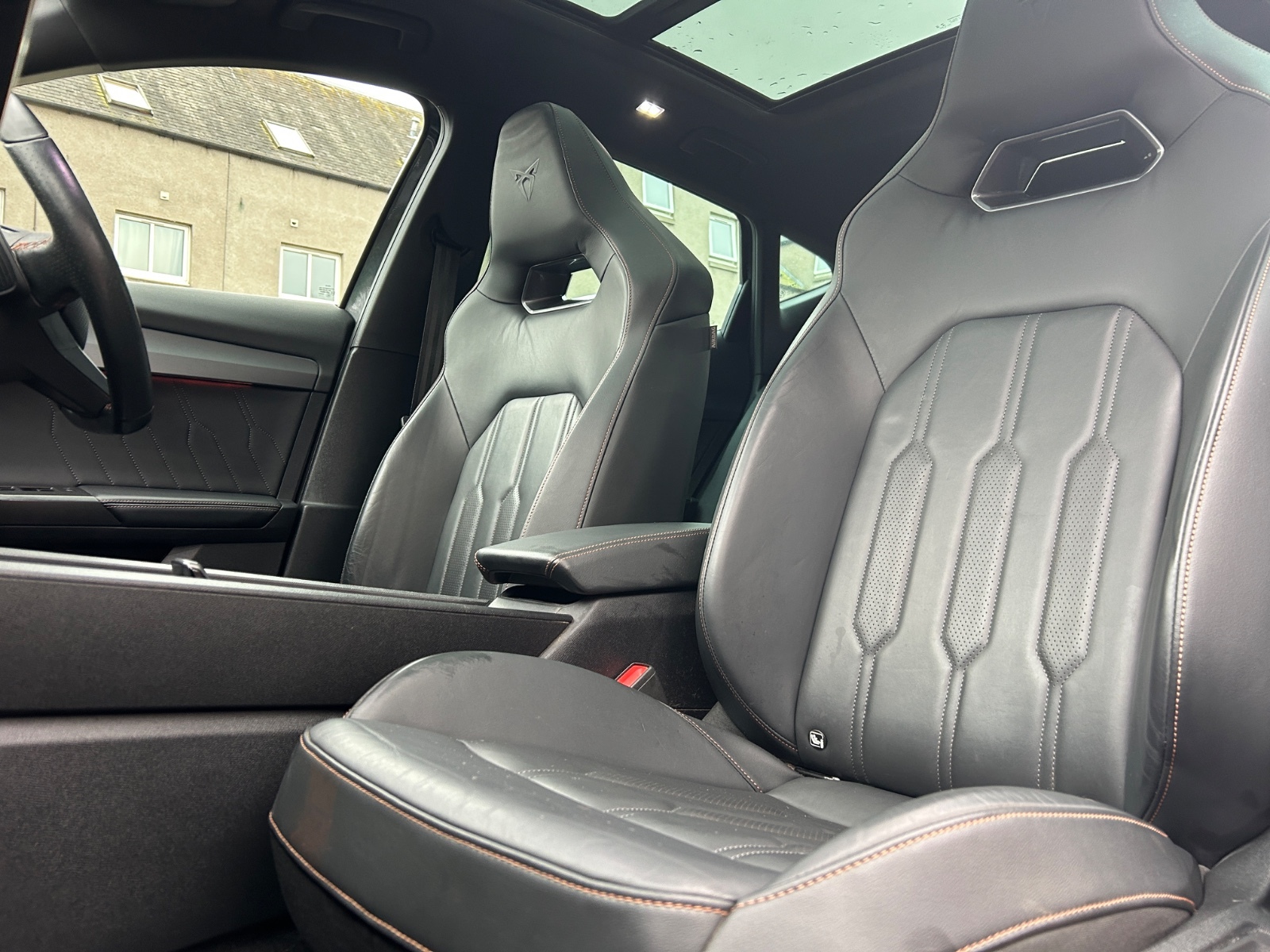 "Black artificial leather dashboard with grey stitching",