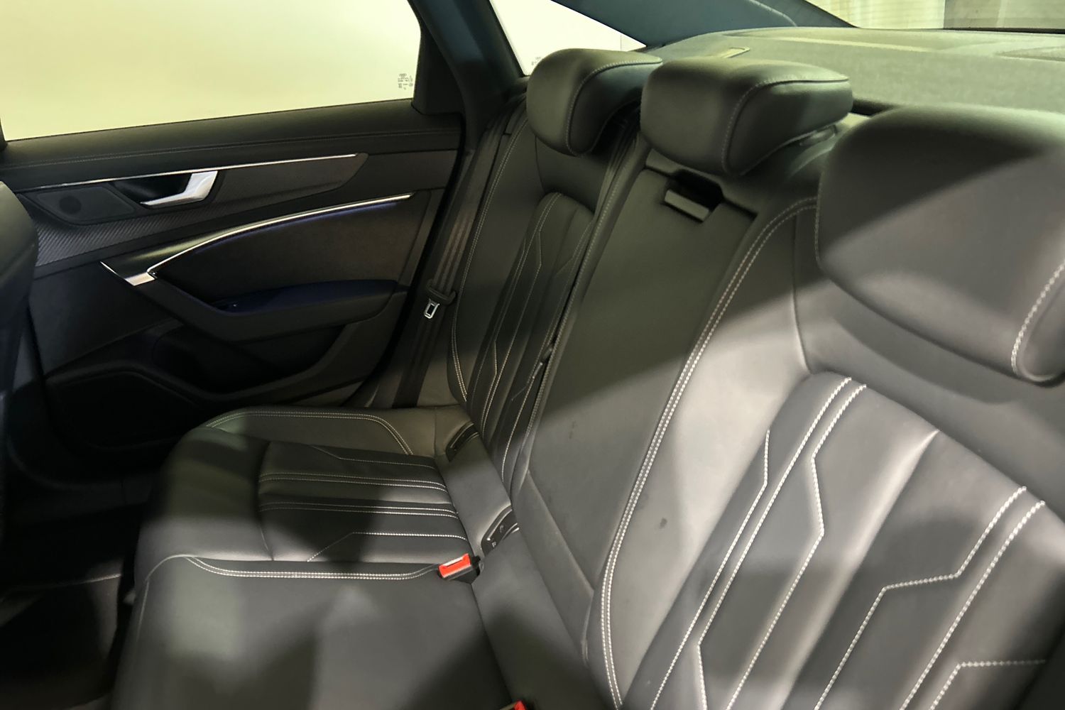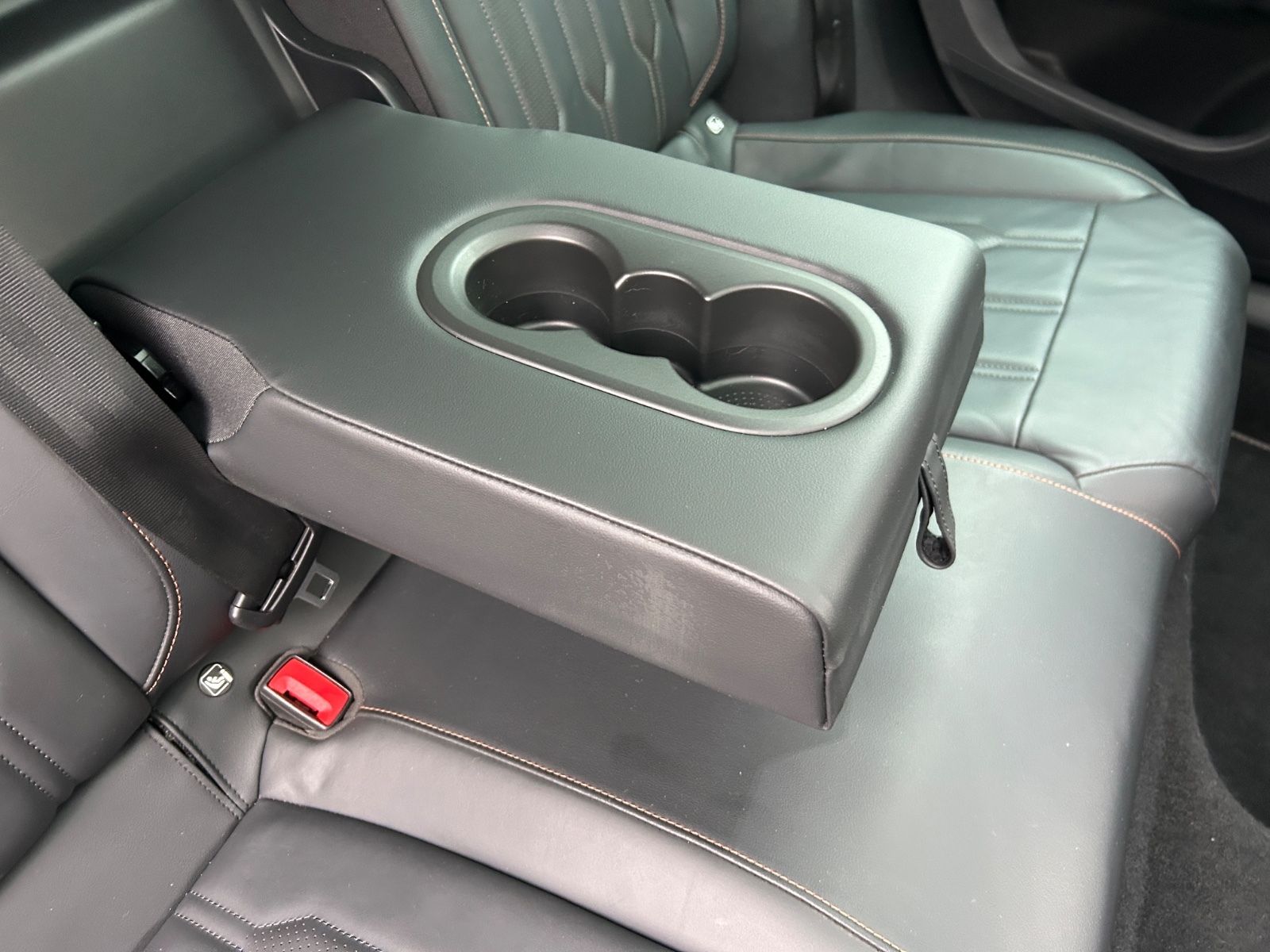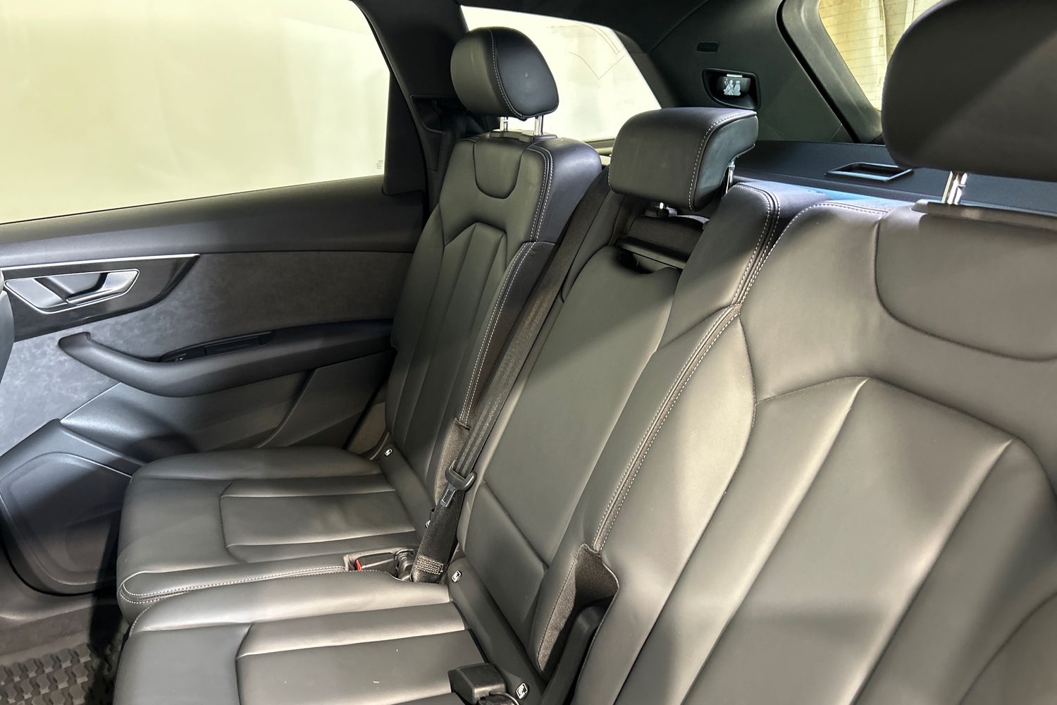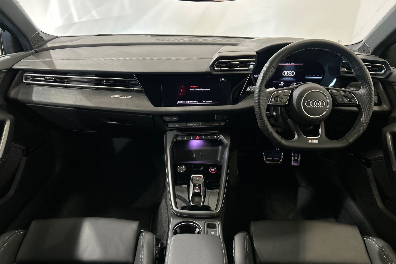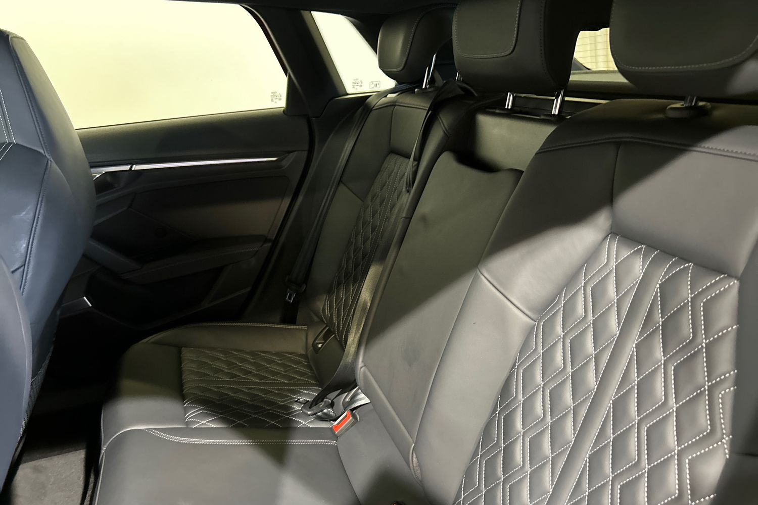 "Black artificial leather dashboard with grey stitching",