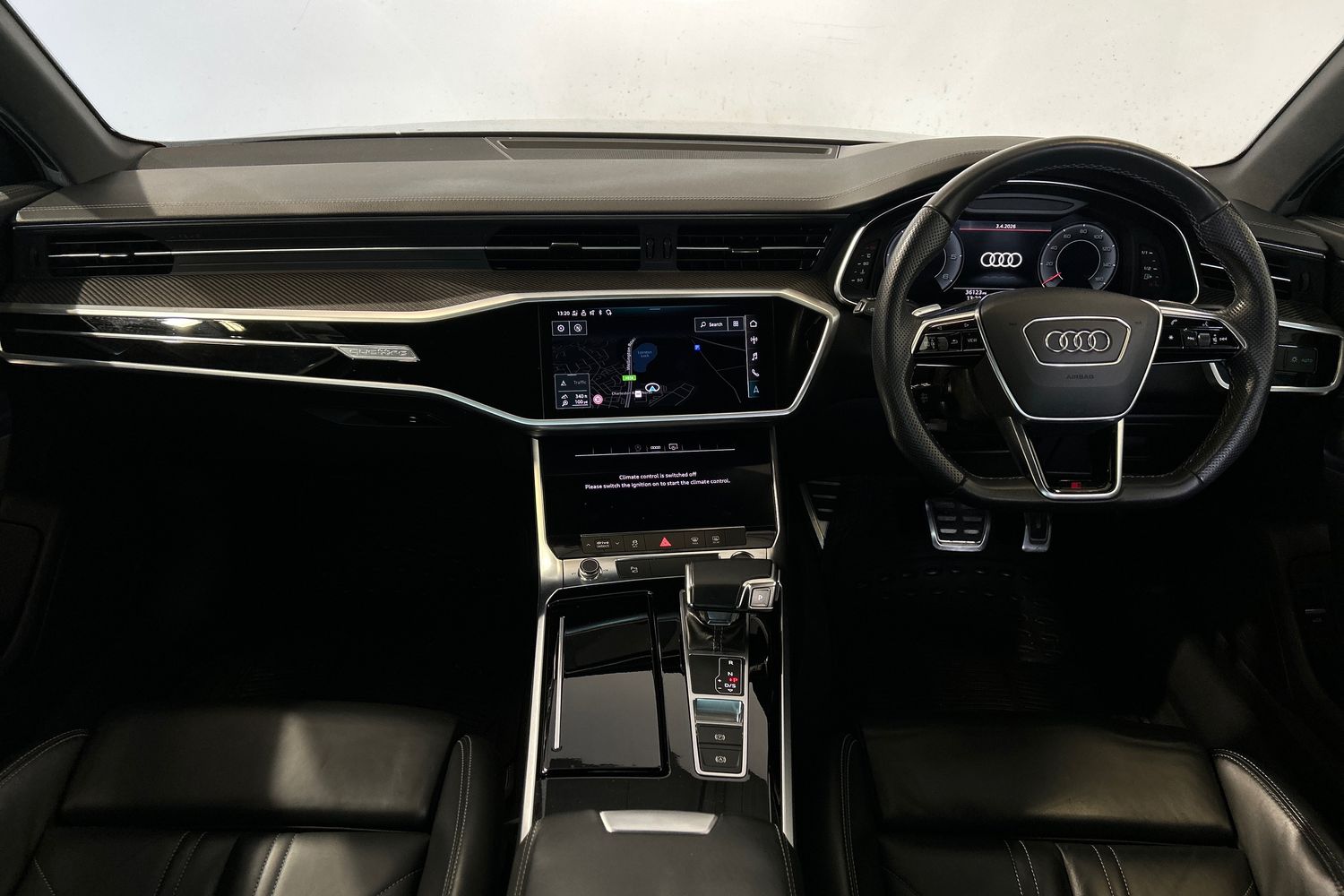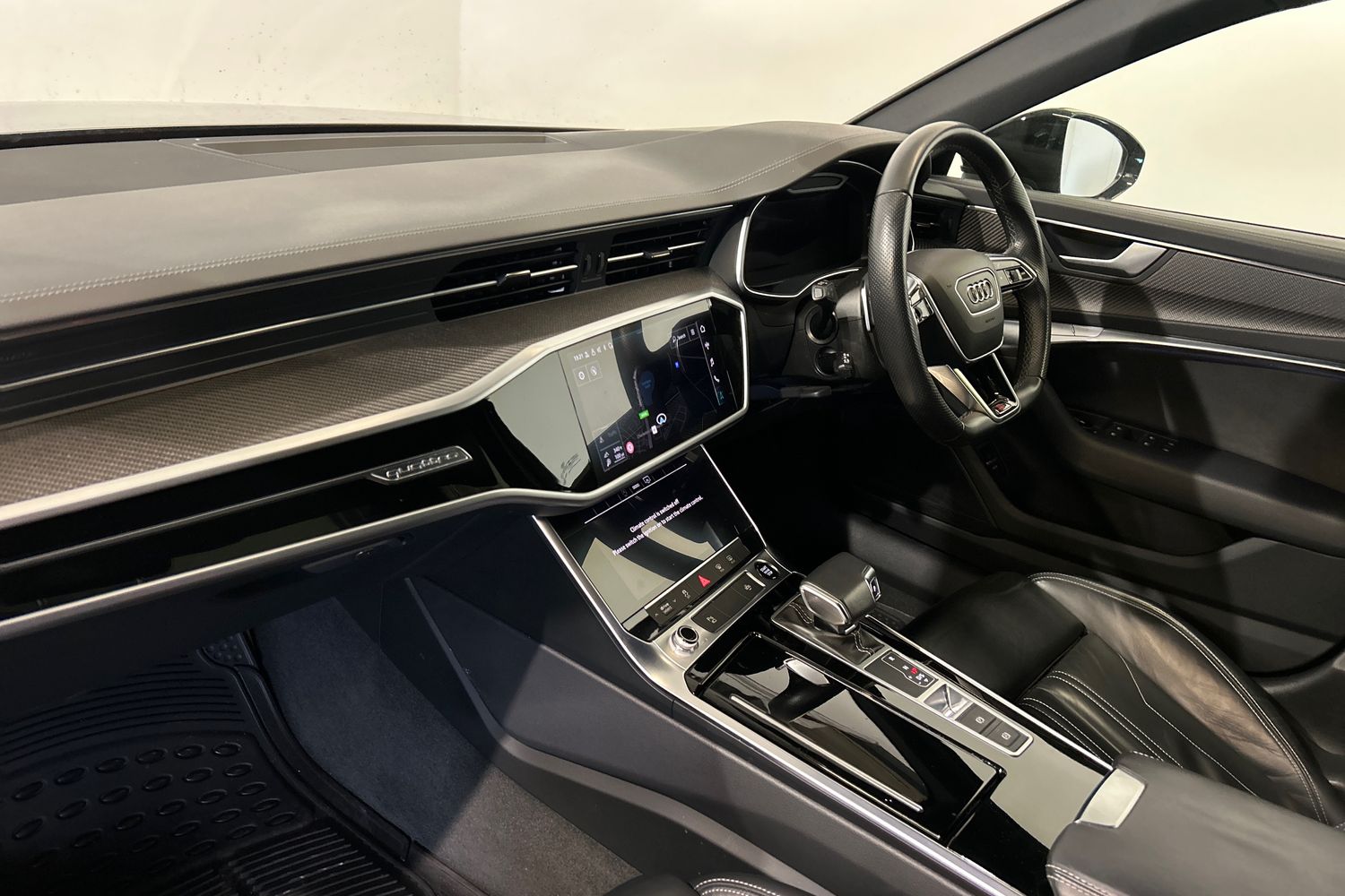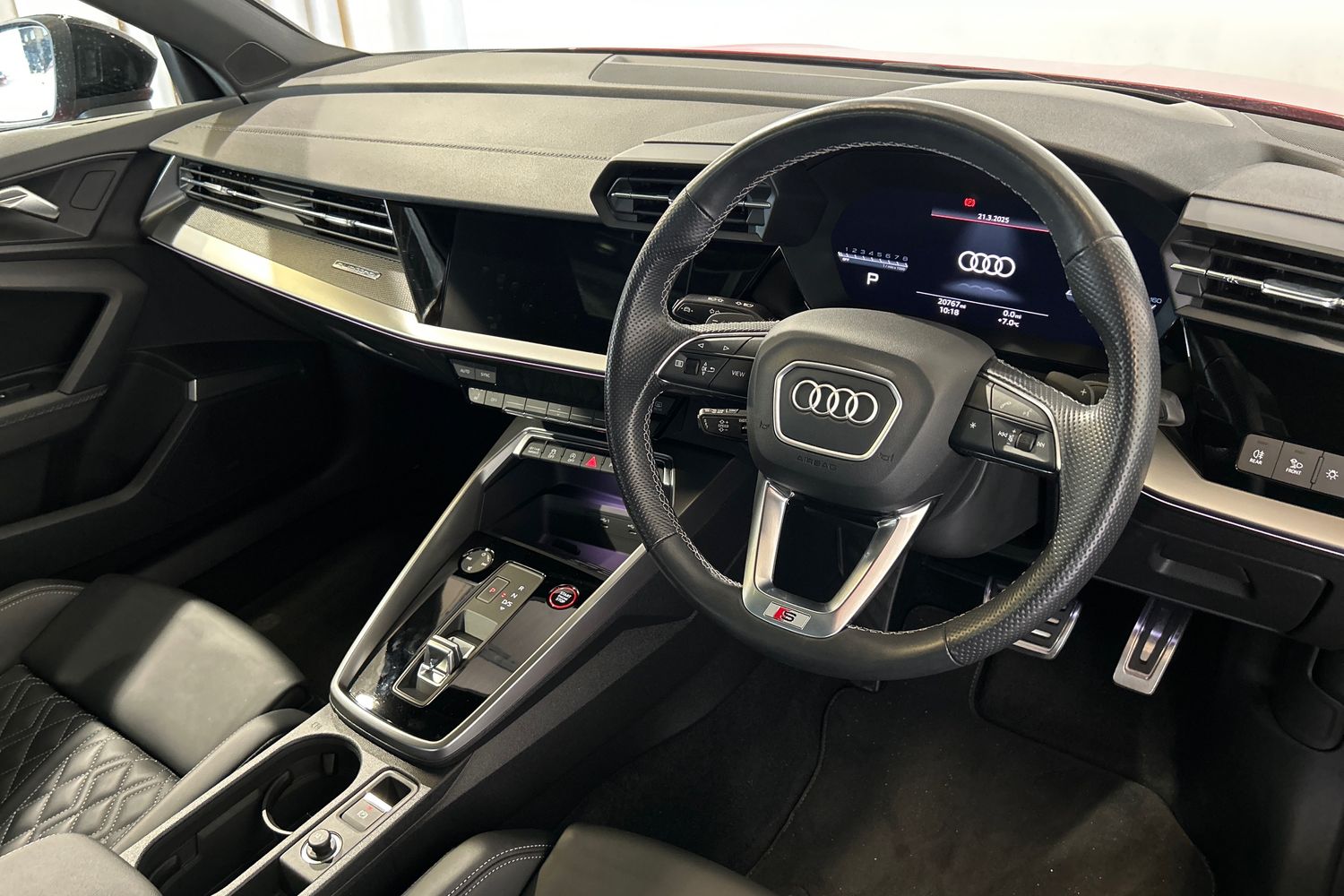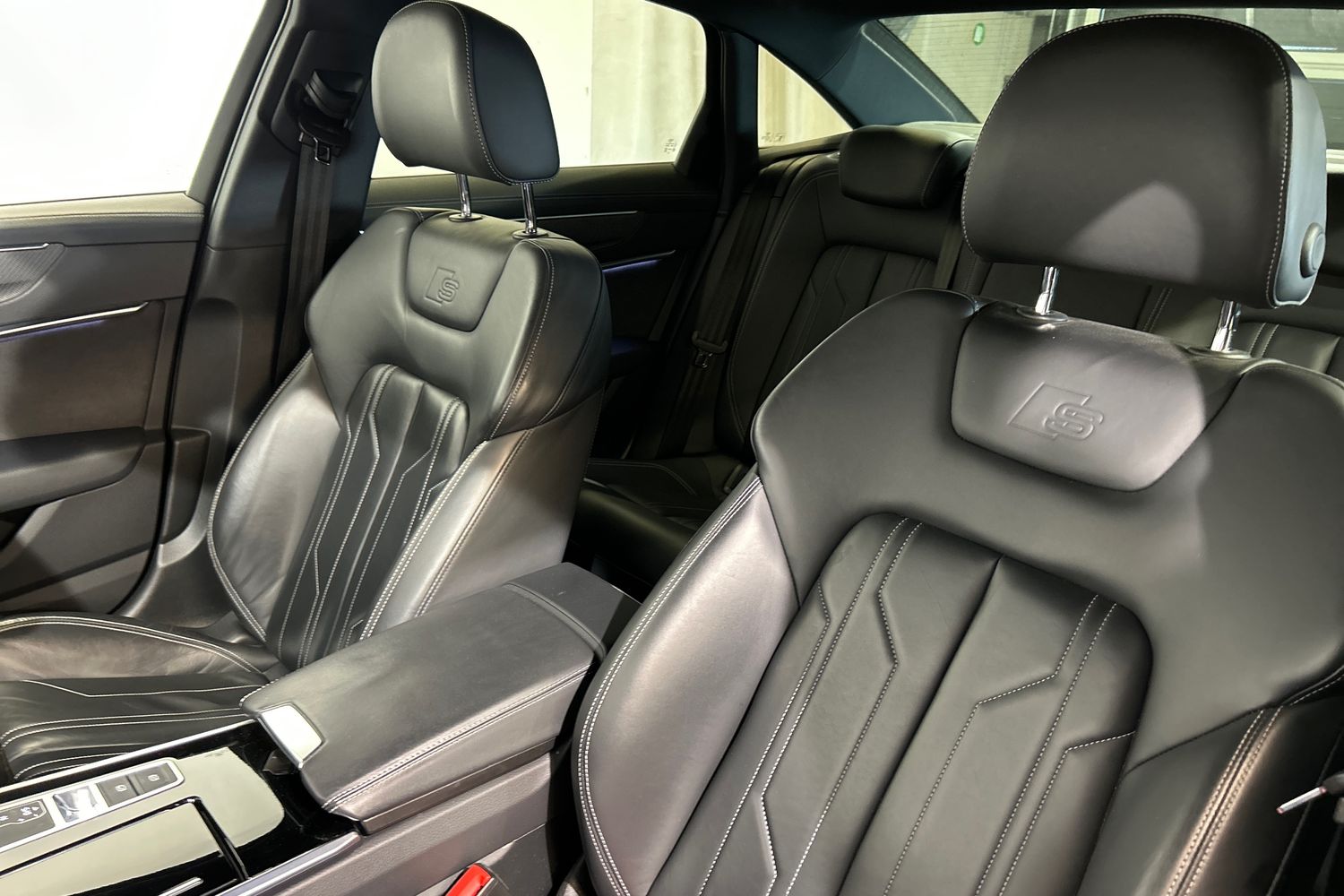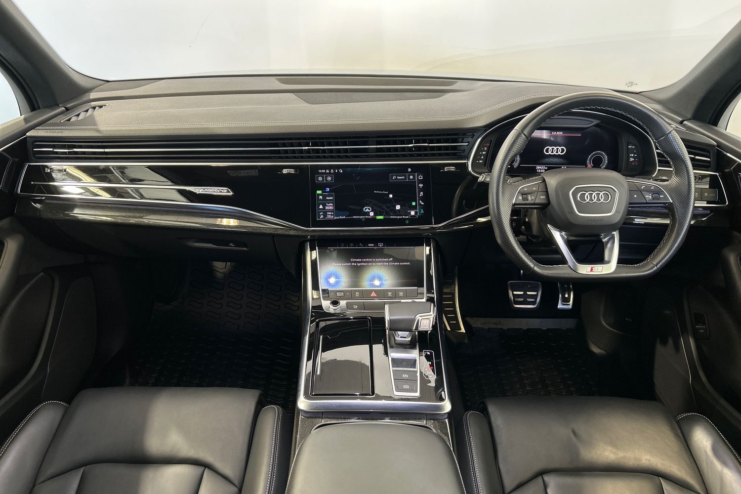 "Black artificial leather dashboard with grey stitching",