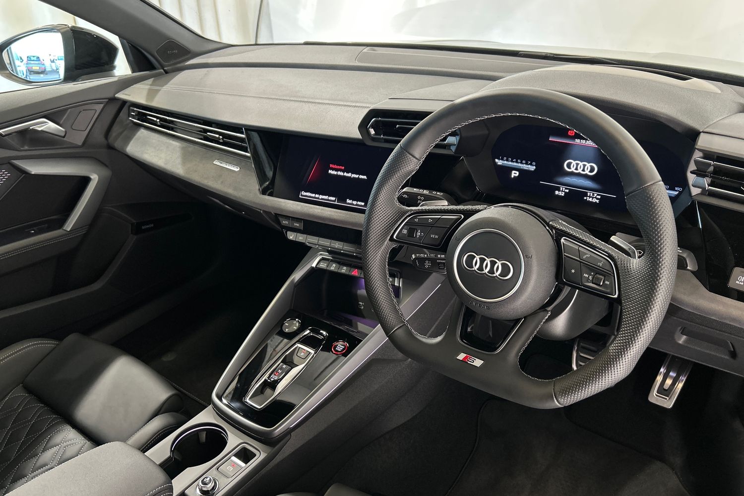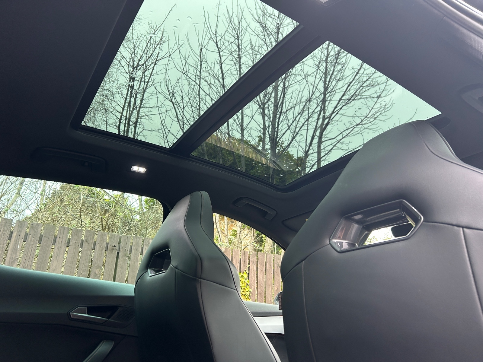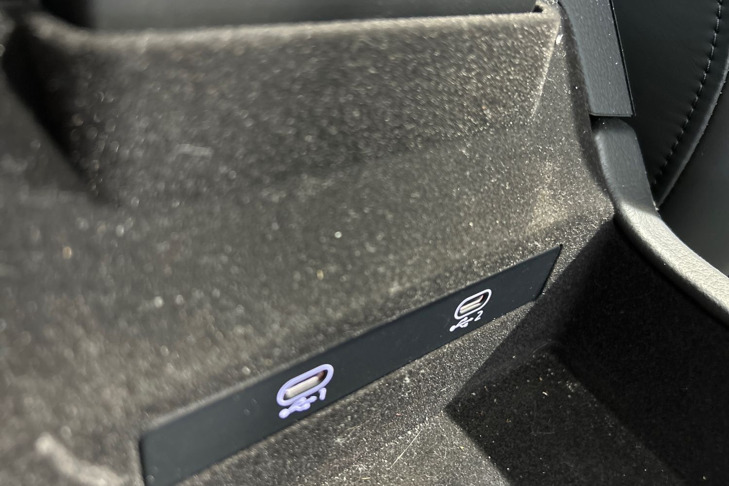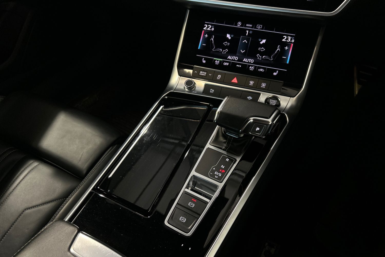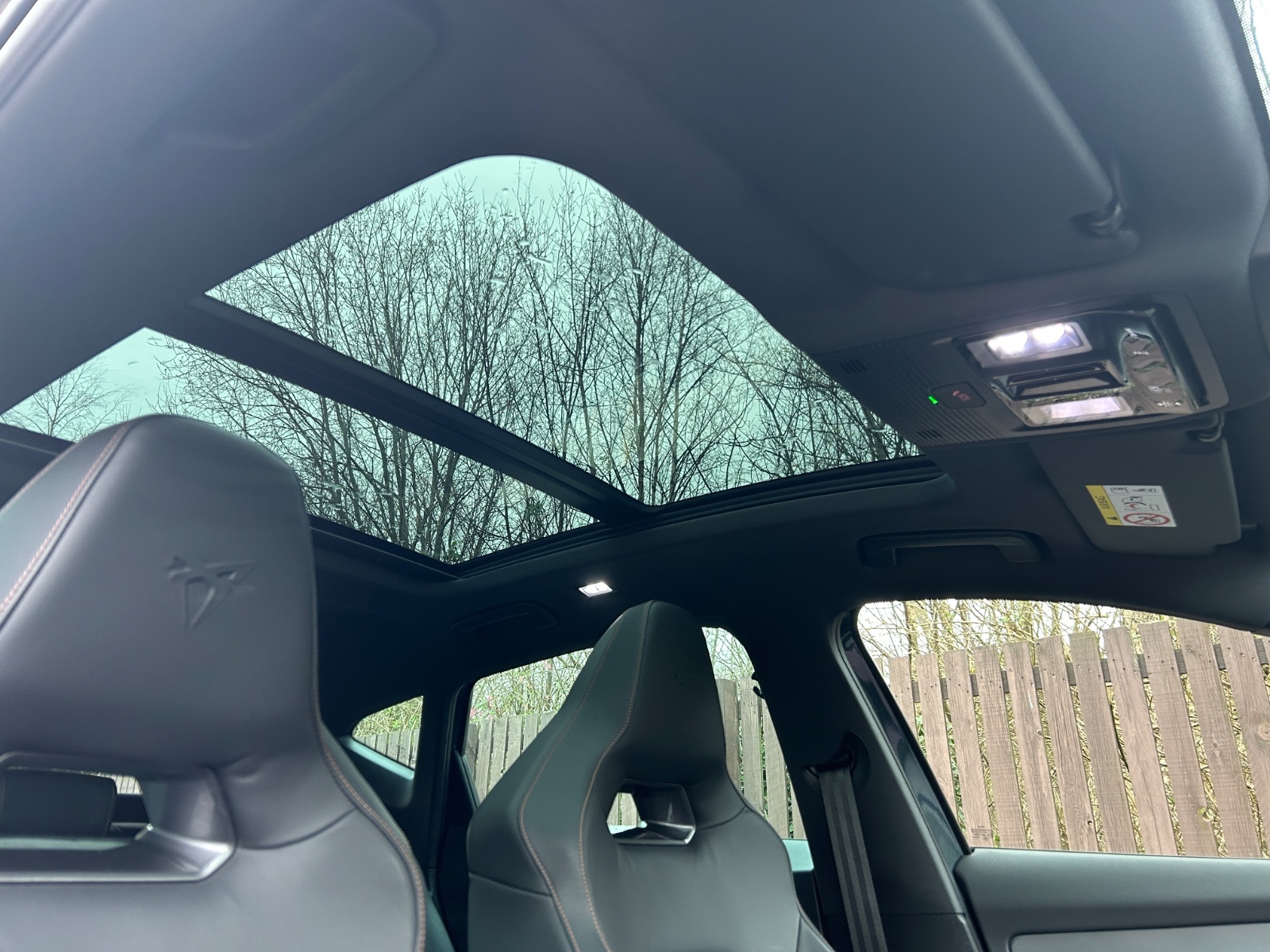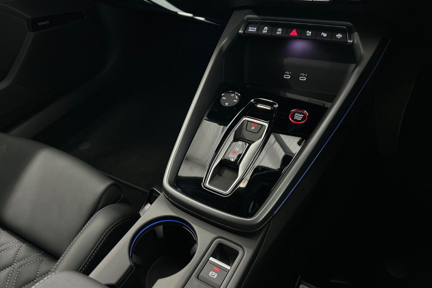 "Black artificial leather dashboard with grey stitching",