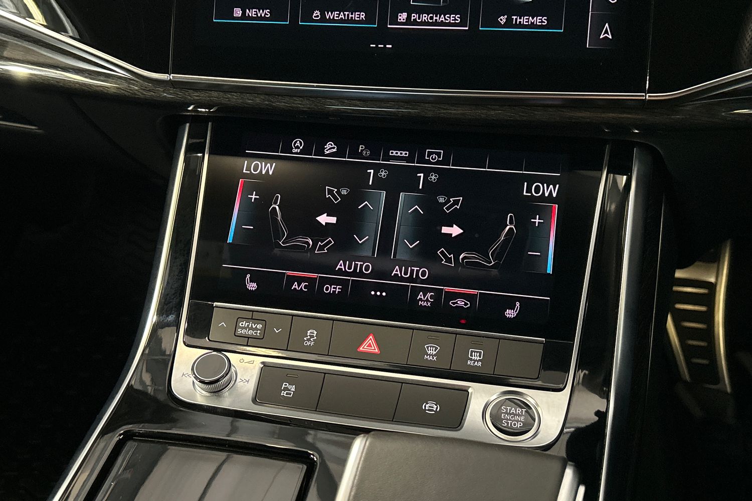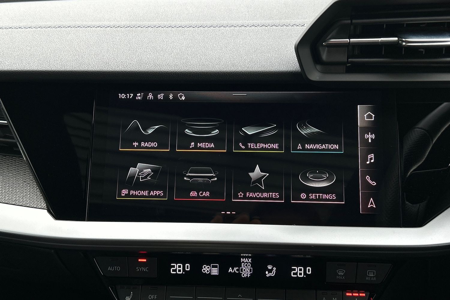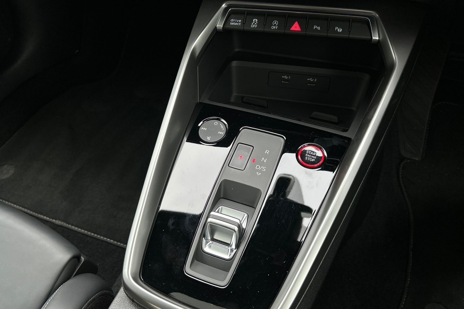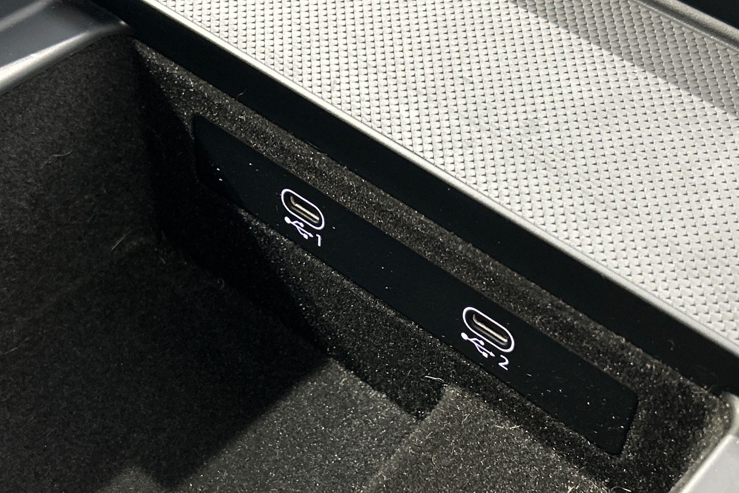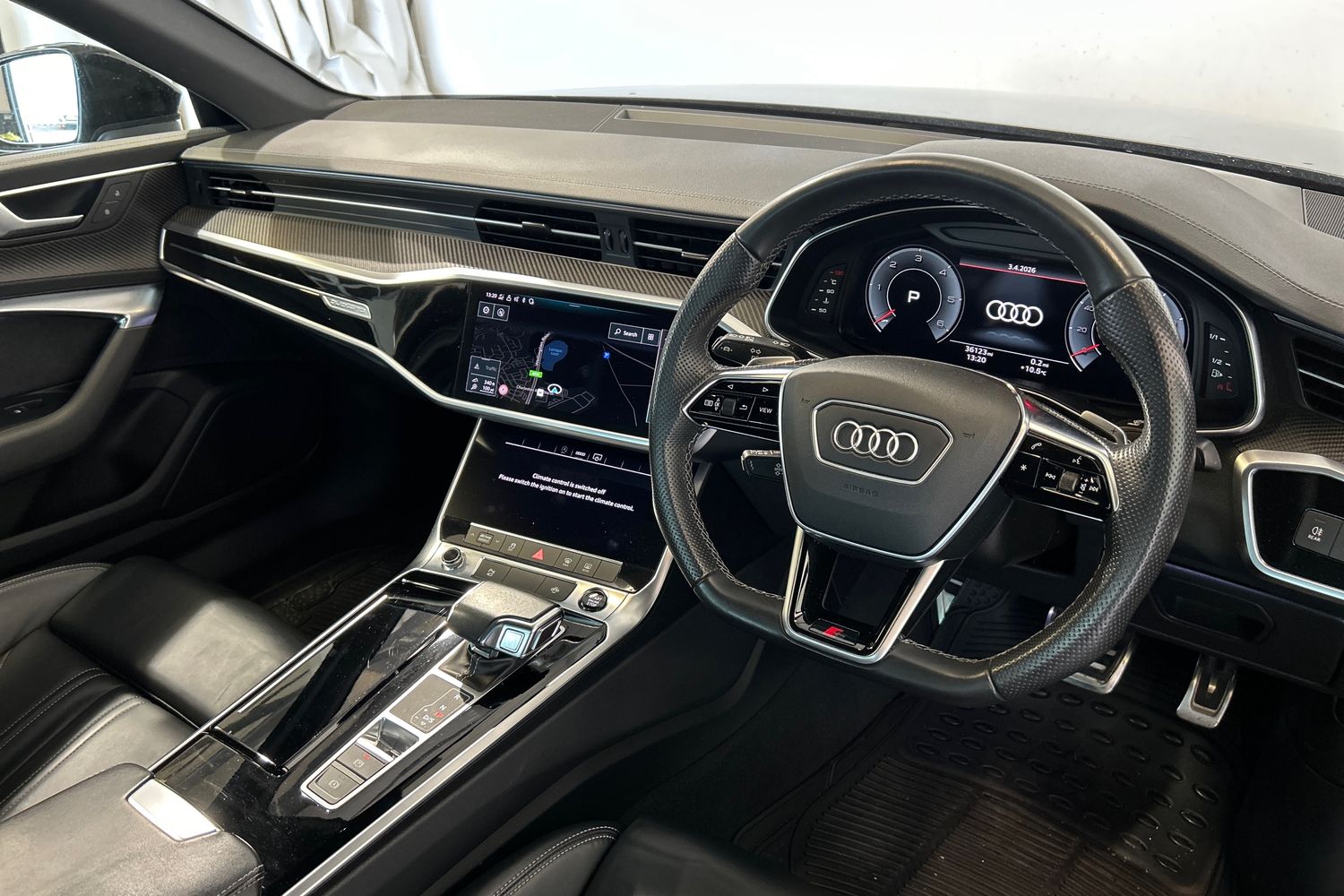 "Black artificial leather dashboard with grey stitching",