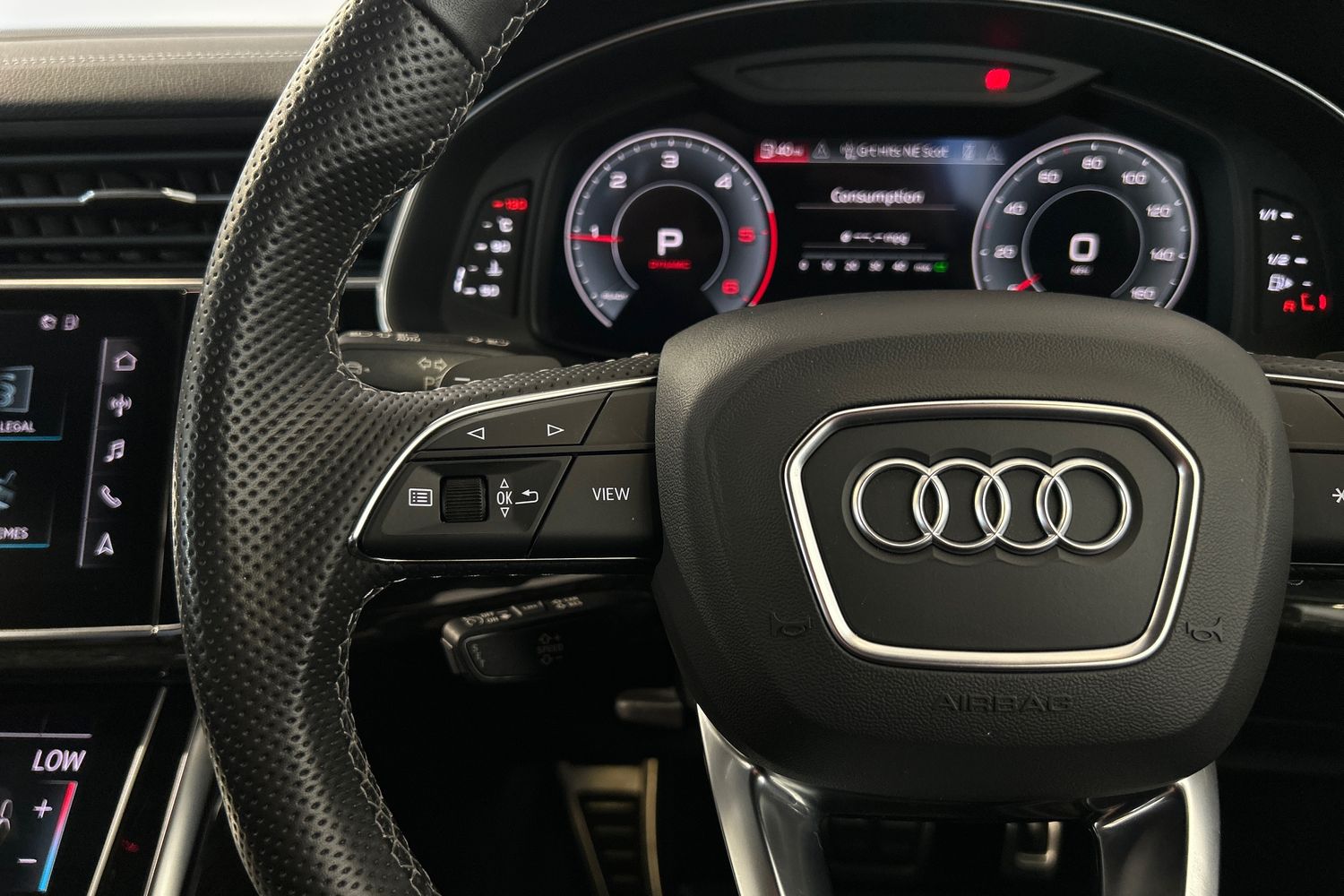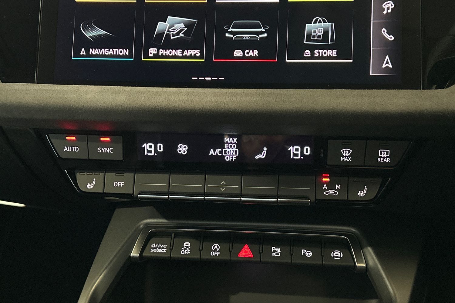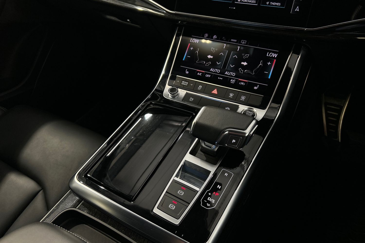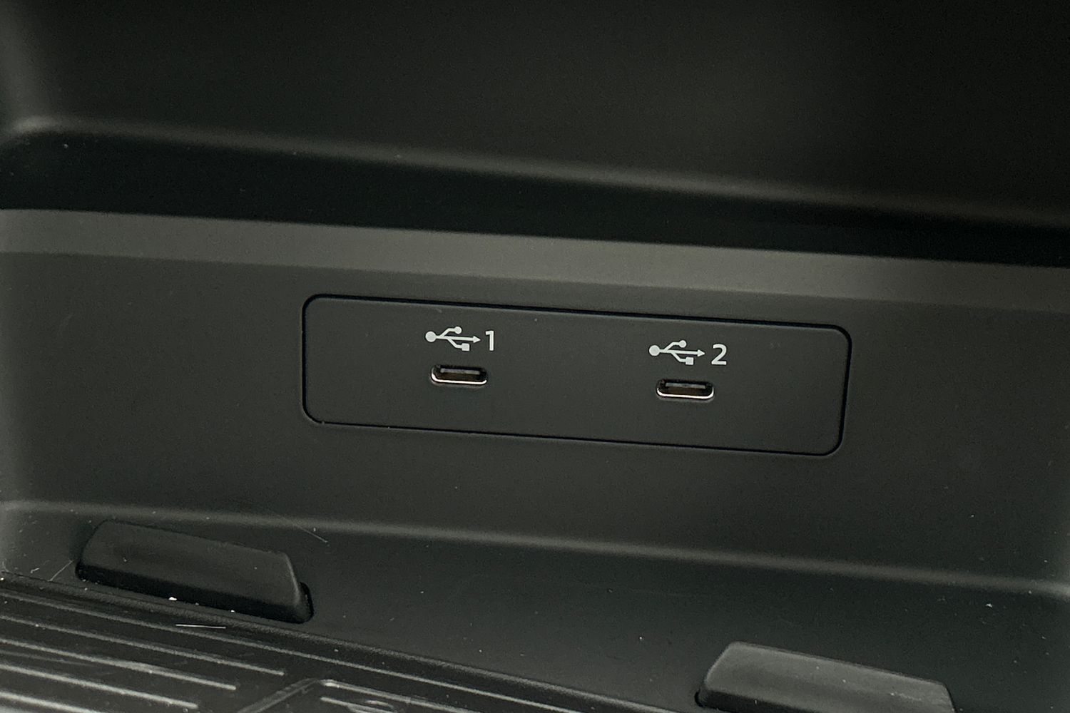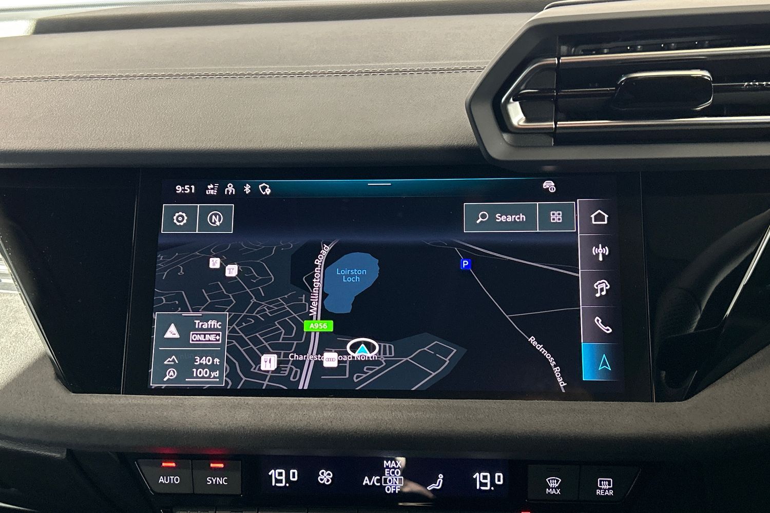 "Black artificial leather dashboard with grey stitching",