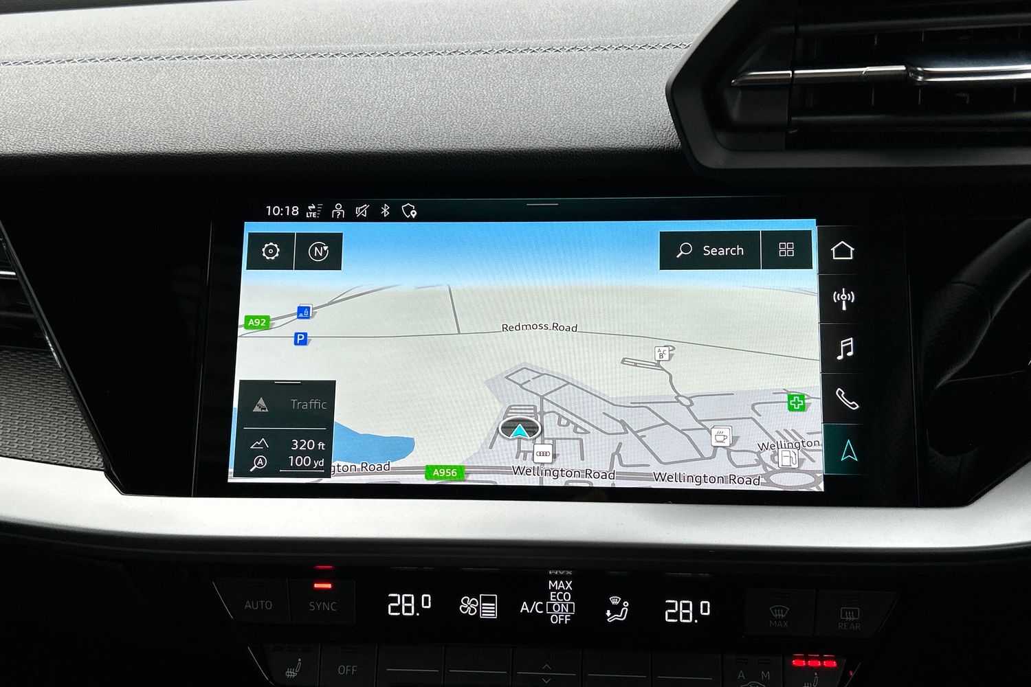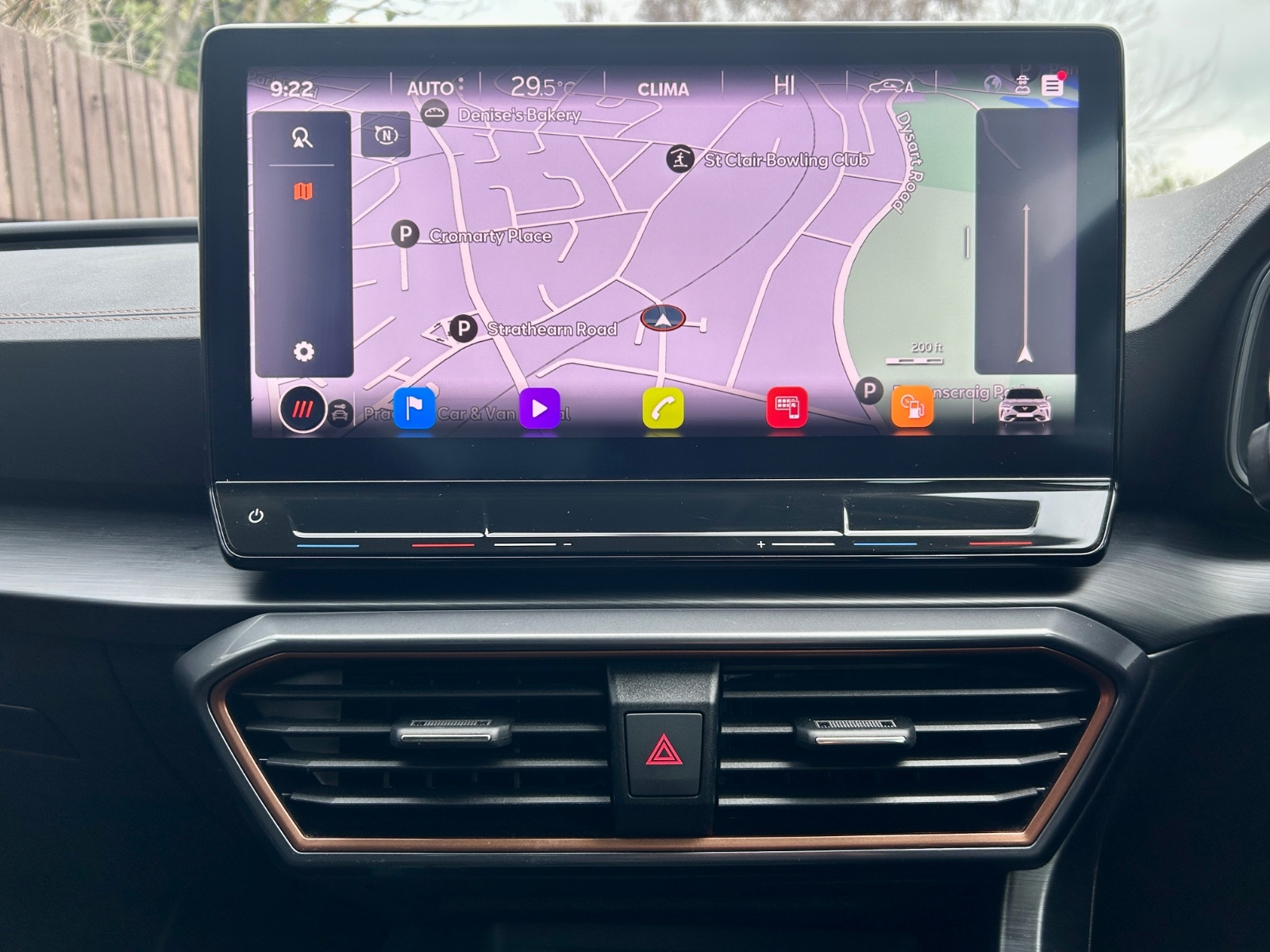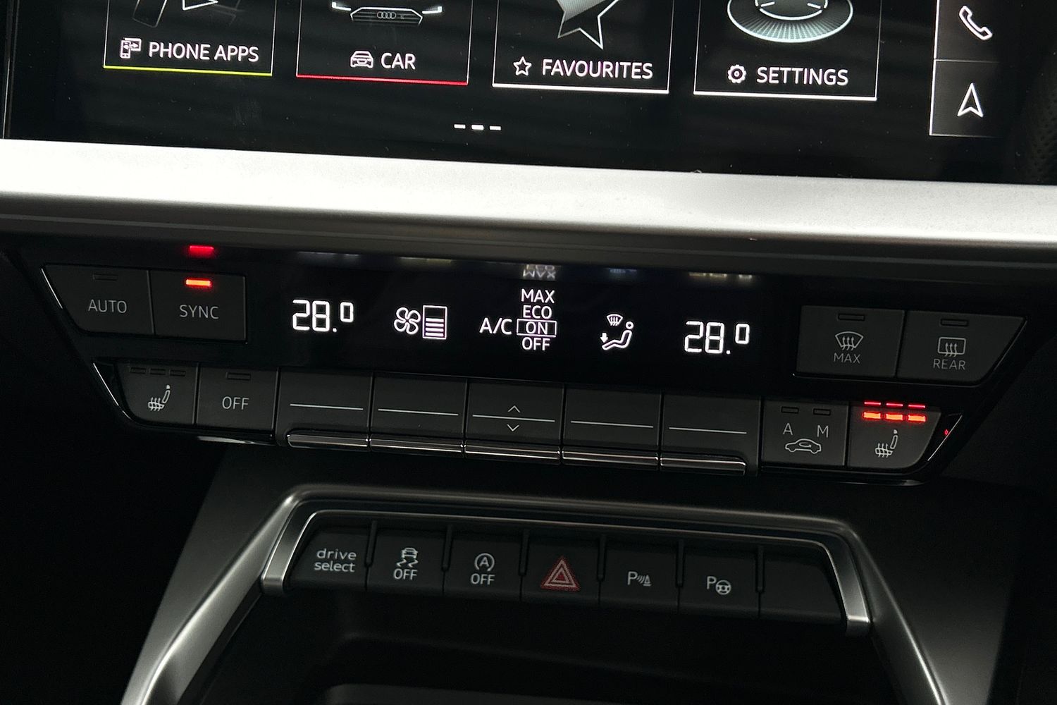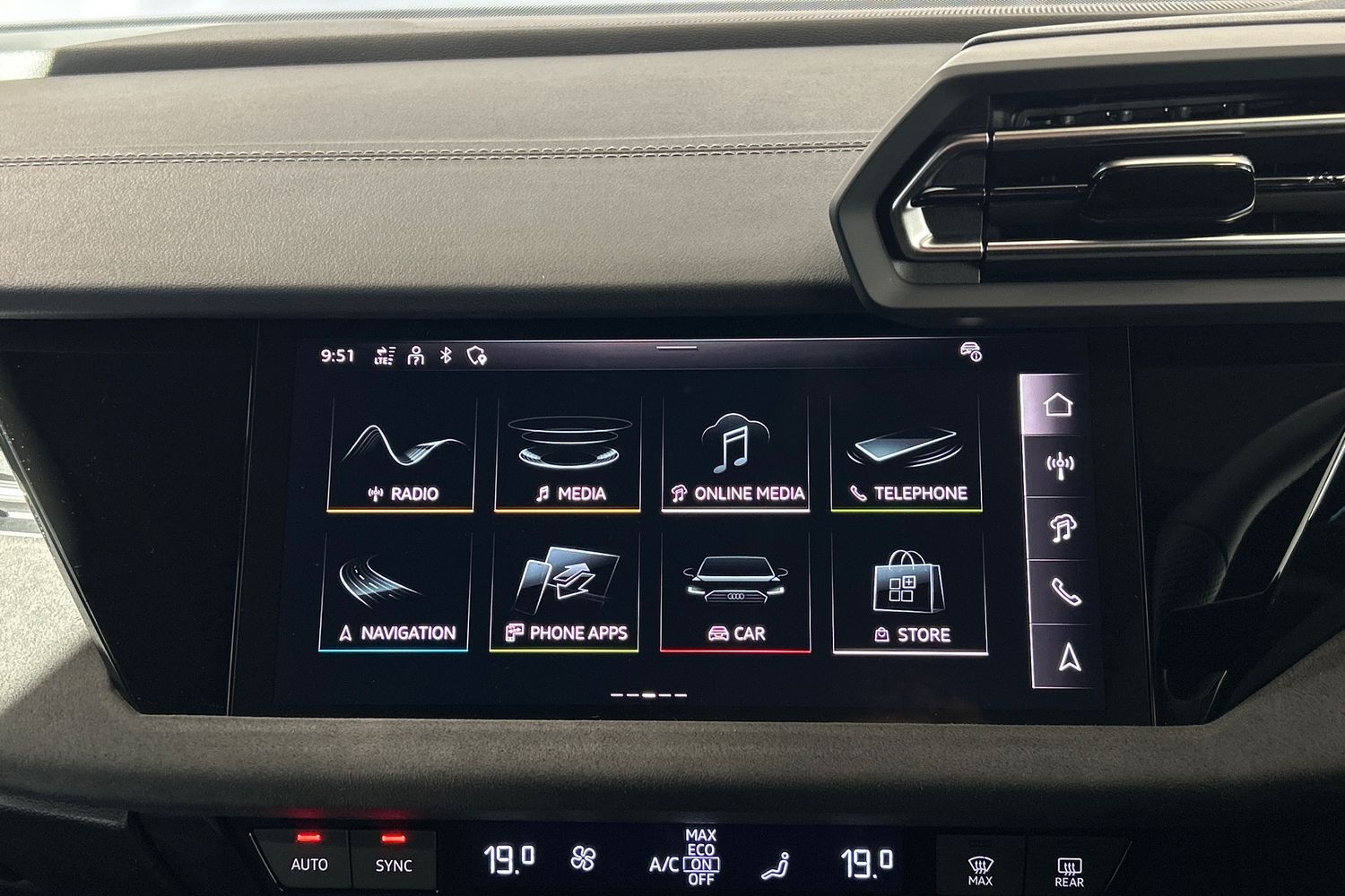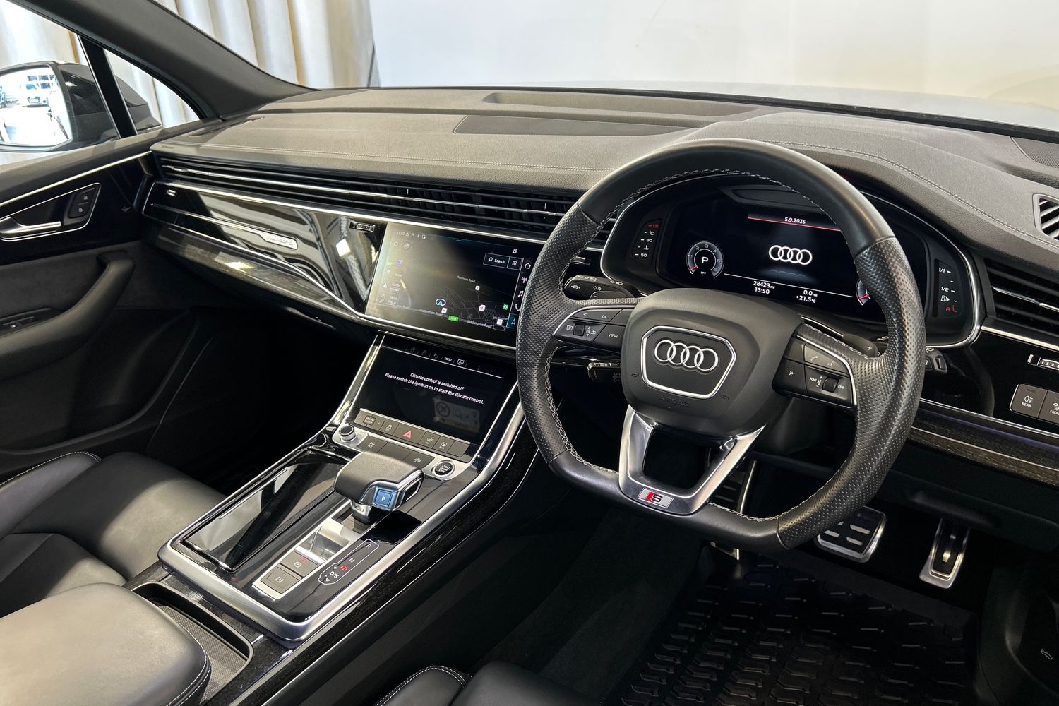 "Black artificial leather dashboard with grey stitching",