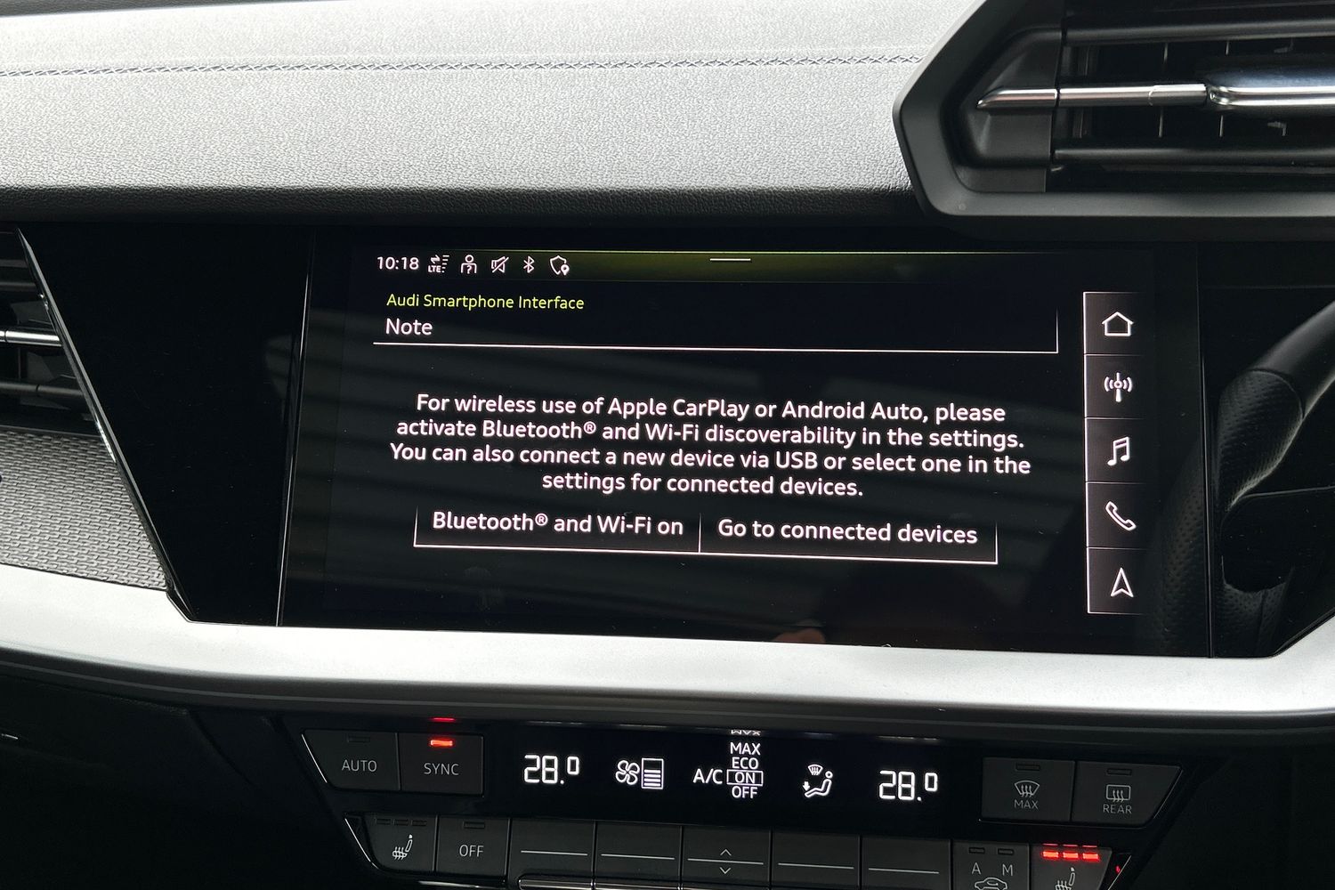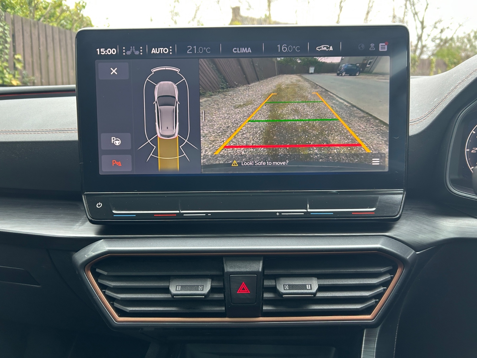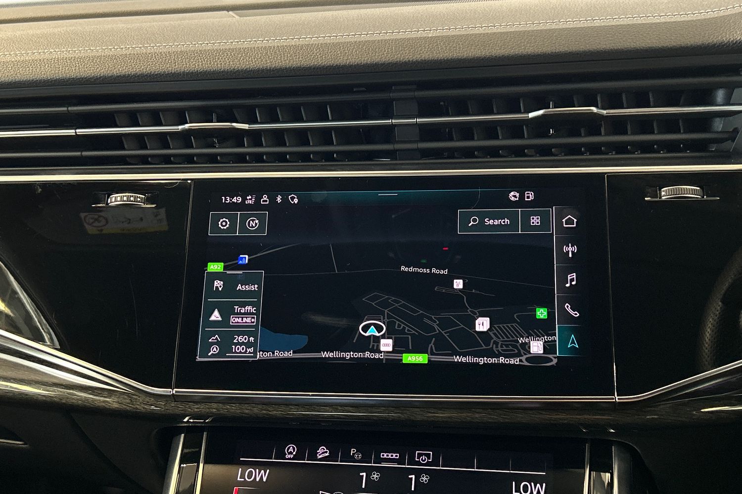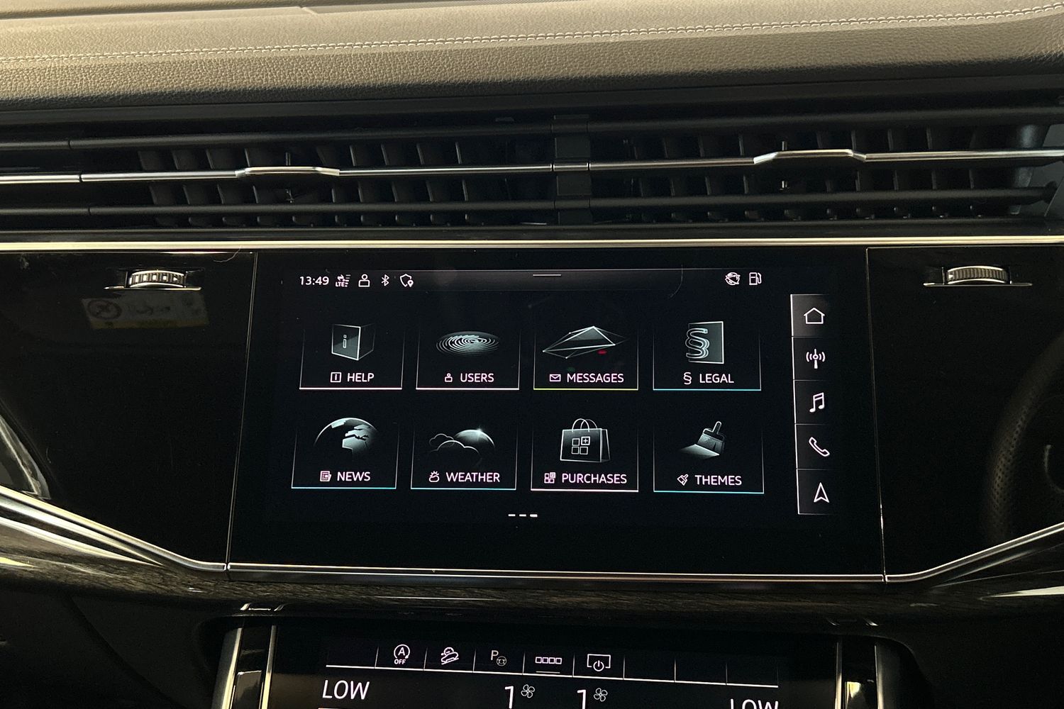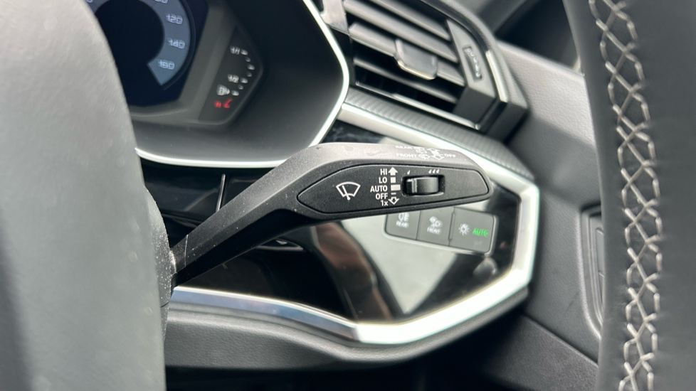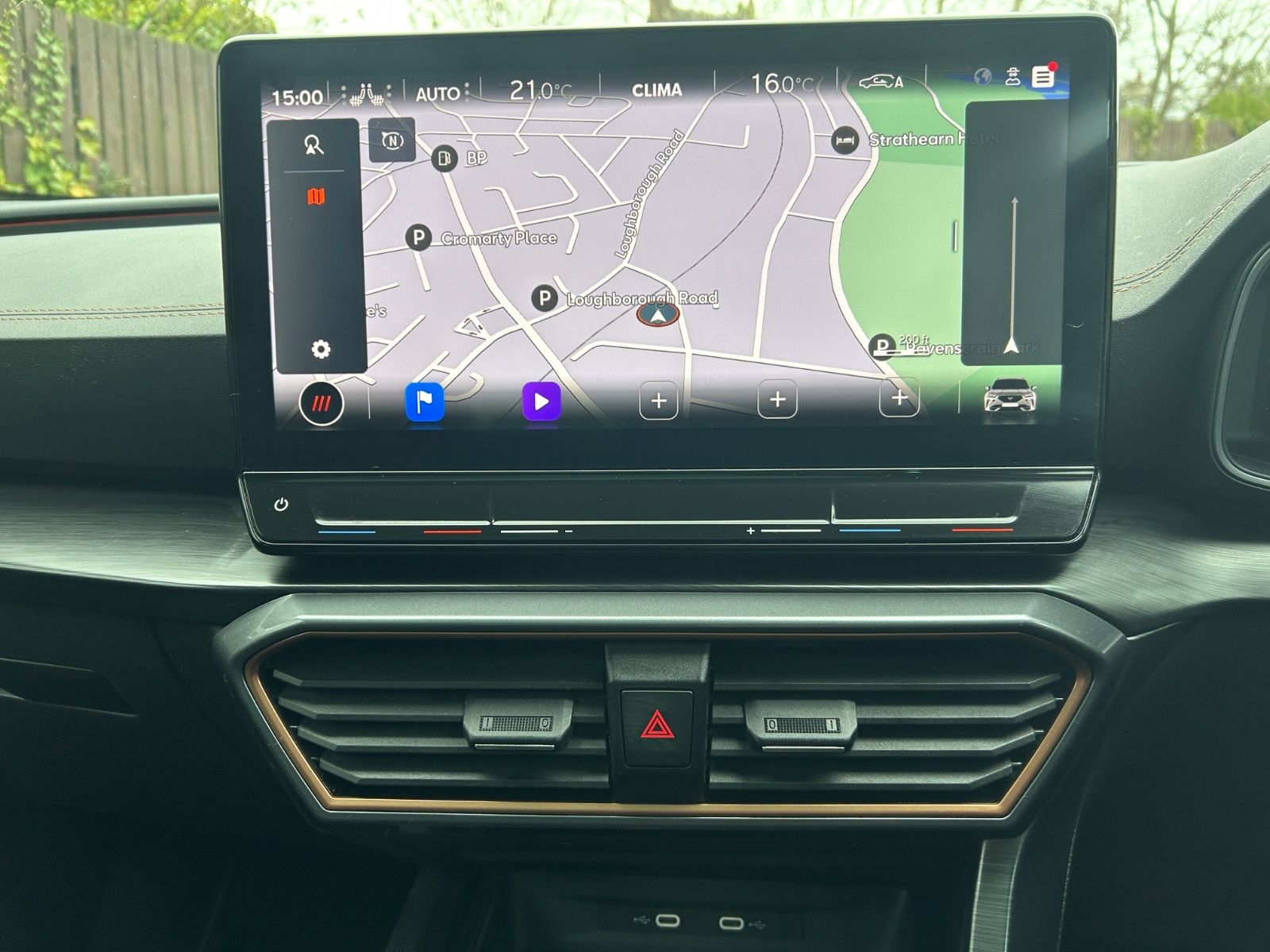 "Black artificial leather dashboard with grey stitching",