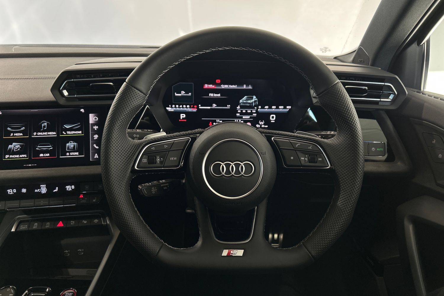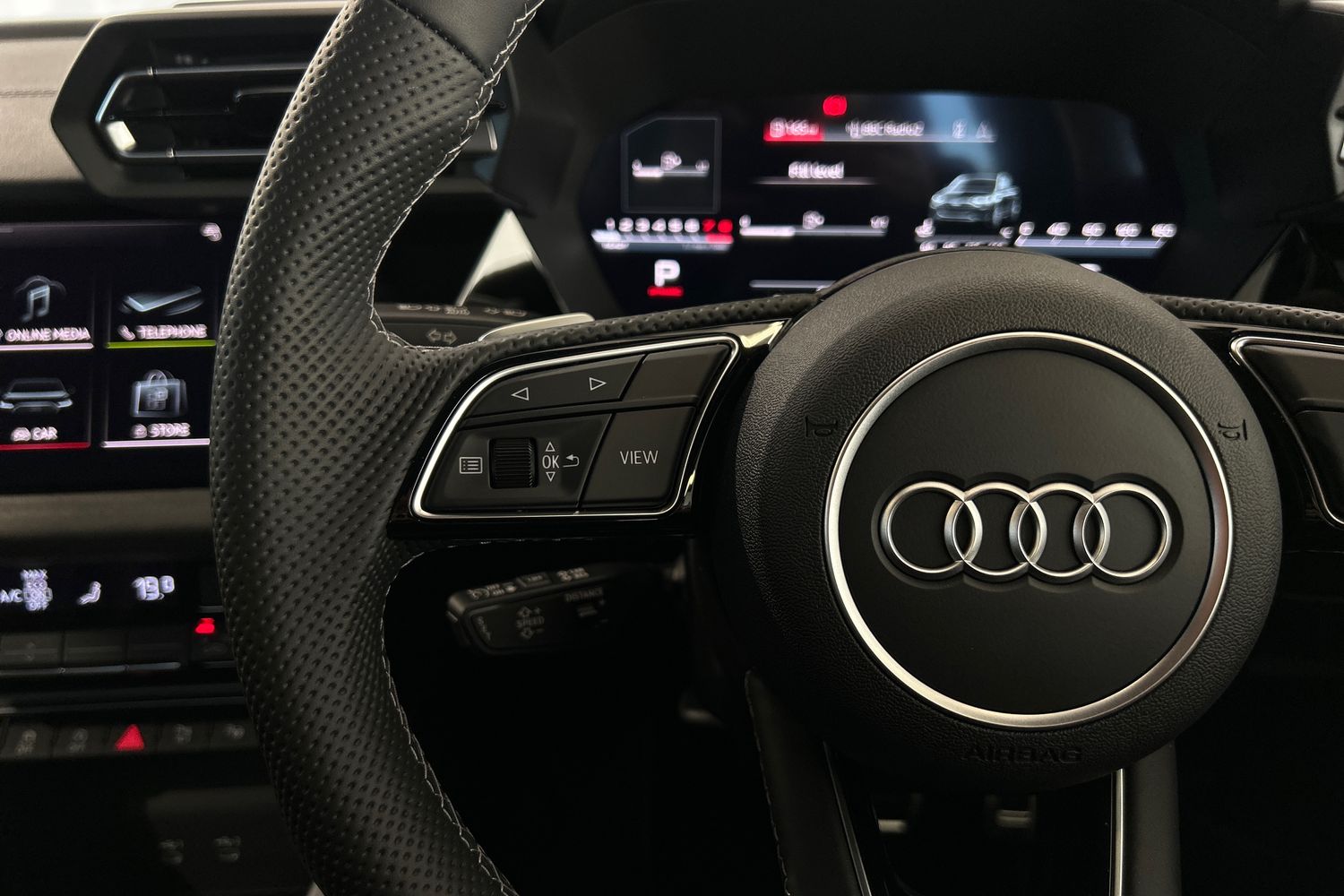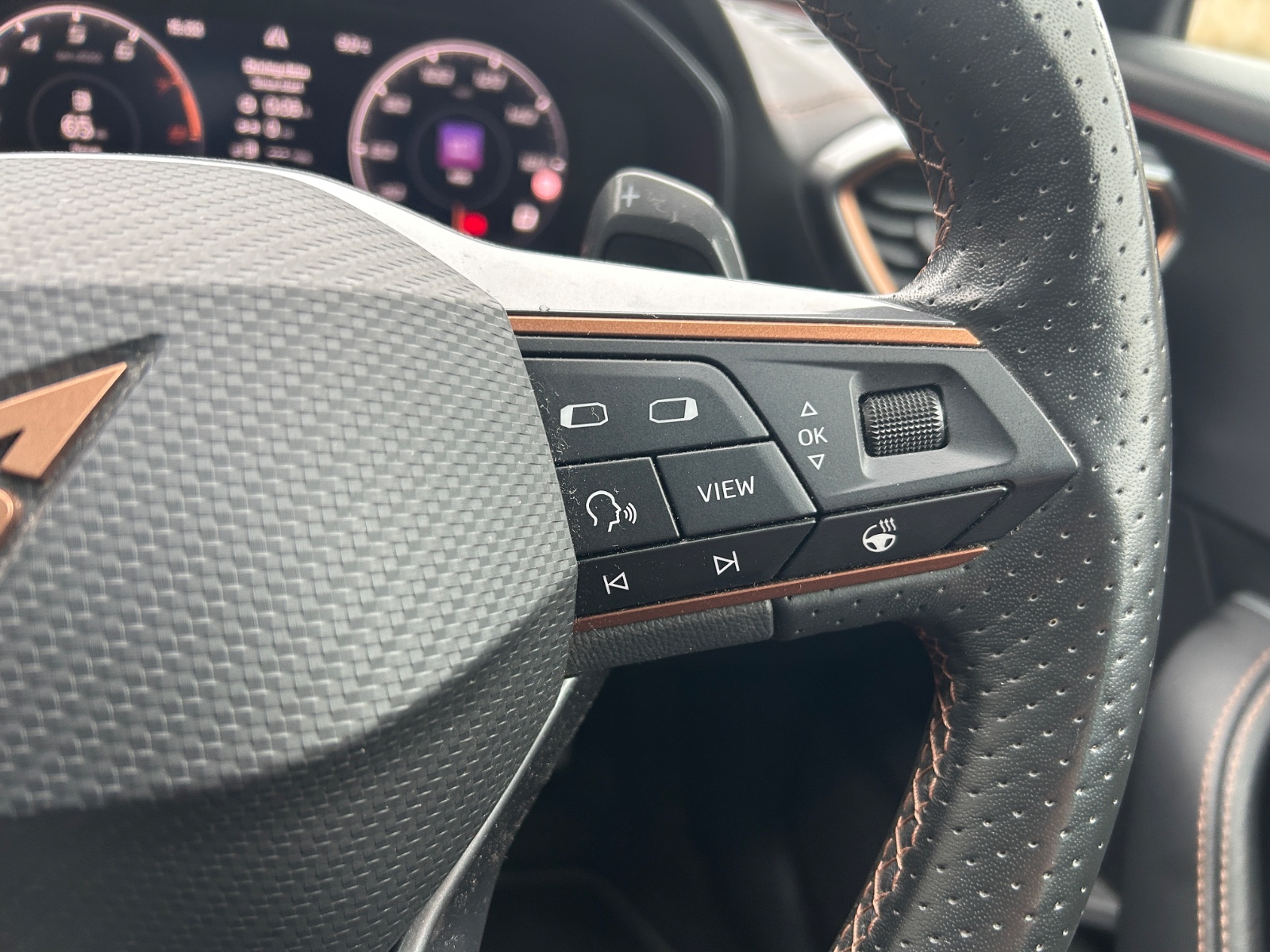 "3-spoke leather heated sports multifunction steering wheel with paddles for recuperation level selection",