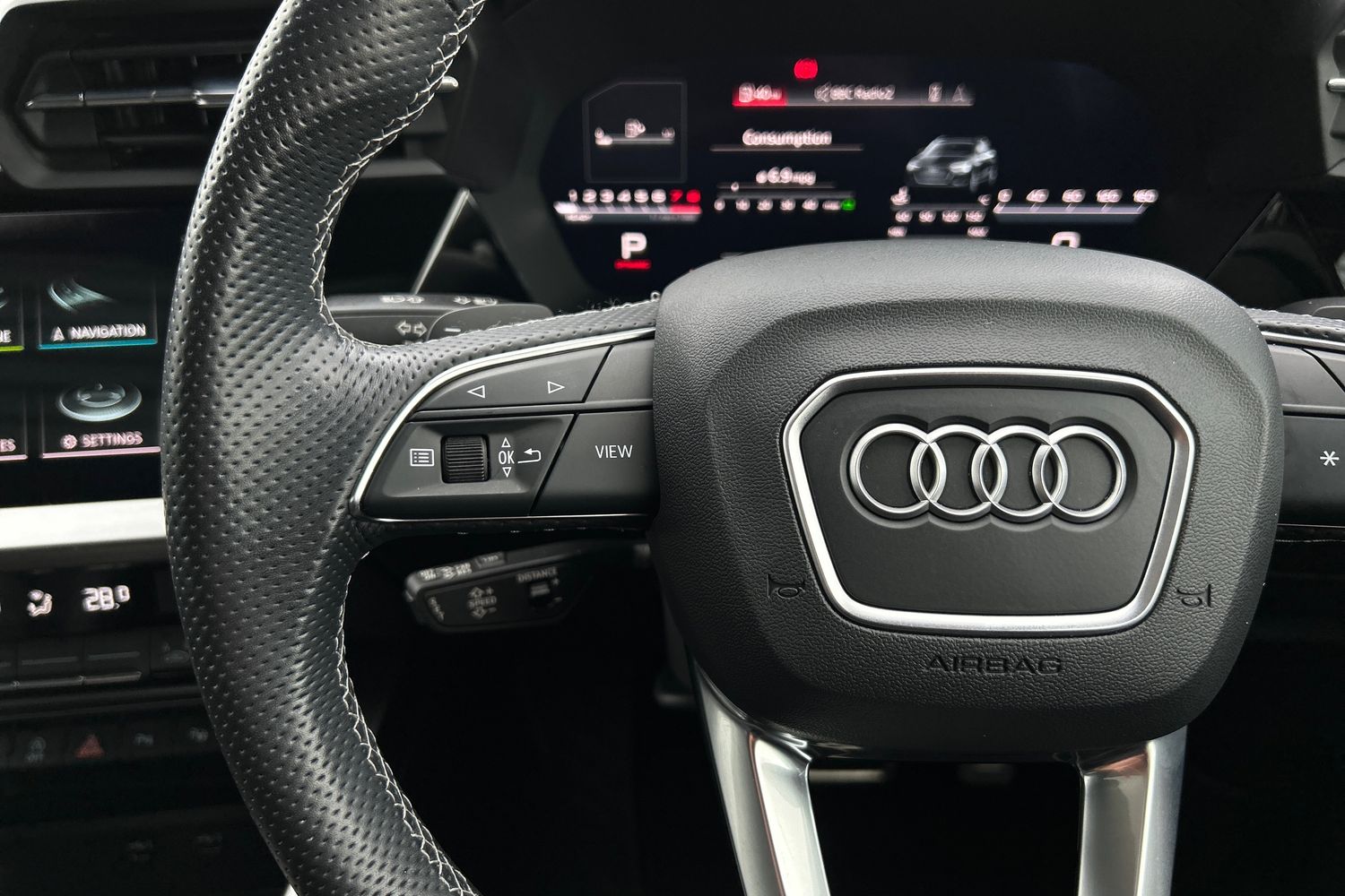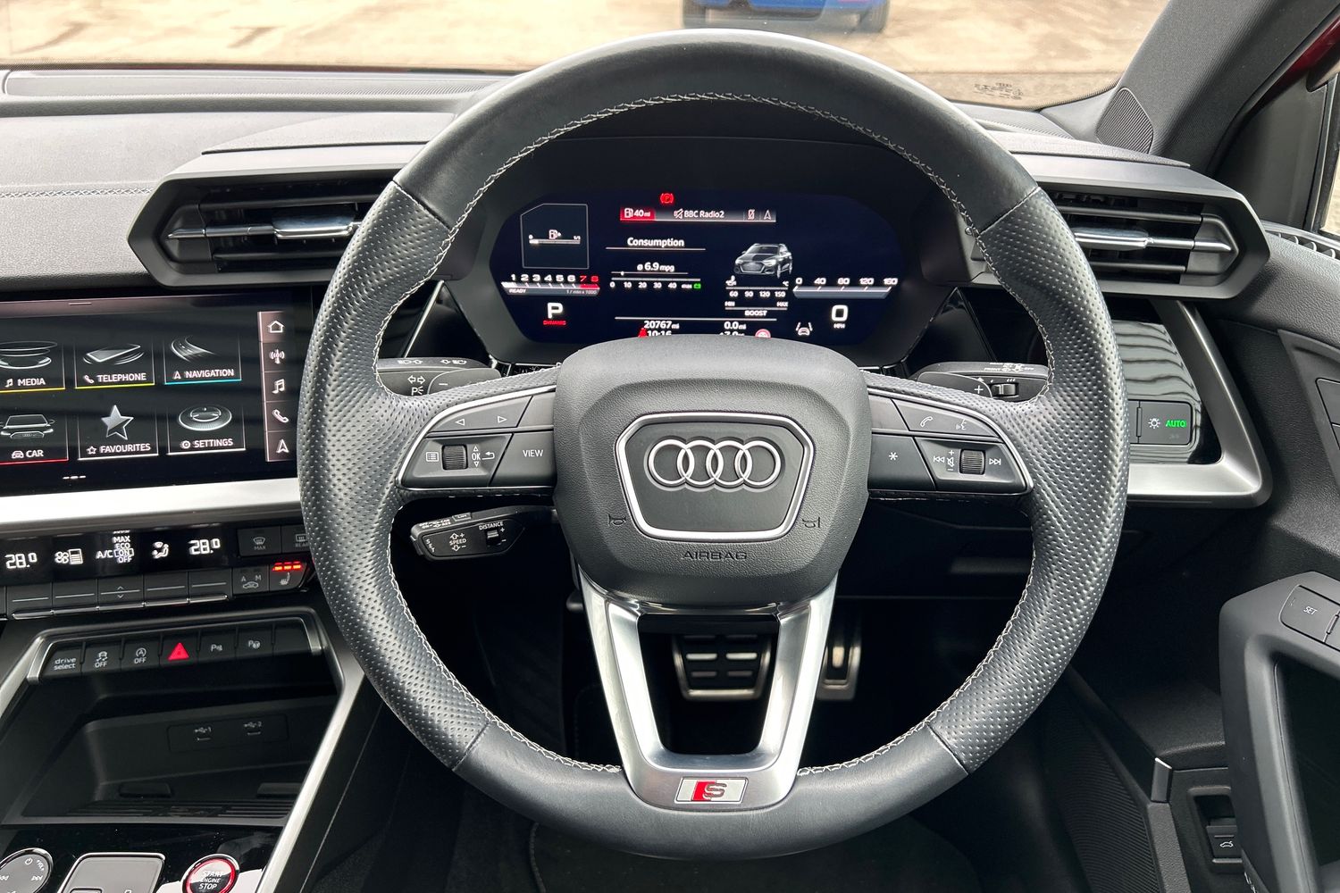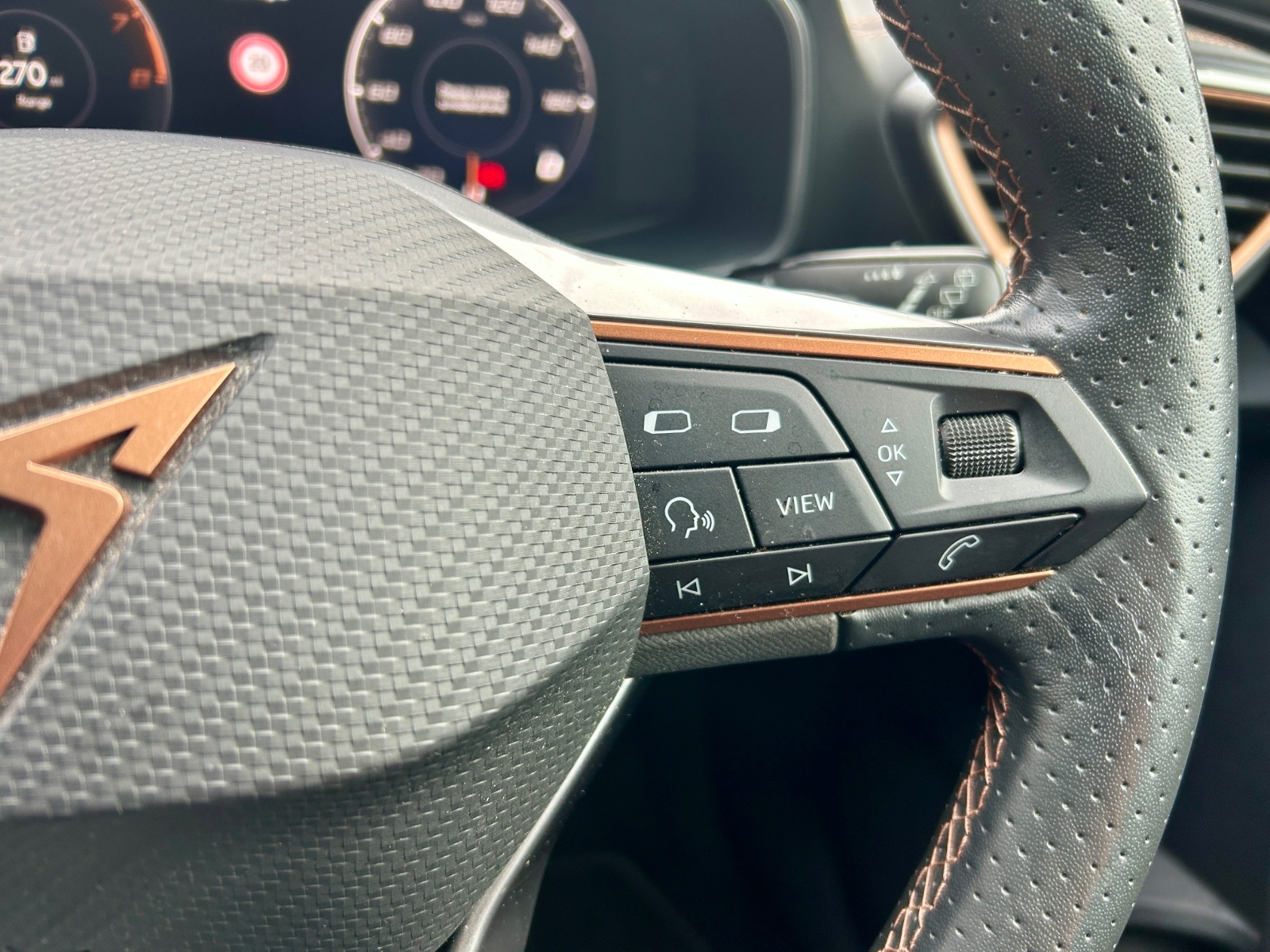 "3-spoke leather heated sports multifunction steering wheel with paddles for recuperation level selection",