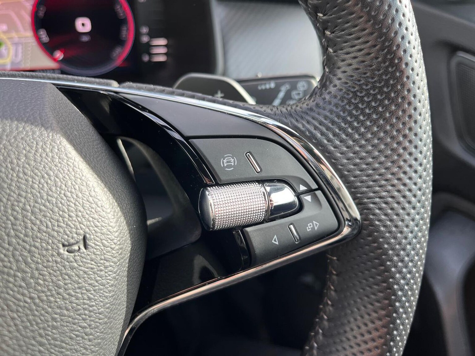 "Three spoke leather wrapped multifunction steering wheel with shifting paddles"