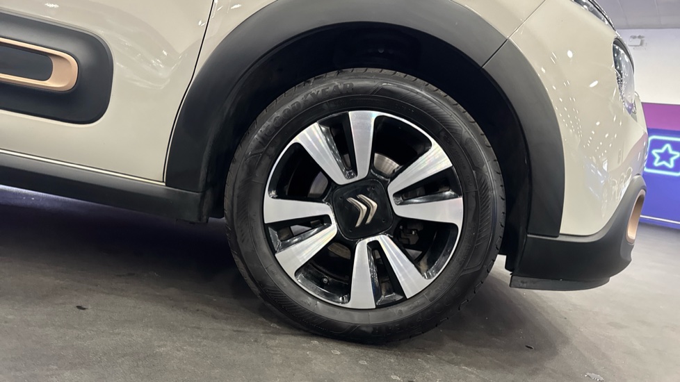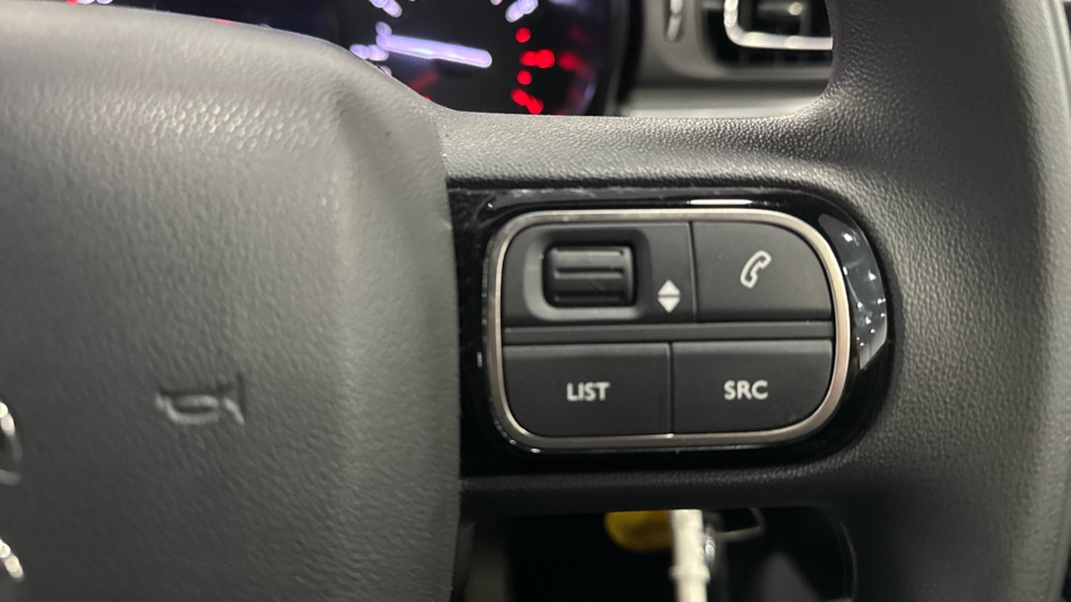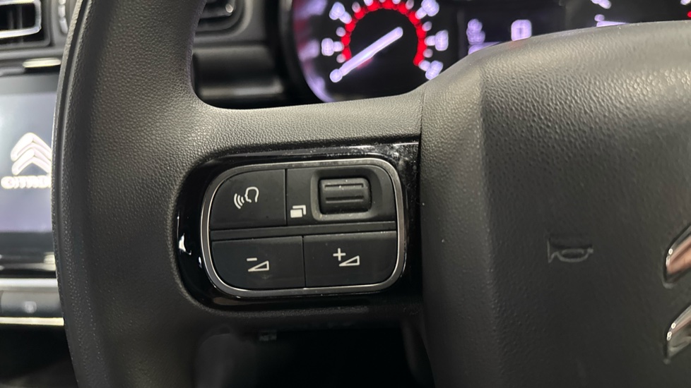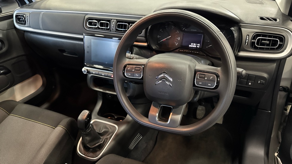 "3 spoke flat bottomed leather effect steering wheel with satin chrome effect bezel",