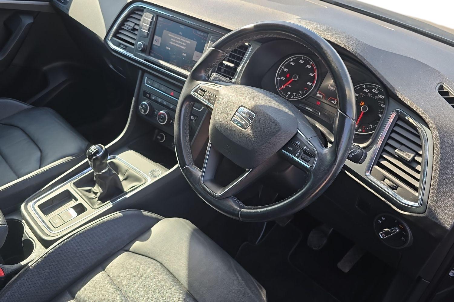 "3 spoke flat bottomed leather effect steering wheel with satin chrome effect bezel",