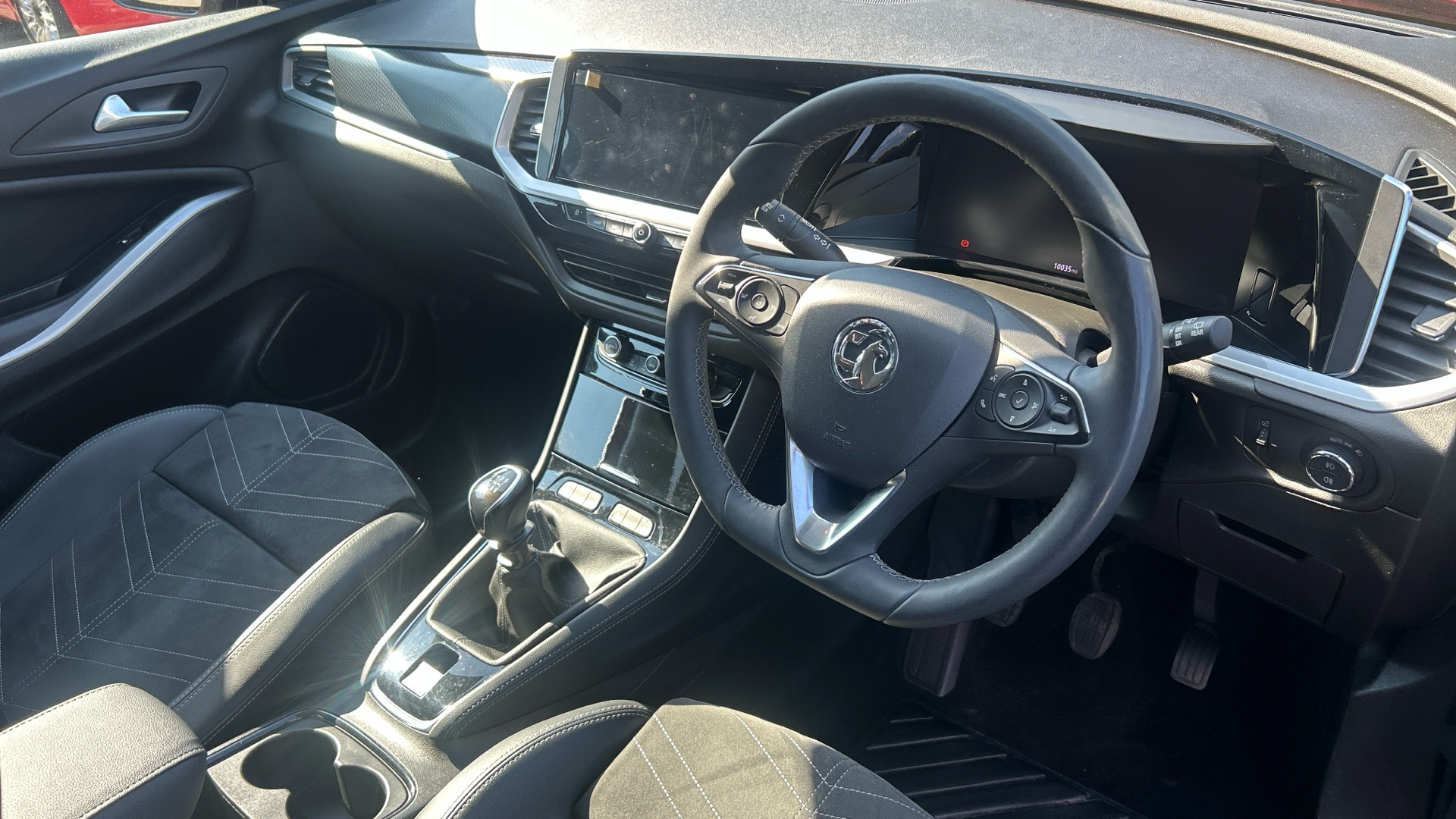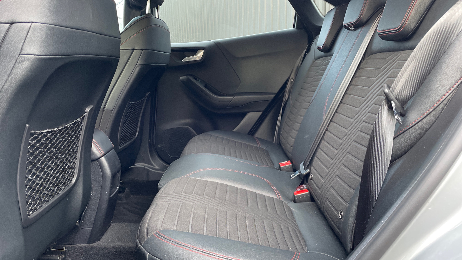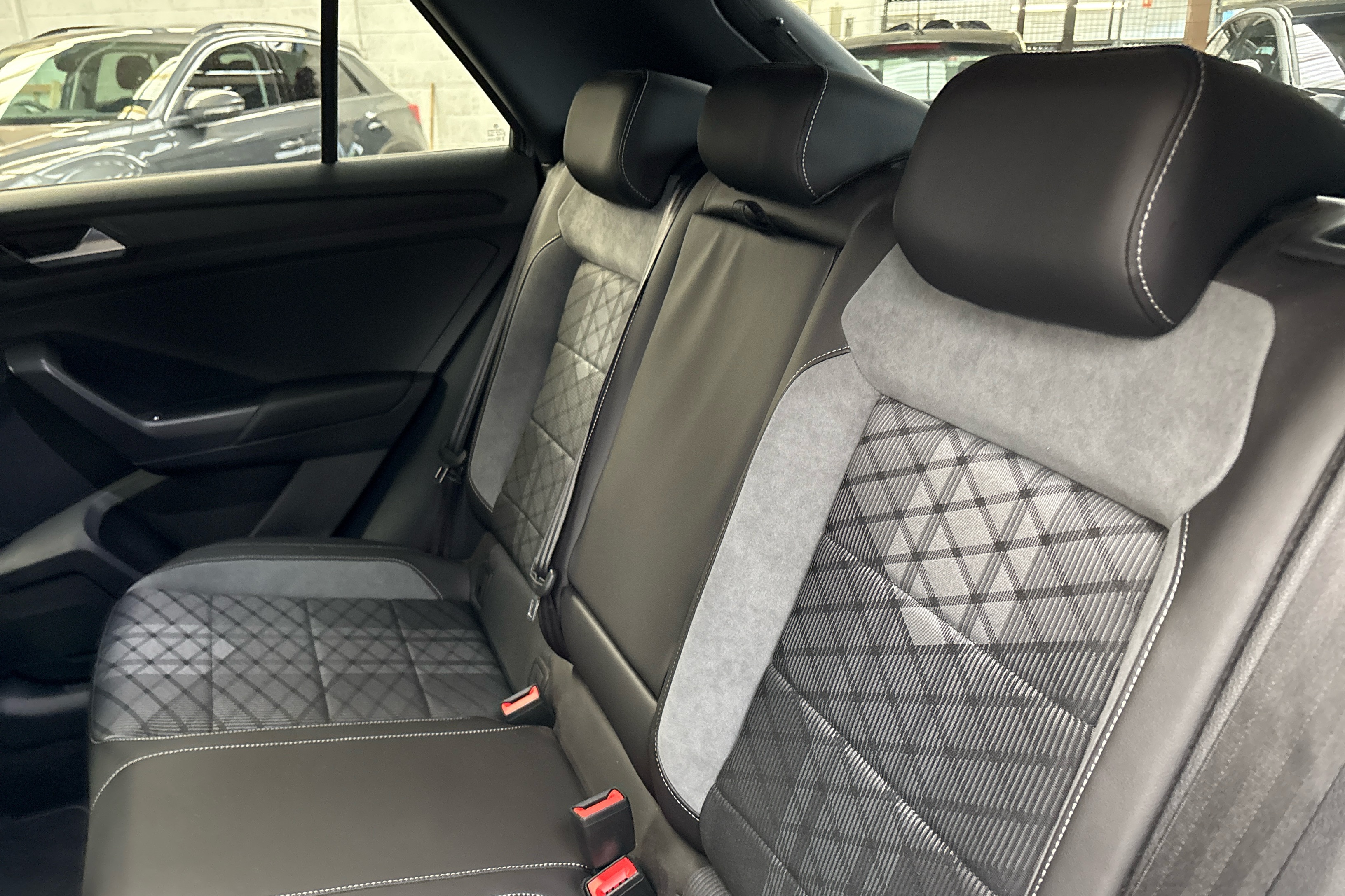 "R.S. line black suede-leather upholstery with red/grey stiching",