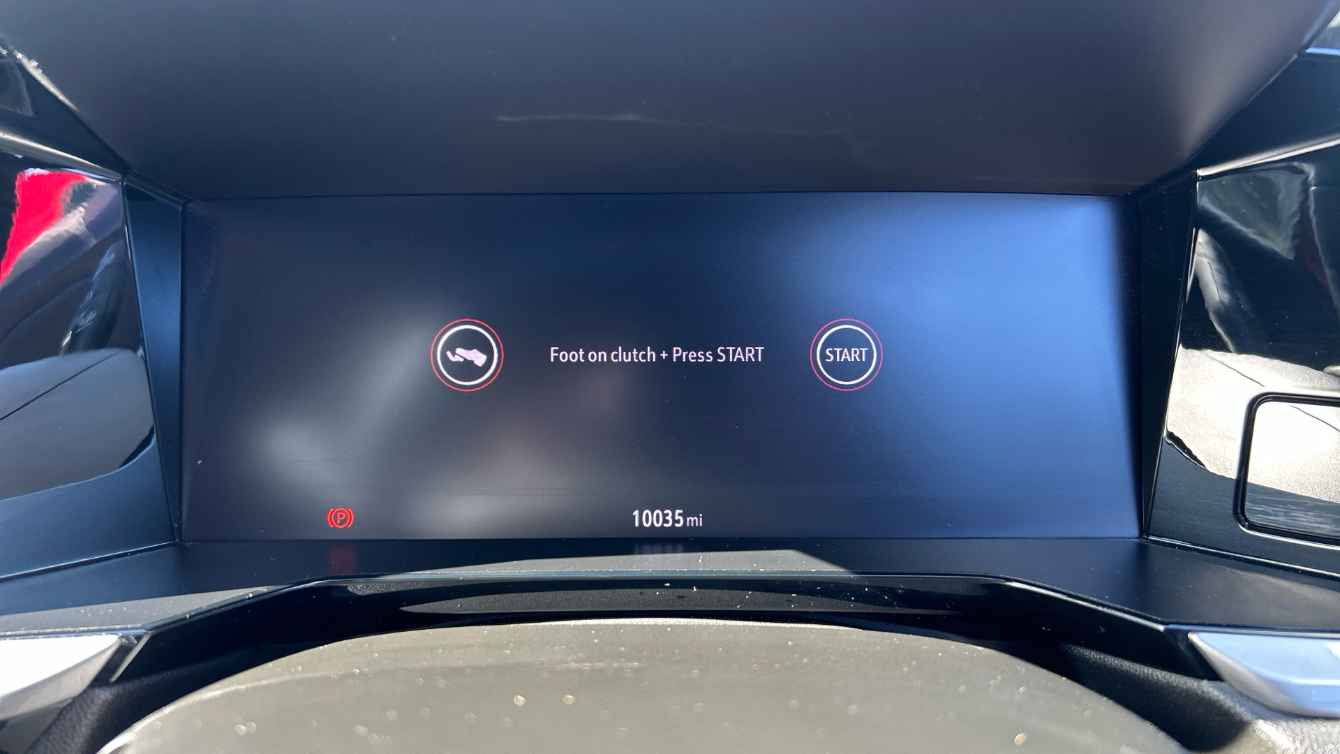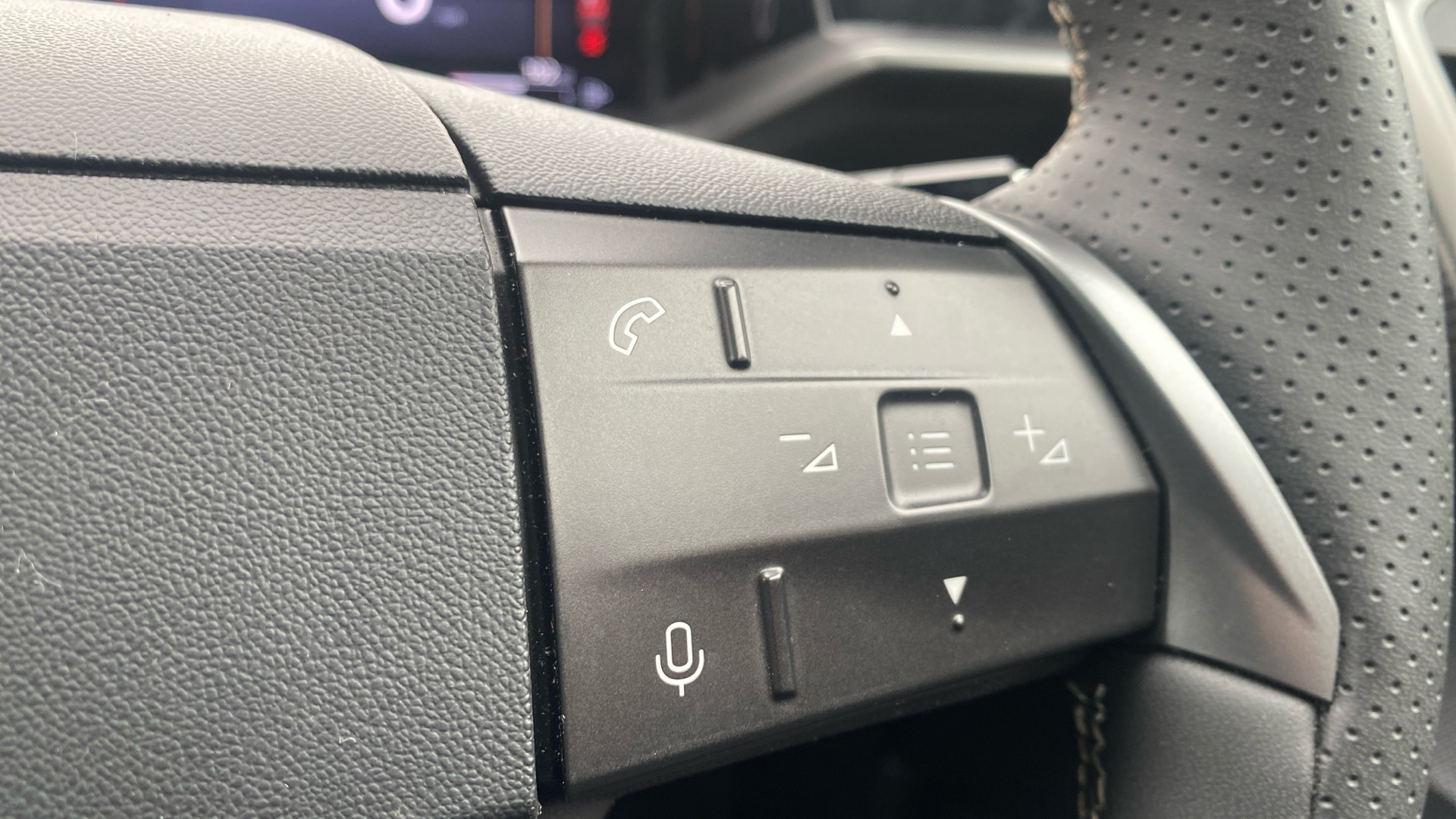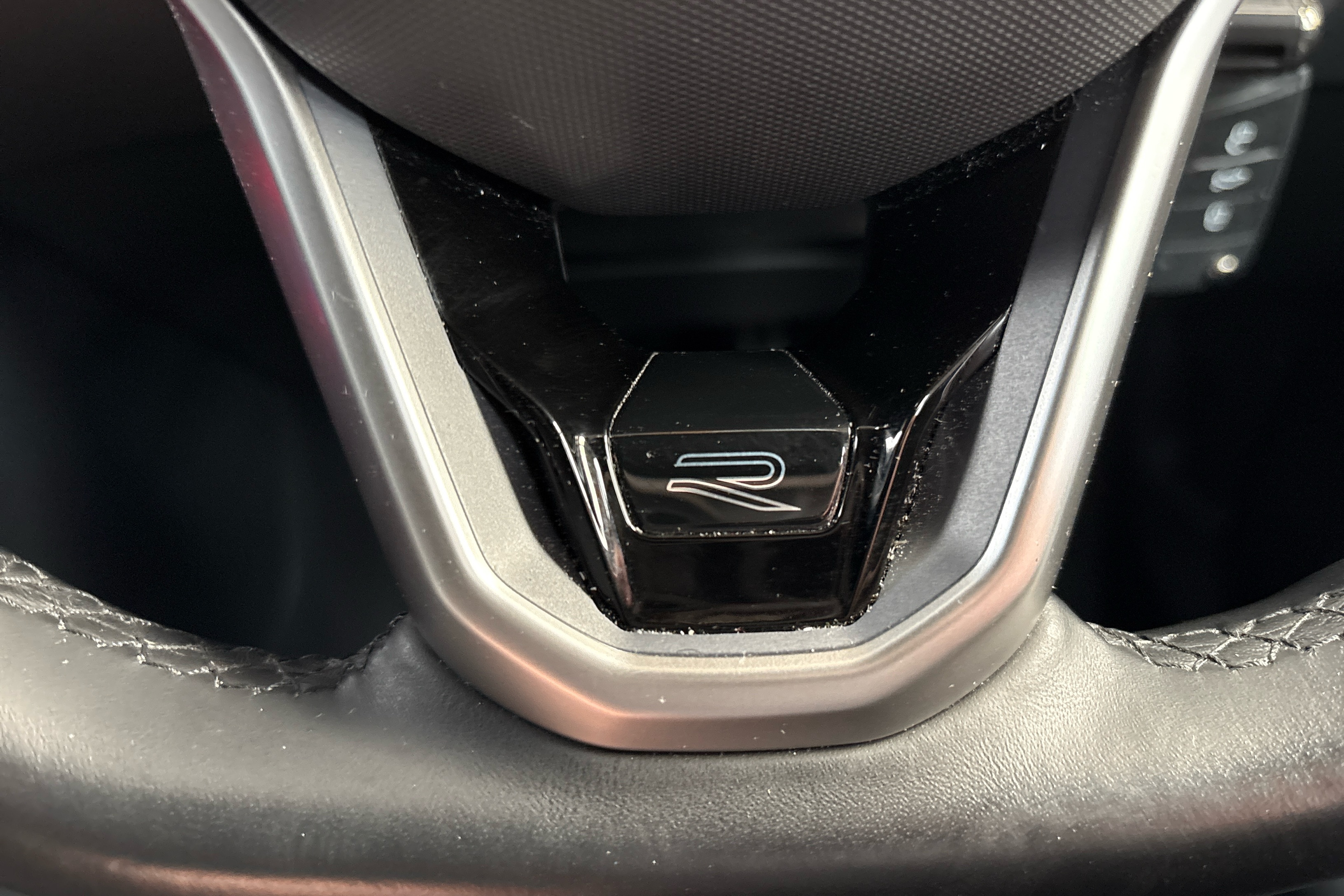 "R.S. Line perforated leather steering wheel with red/black harmony and R.S. Line badge",