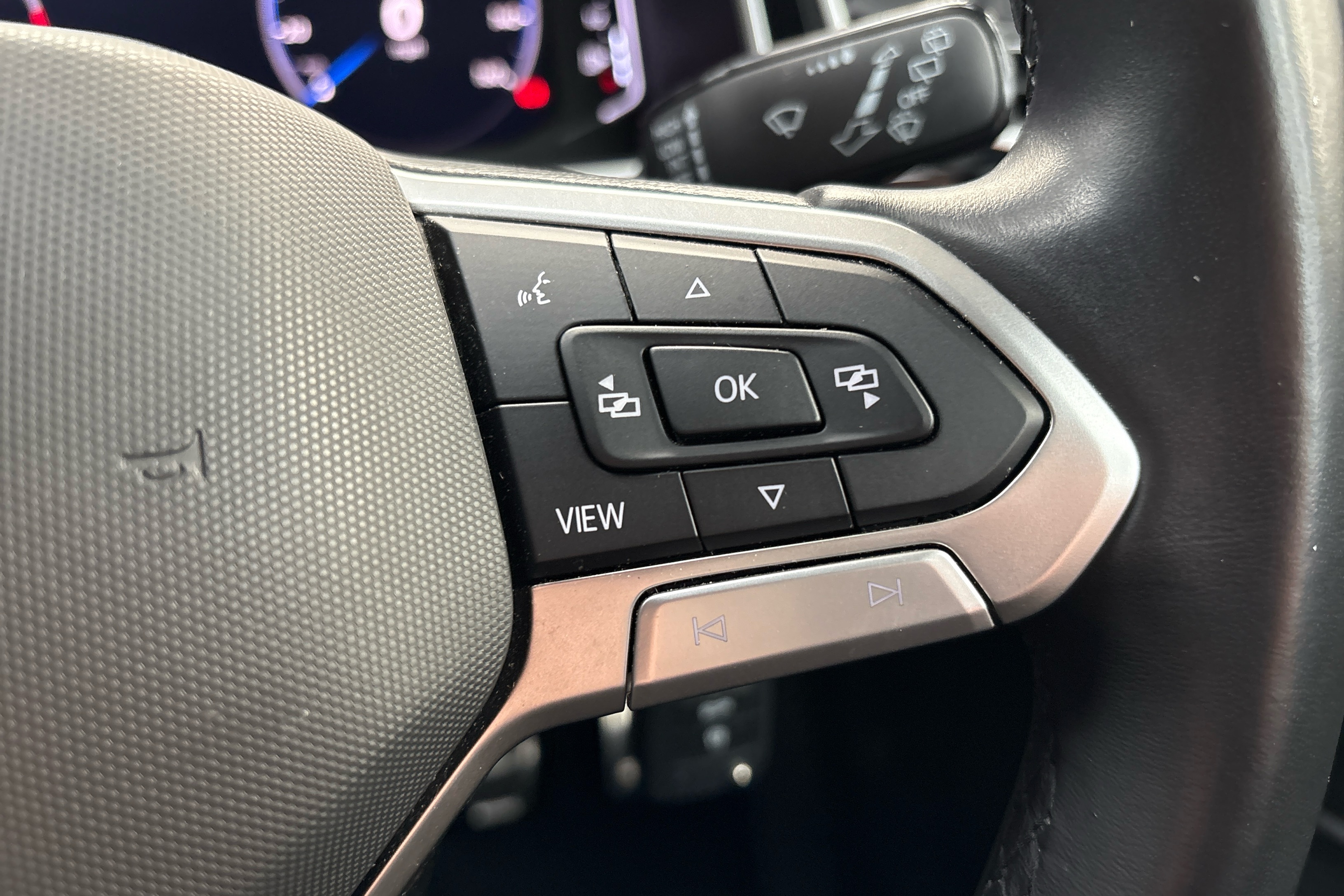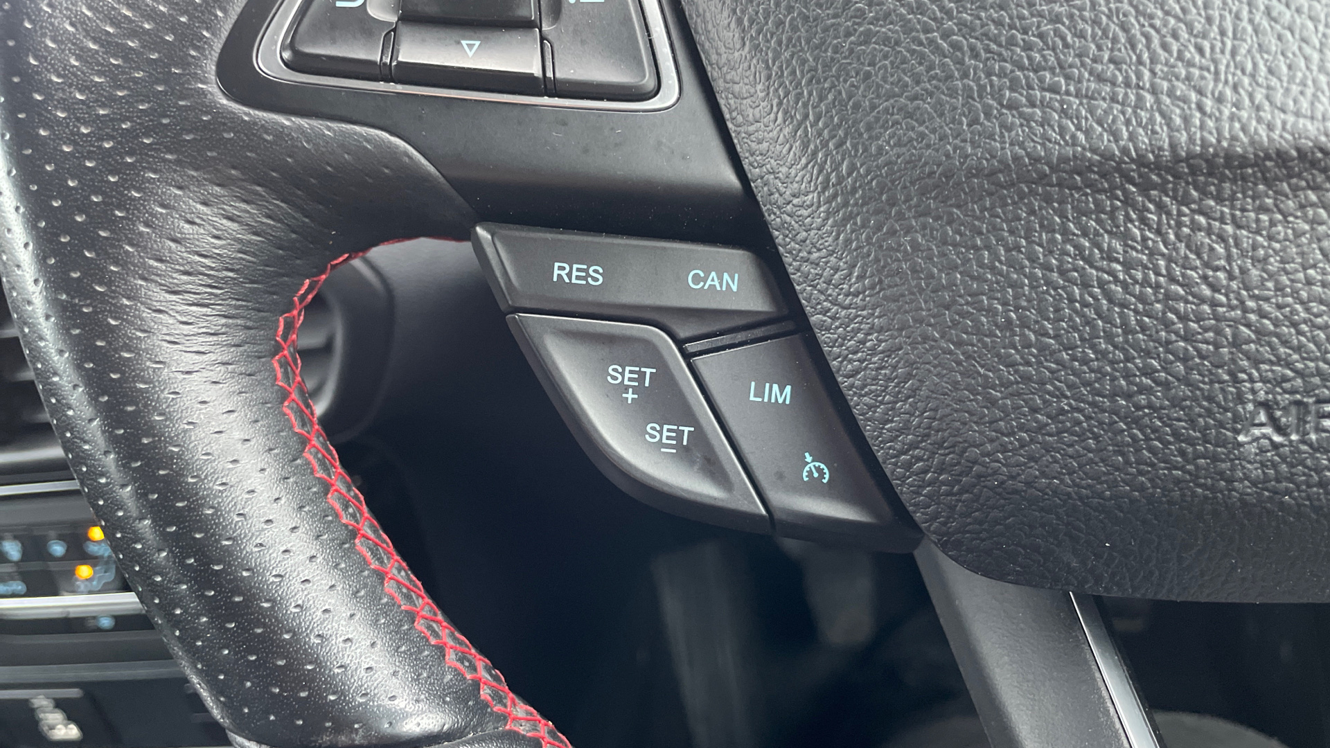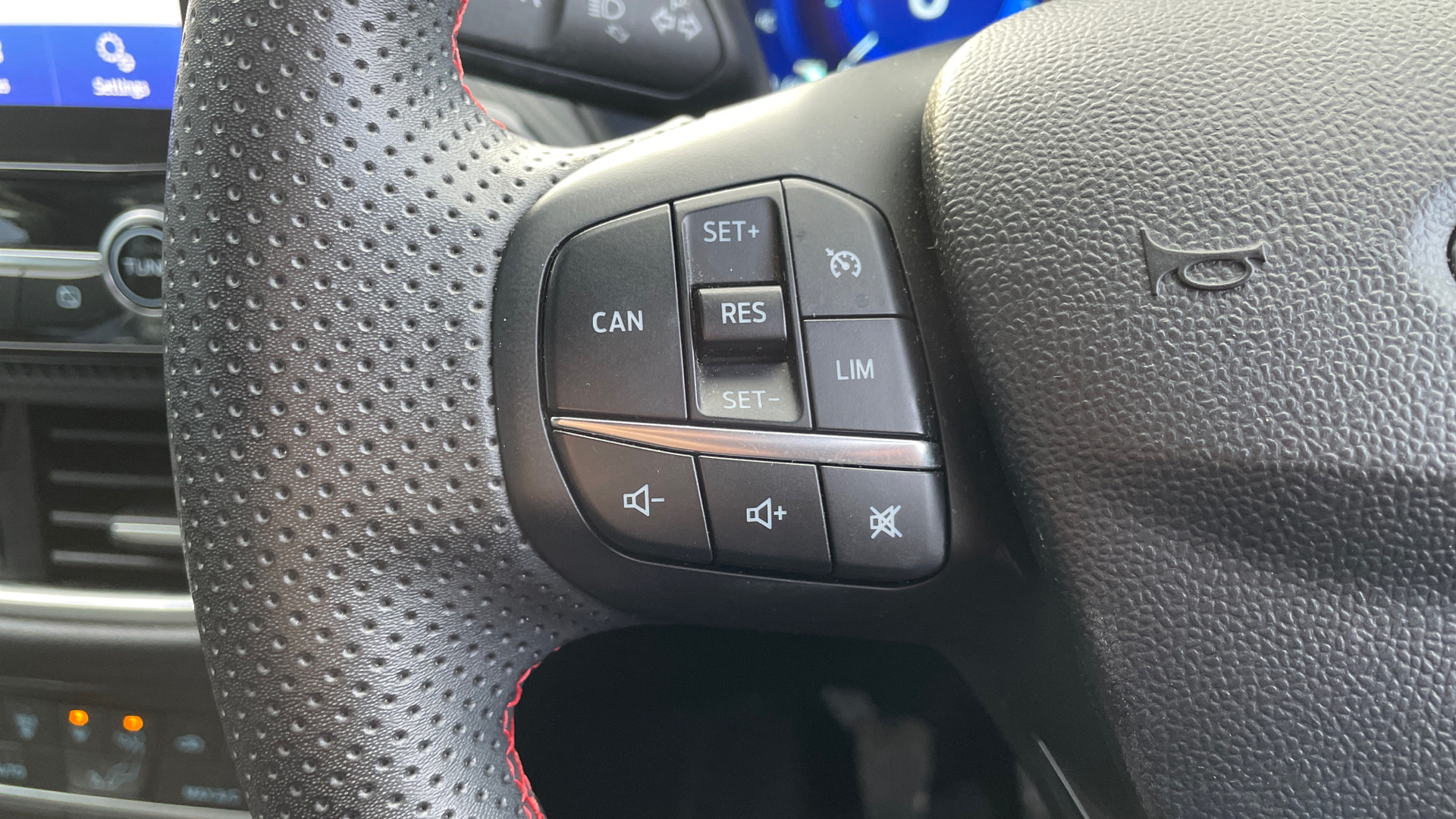 "R.S. Line perforated leather steering wheel with red/black harmony and R.S. Line badge",