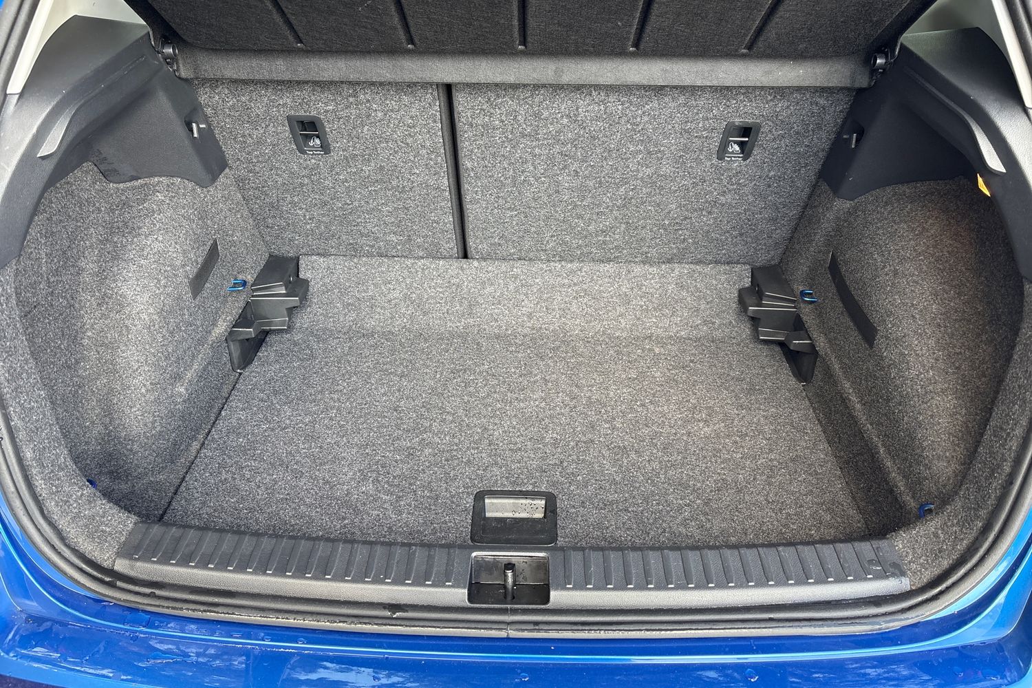 "Front and rear black floor mats with contrast stitching in rock grey",