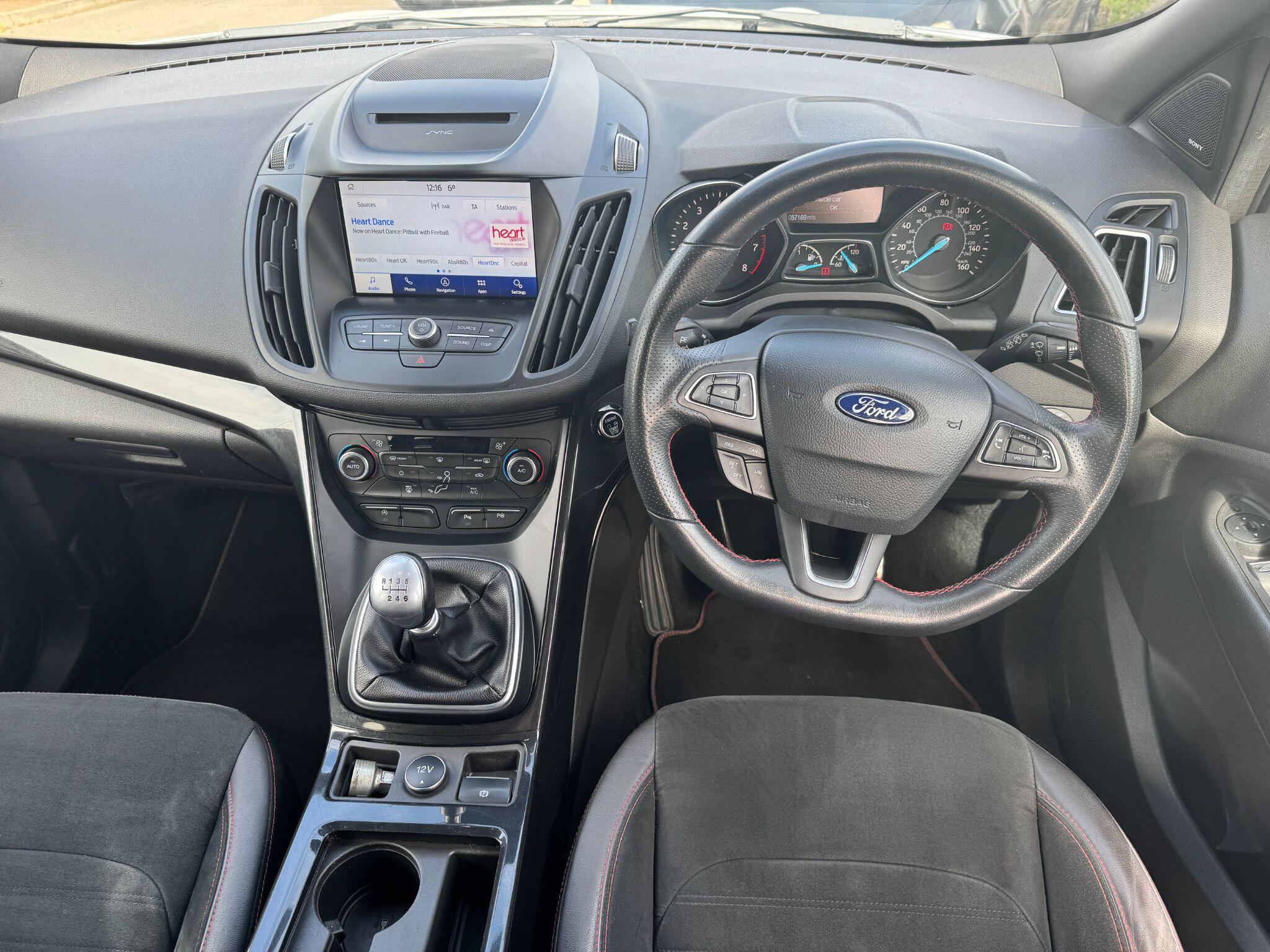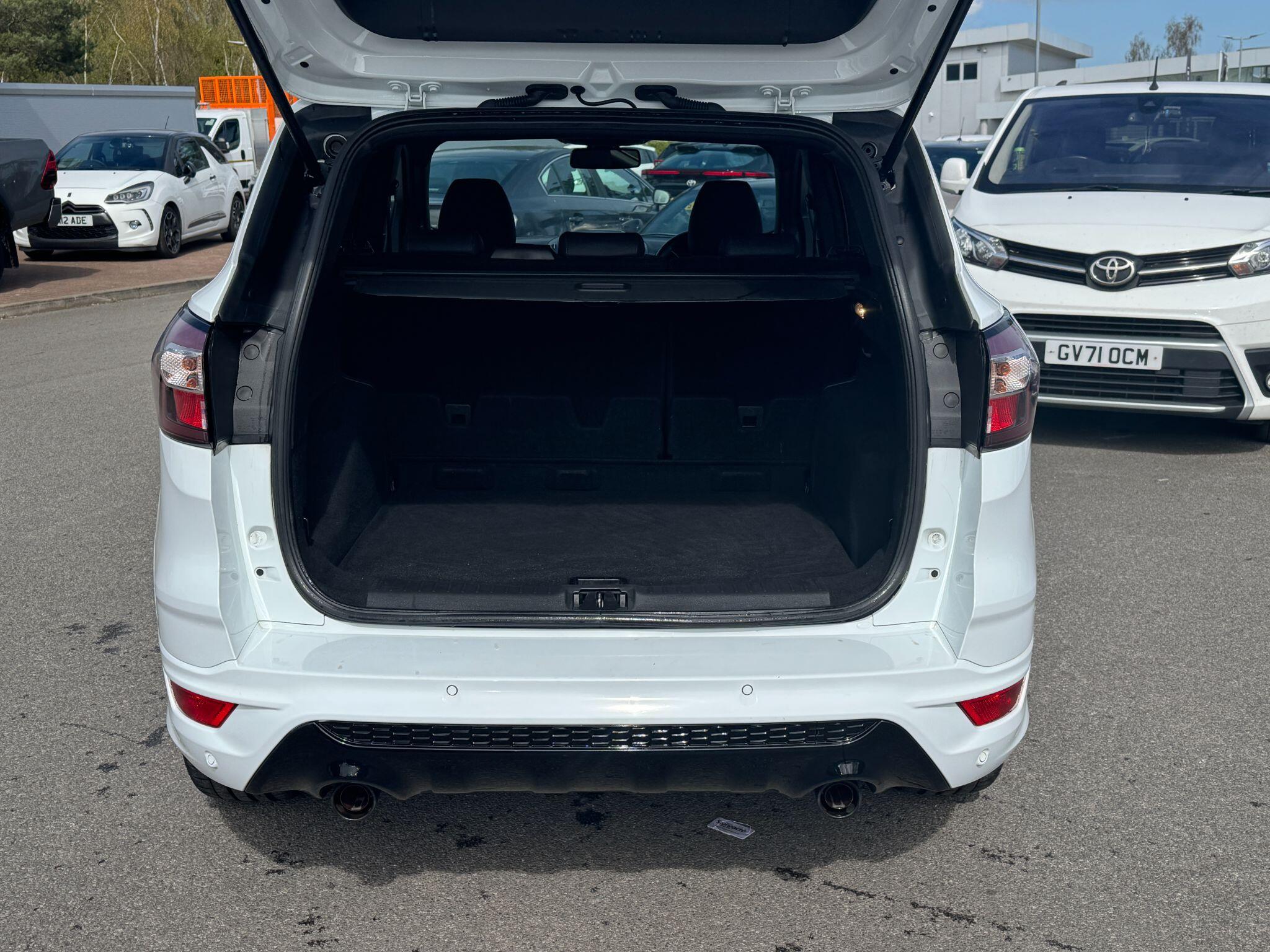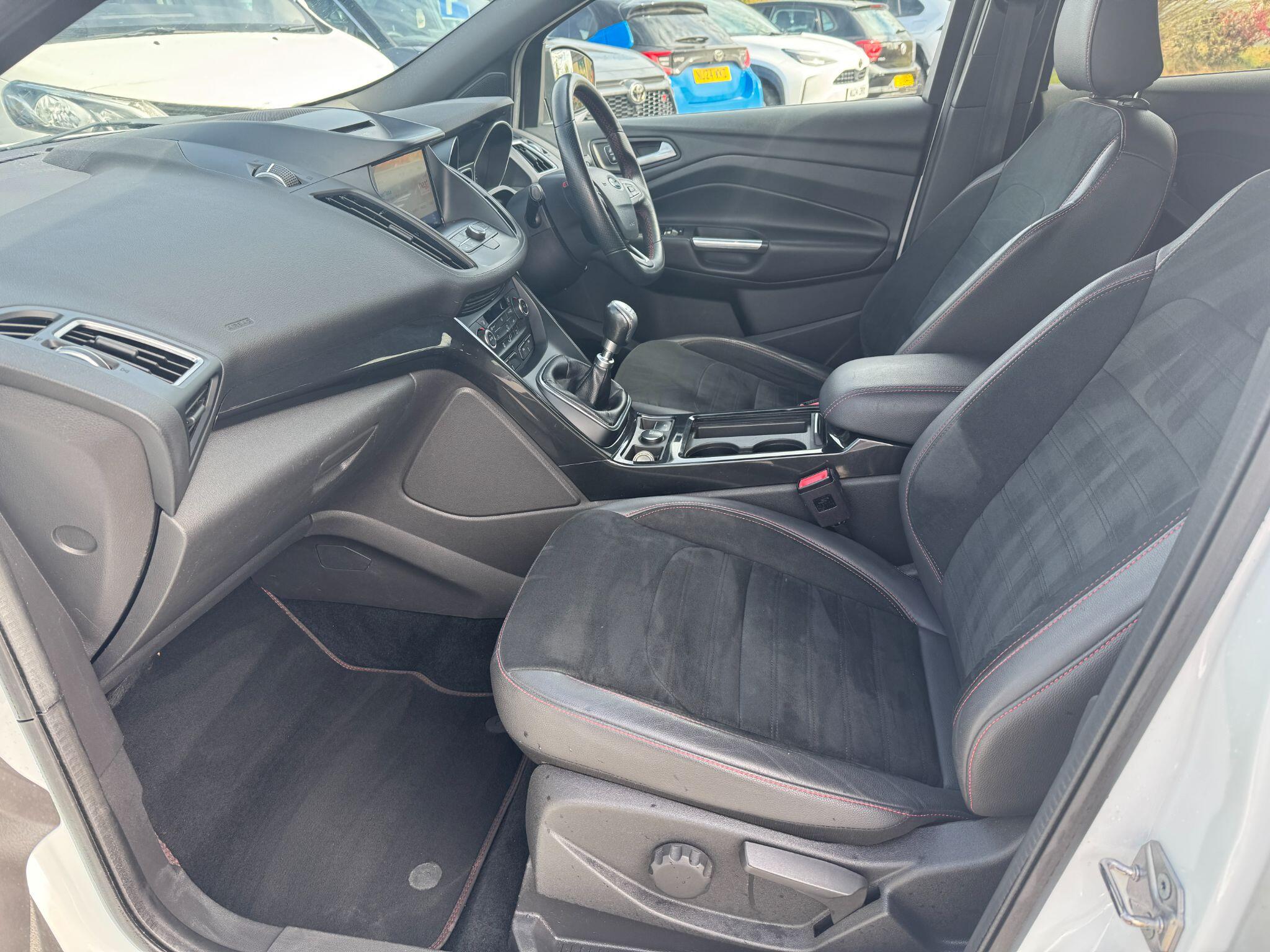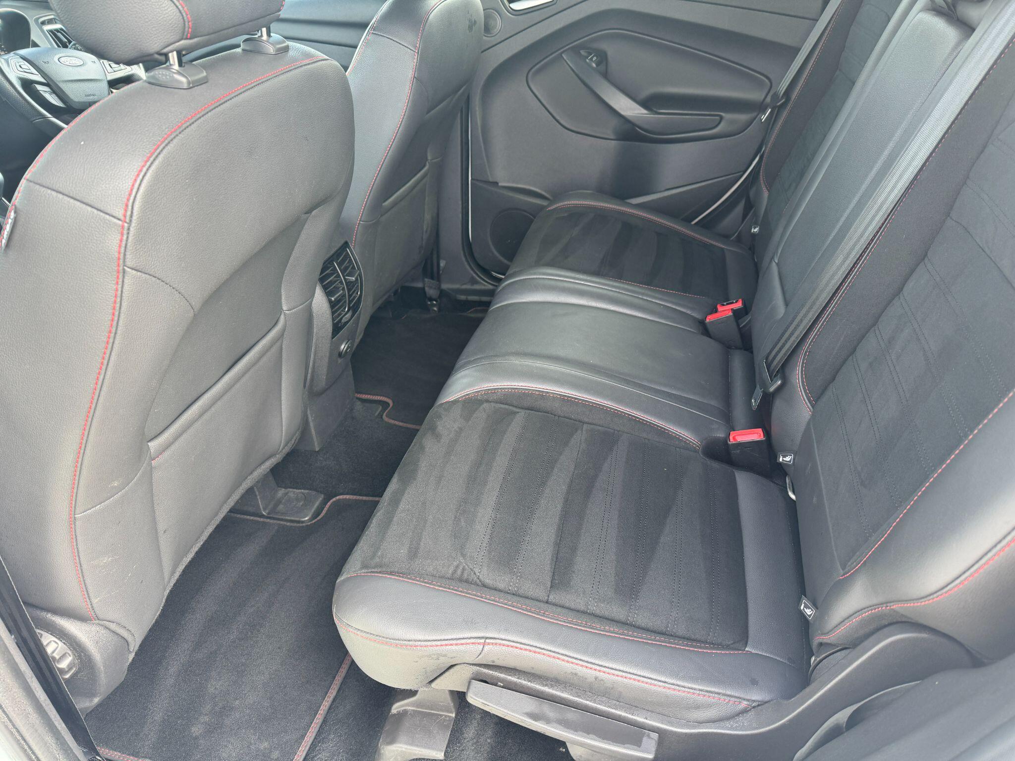 "features": "Apple car play/Android Auto, Enhanced active park assist including perpendicular parking pull out assist, flank guard and front/rear parking sensor, EPAS, Hands free telephone, Trip computer, Sports suspension, 2 USB ports, Auxiliary socket for external device, Remote audio controls on steering wheel, Auto dimming rear view mirror, Black mirror caps, Body colour bumpers, Body styling kit - Body colour front/rear/side skirts, door claddings, wheel arches, high gloss black rear mesh, silver skid plate and rear diffuser, Electrically operated and heated door mirrors with side indicators, Electrically operated front and rear windows with global closing, Front fog lights, Front scuff plate, Large rear spoiler, Power folding door mirrors, Power opening panoramic glass sunroof, Quickclear heated windscreen, Rain sensing wipers, Tailgate wash/wipe, Twin exhaust pipes, 6 way manually adjustable passenger seat with lumbar support, 60/40 split/folding rear back and cushion, Alloy Foot Pedals, Auxiliary power socket in luggage area, Centre console with stowage tray/bottle holder/CD stowage/front and rear 12V power point, Dark headliner, Driver/passenger front seatback pockets, Dual electronic automatic temperature control, Flat bottomed leather steering wheel with red stitching + gear knob, Floor mats with red stitching, Folding rear centre armrest, Footwell courtesy lights front and rear, Front head restraints, Front overhead courtesy lights with theatre style dimming and delay, Front/rear reading lights, Isofix system on outer rear seats, Multi-colour ambient interior lighting, Part leather upholstery, Reach + rake adjustable steering column, Rear head restraints, Sports style front seats, Stowage unit in upper instrument panel, Tie down hooks, Tonneau cover, Variable intensity instrument illumination, Appearance pack - Kuga/ST-Line, 3 point seatbelts on all 3 rear seats, ABS/EBD, Airbags - front driver/passenger, front & rear side, curtain, drivers knee, EBA, Electric traction assist system, Electronic Stability Programme, Front passenger airbag deactivation switch, Hill start assist, Intelligent Protection System (IPS), Red brake calipers, Tyre pressure monitoring system, Engine immobiliser, Keyless entry, Keyless start with 'Ford Power' starter button, Locking wheel nuts, MyKey system, Remote powered central double locking doors, Thatcham category 1 alarm, 19\" 5x2 rock metallic alloy wheels, Mini steel spare wheel, ",