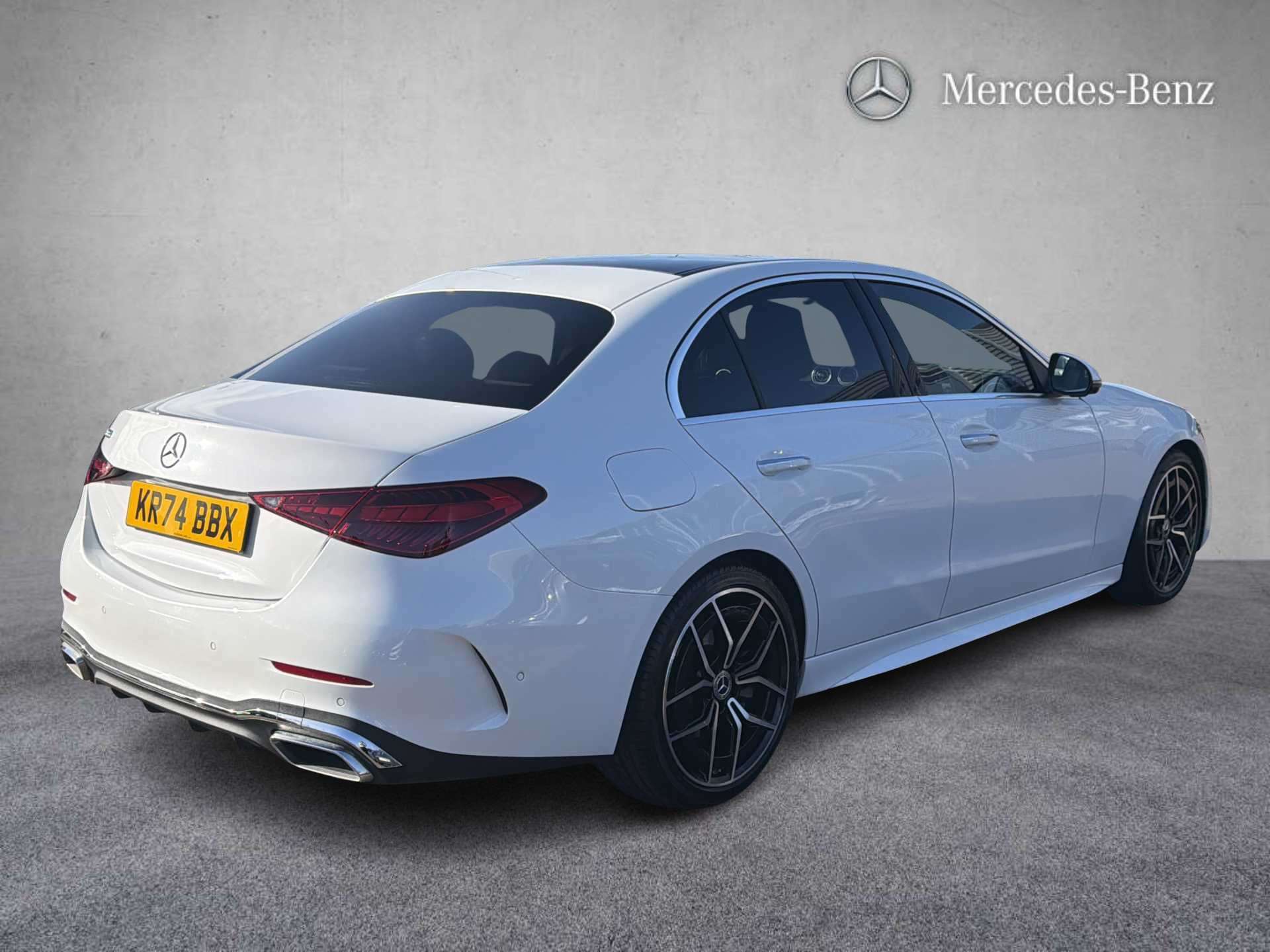 "AMG body styling with AMG front apron and rear apron and visible exhaust tailpipe in chrome trim elements",