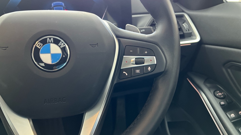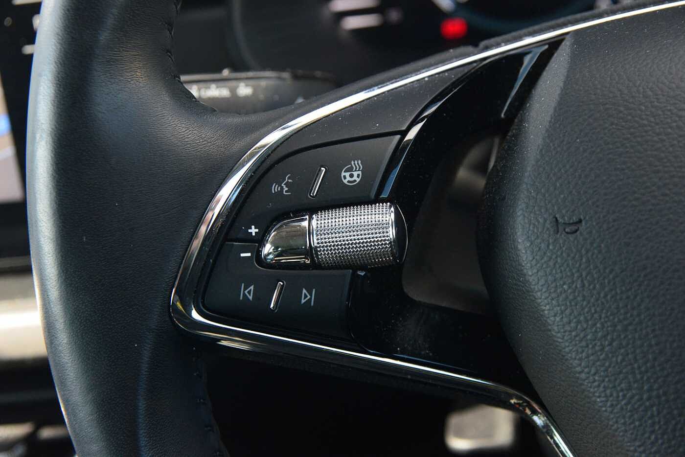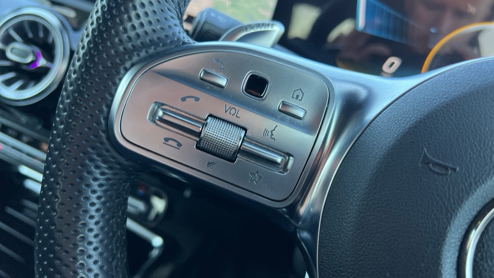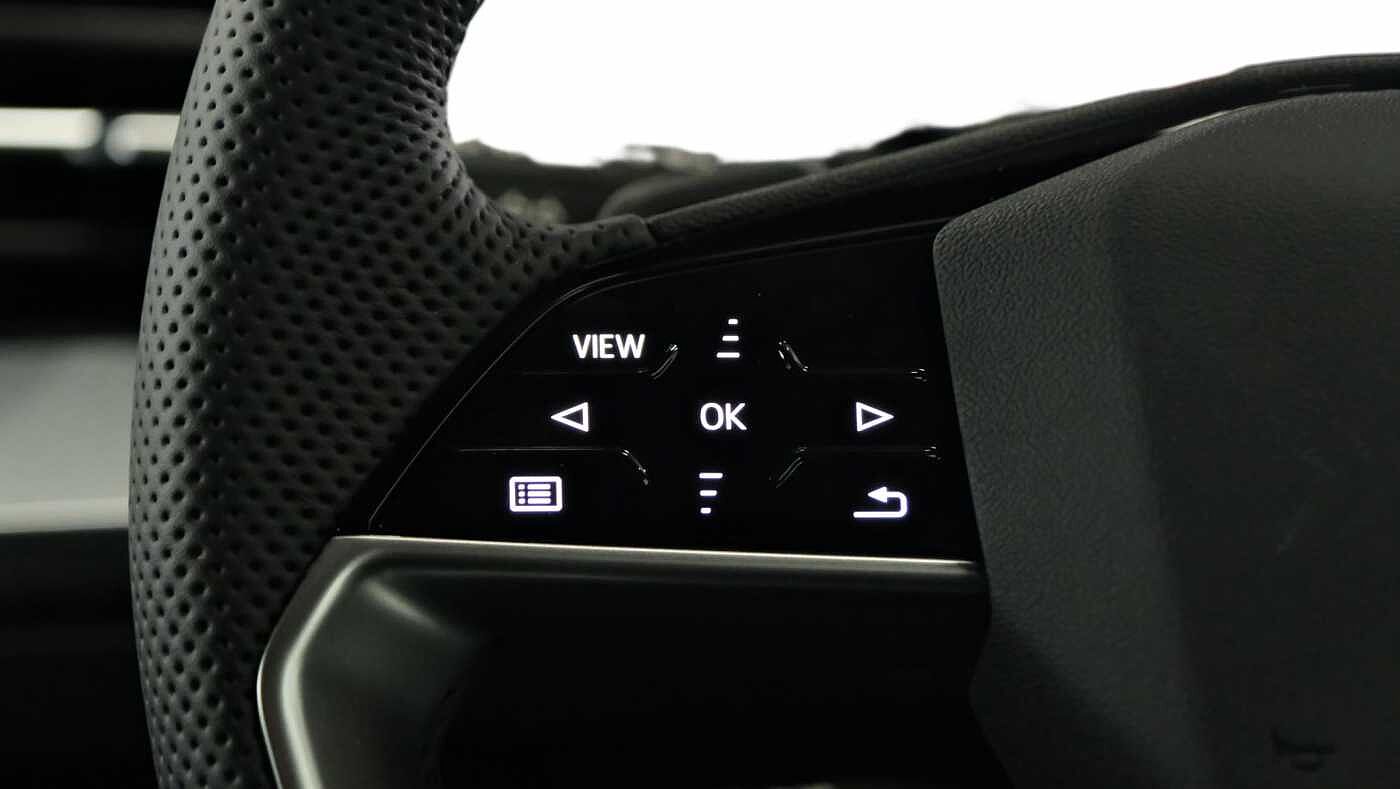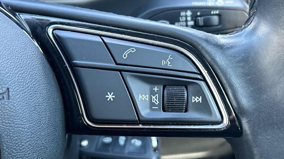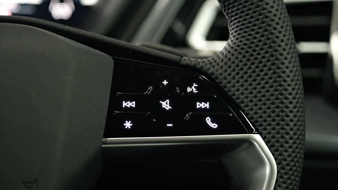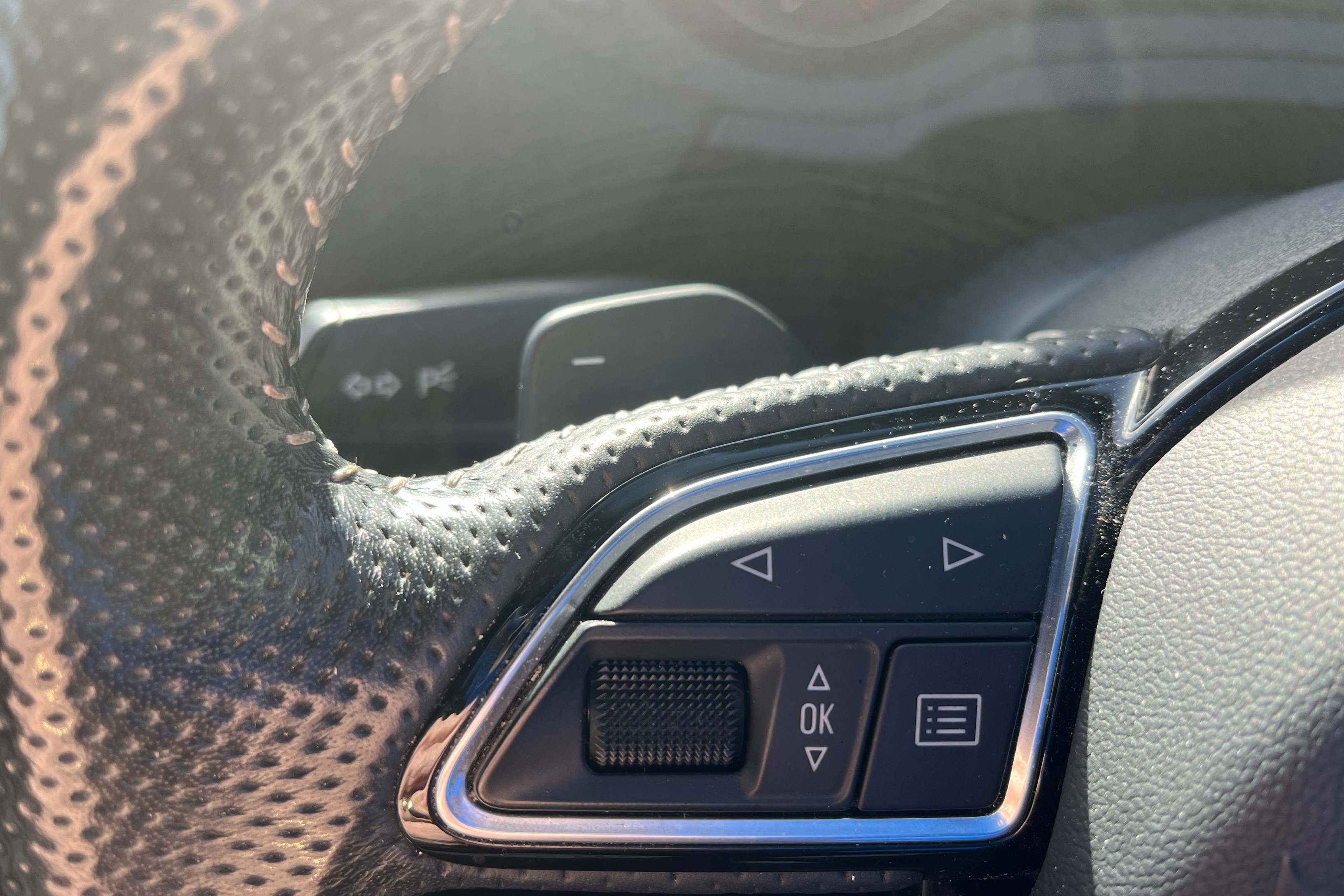 "3 spoke flat bottom multi-function perforated leather steering wheel with contrast stitching and aluminium gearshift paddles",