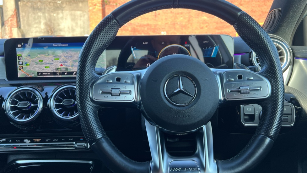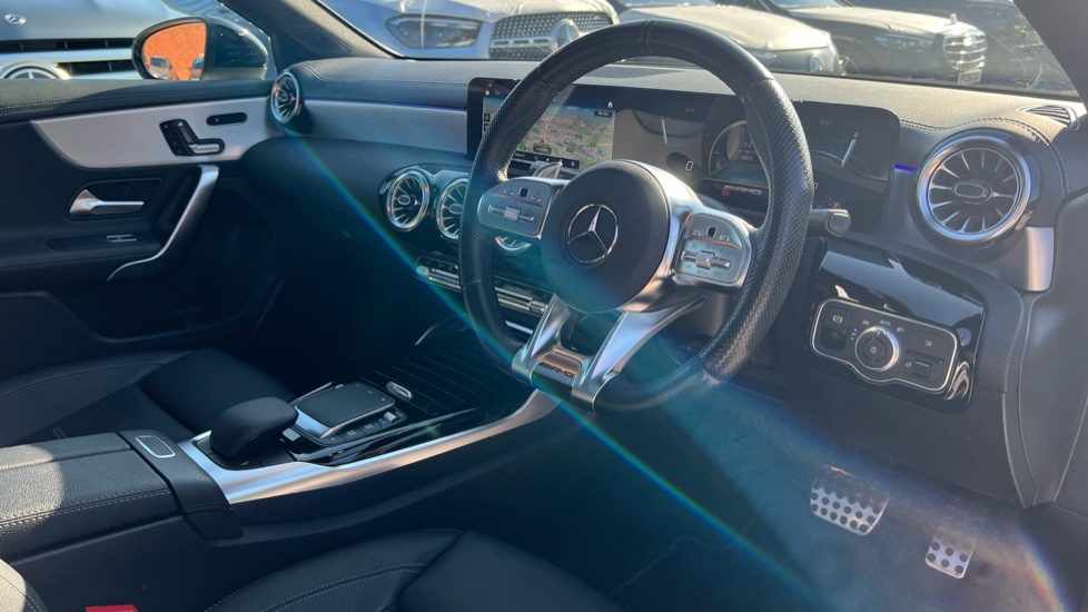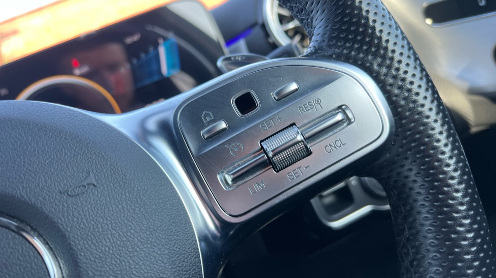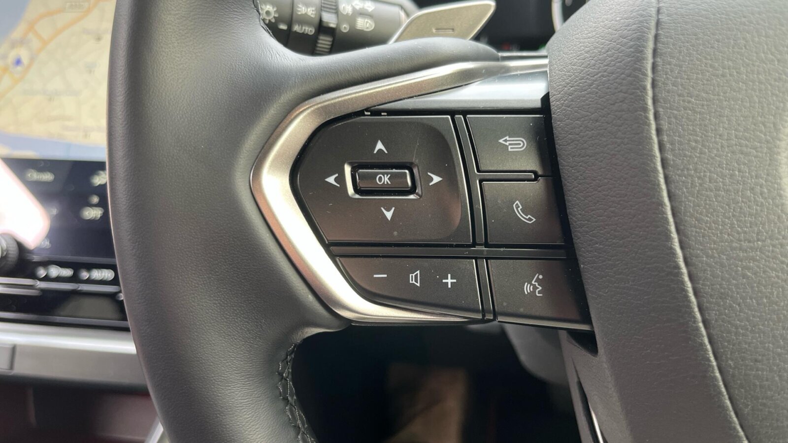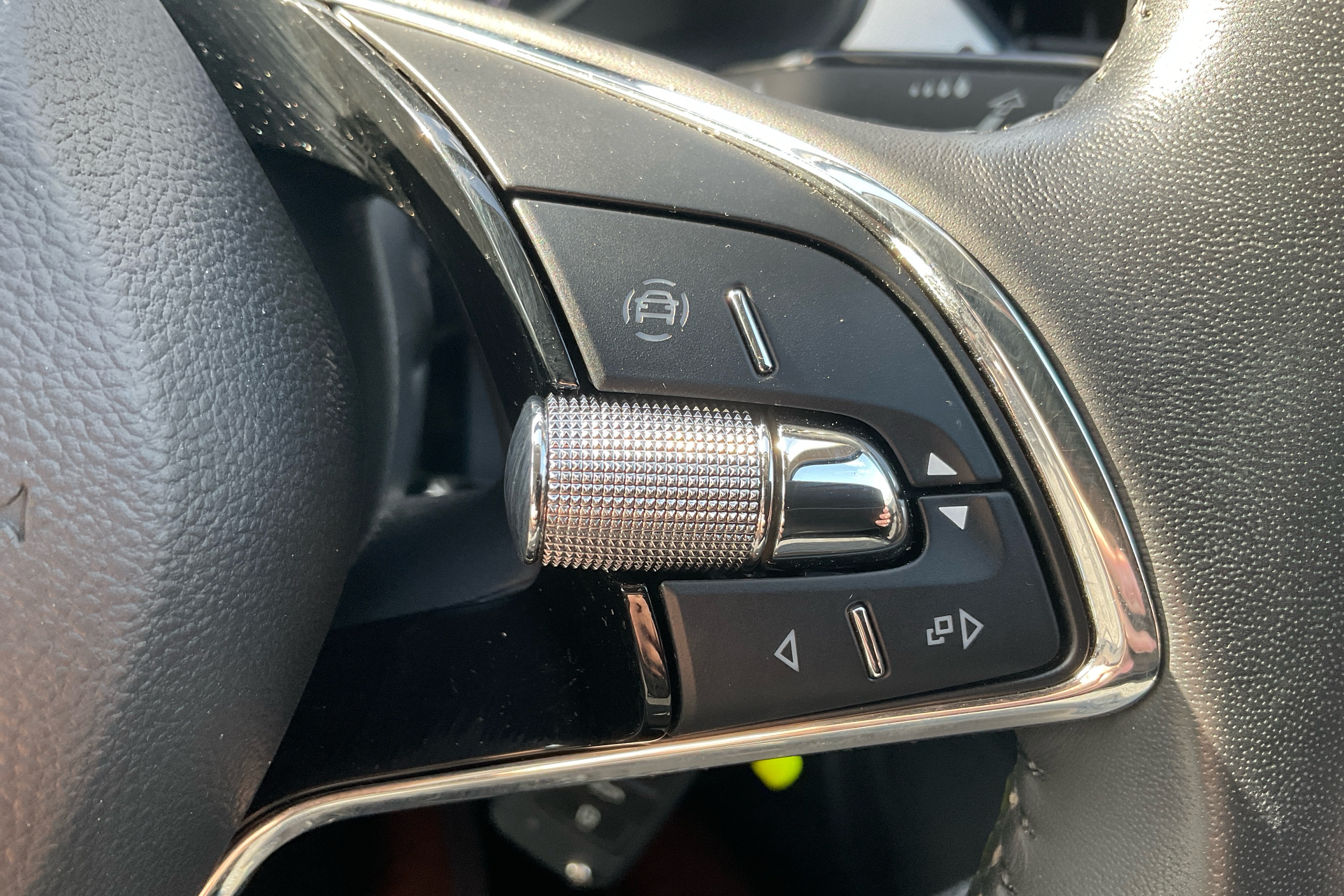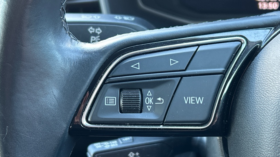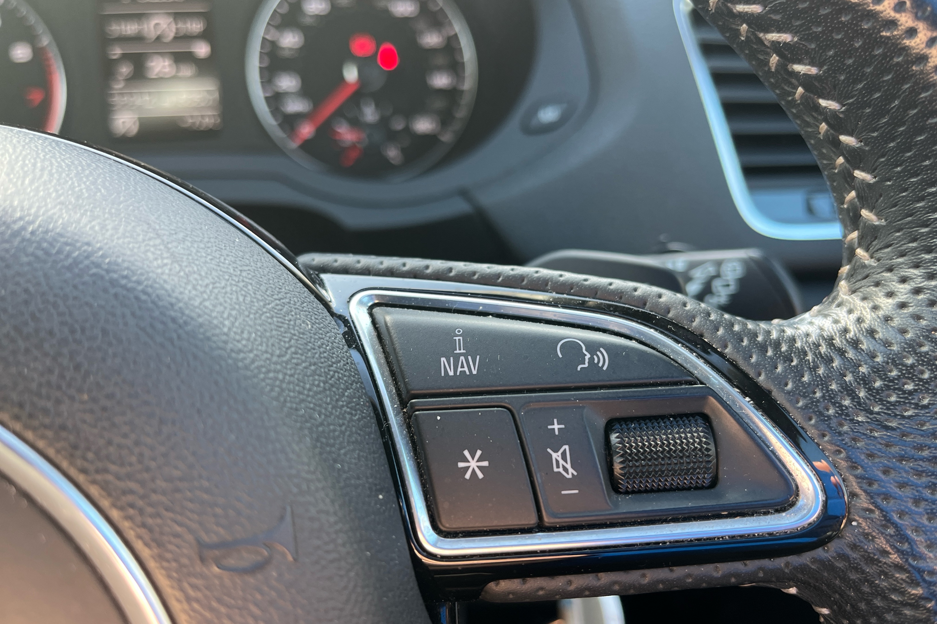 "3 spoke flat bottom multi-function perforated leather steering wheel with contrast stitching and aluminium gearshift paddles",
