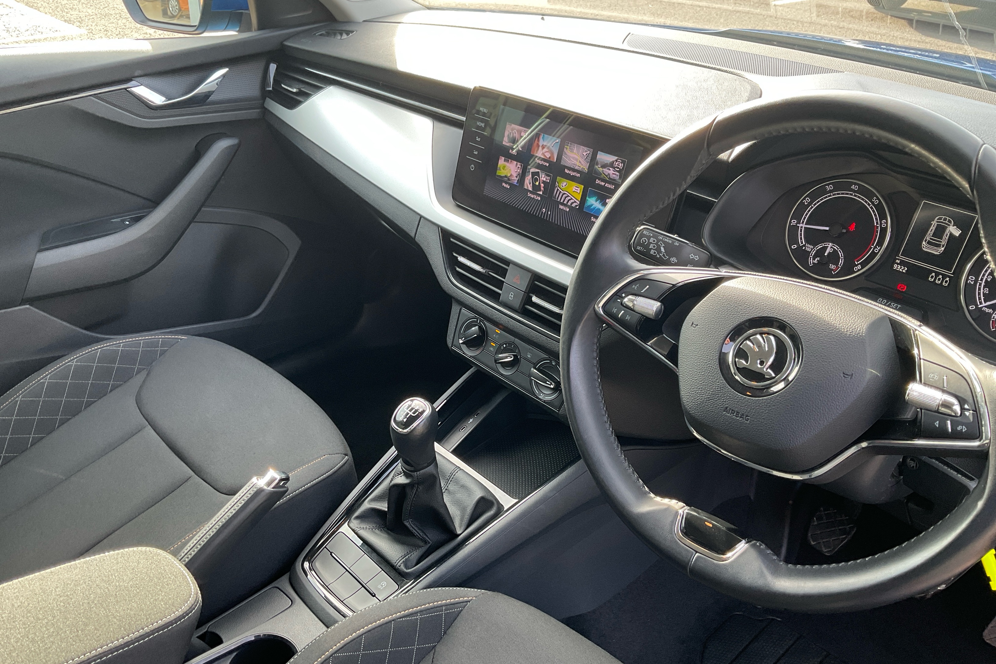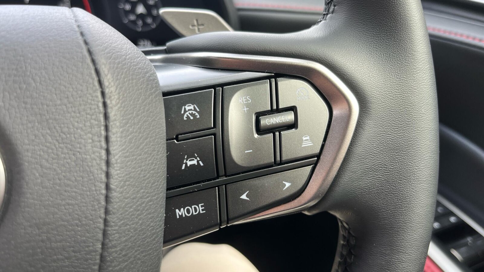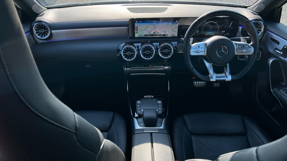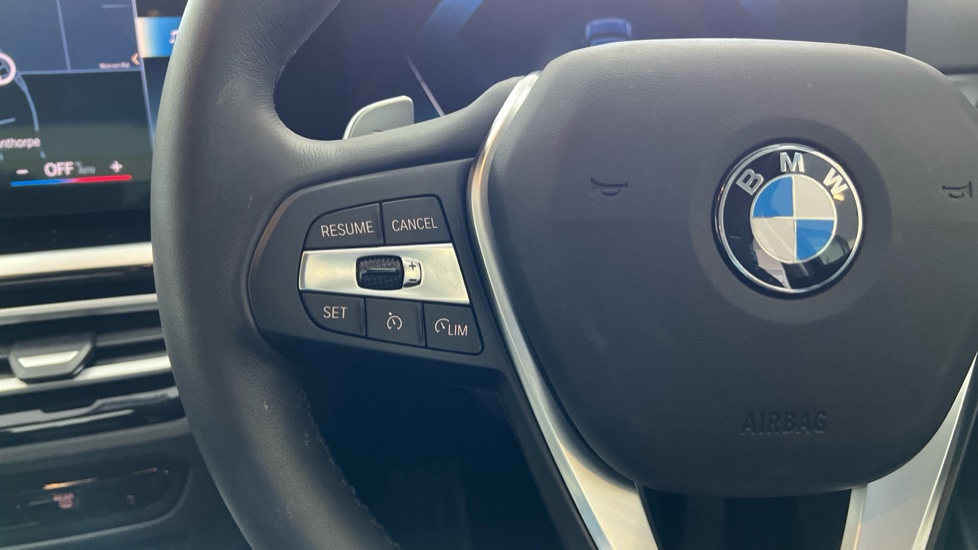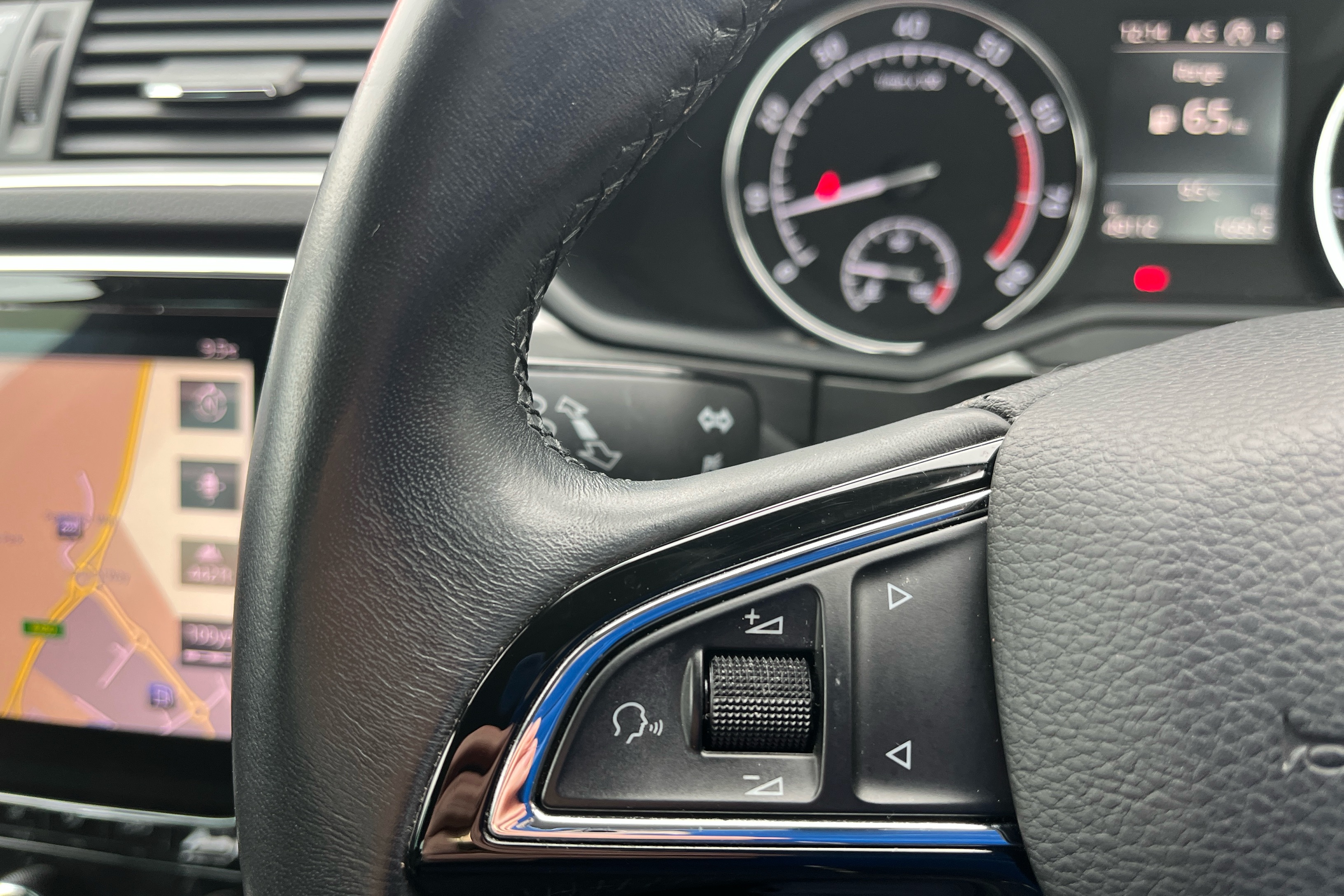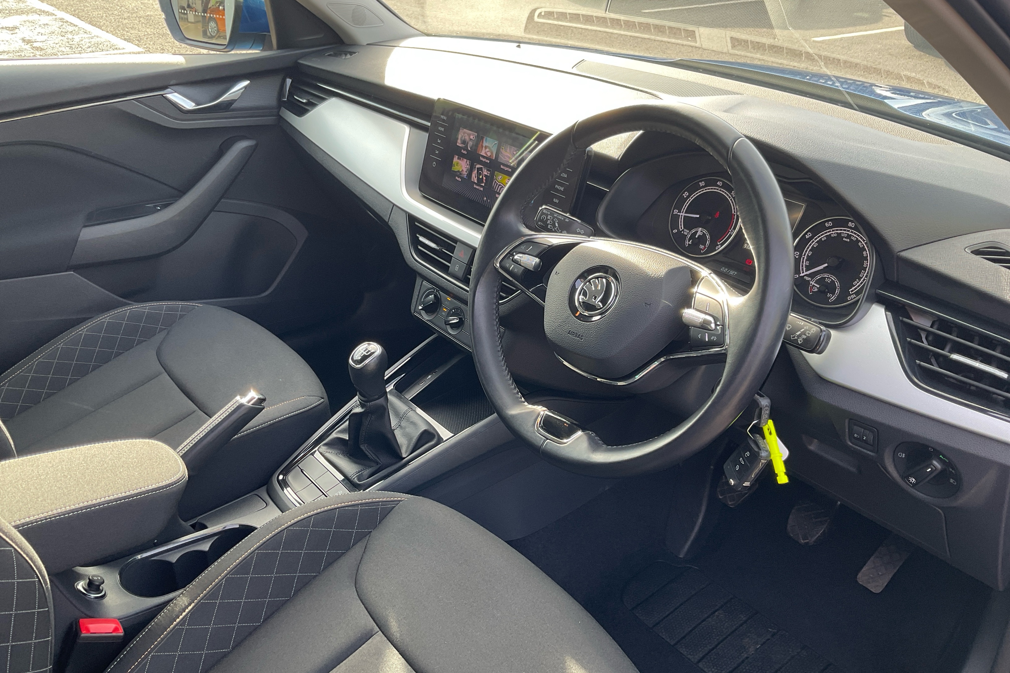 "3 spoke flat bottom multi-function perforated leather steering wheel with contrast stitching and aluminium gearshift paddles",
