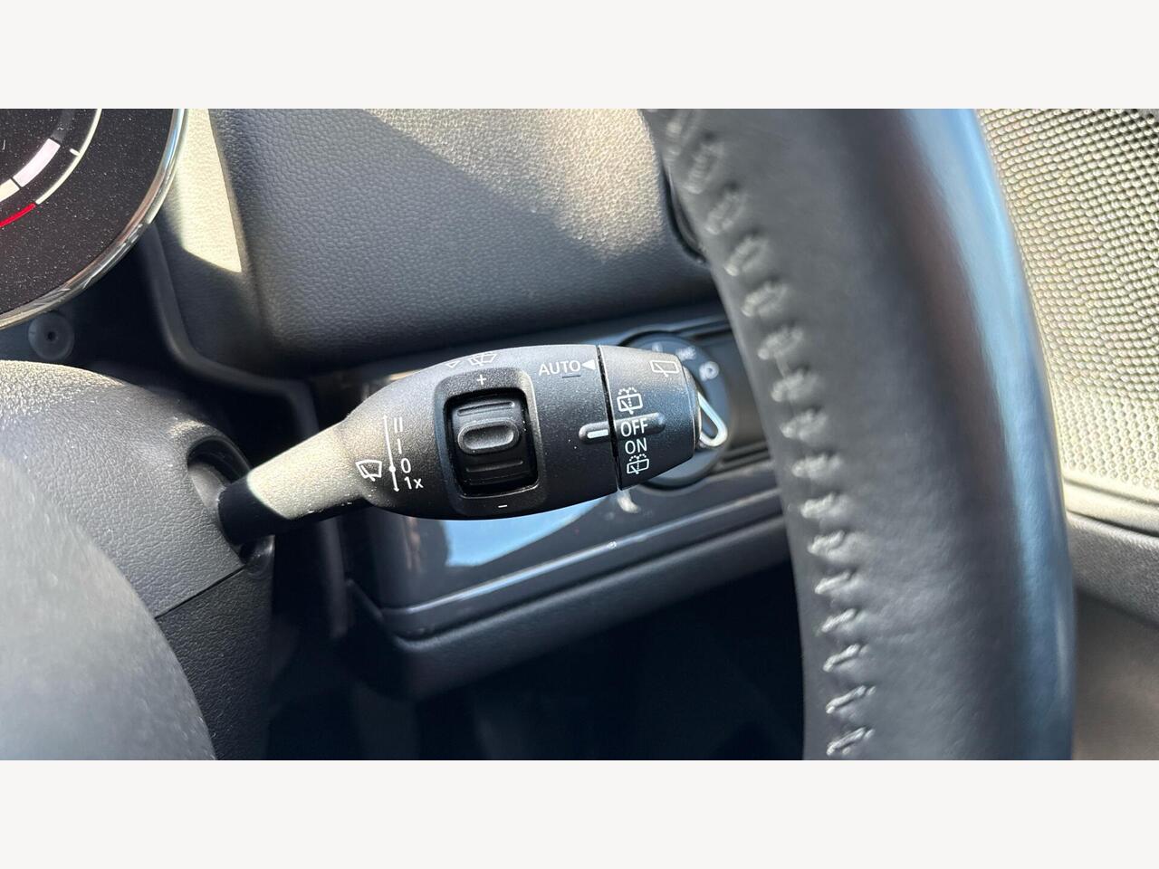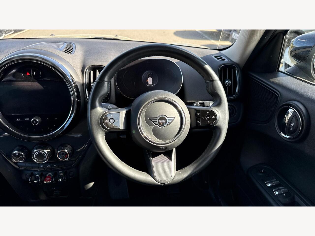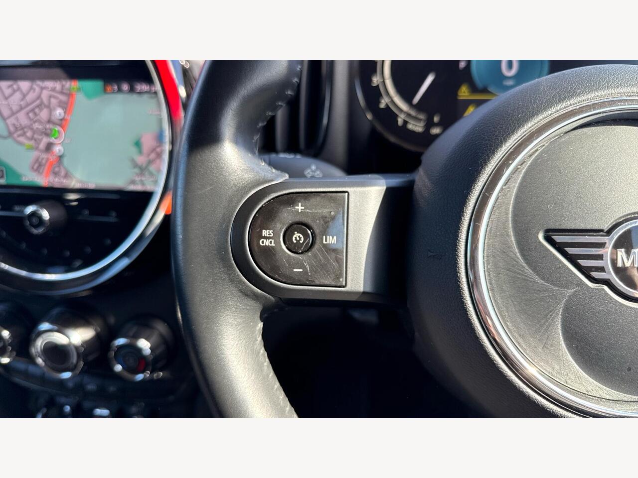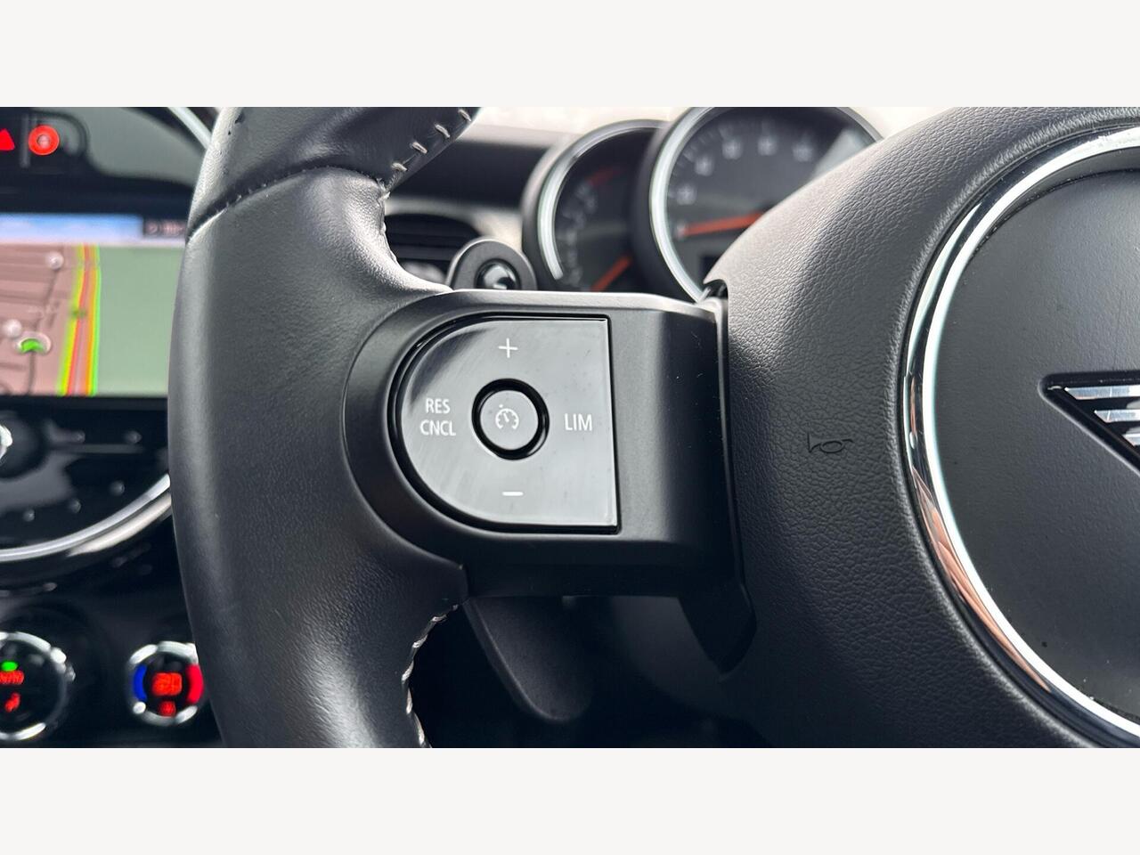 "Walknappa leather steering wheel with grey seam and MINI Yours badge on Piano Black lower steering wheel spoke"
