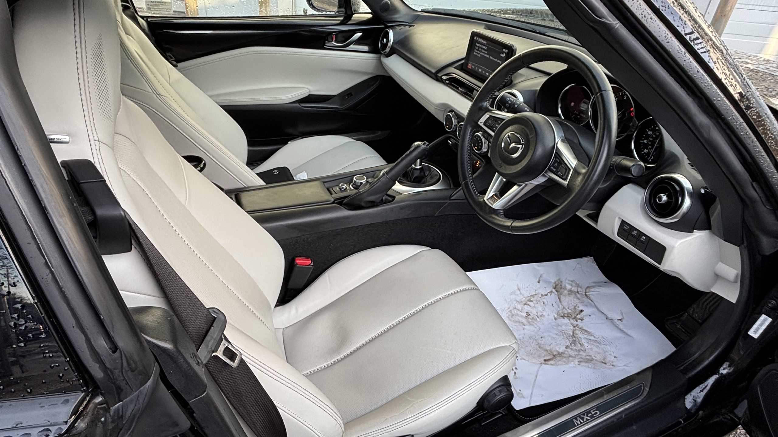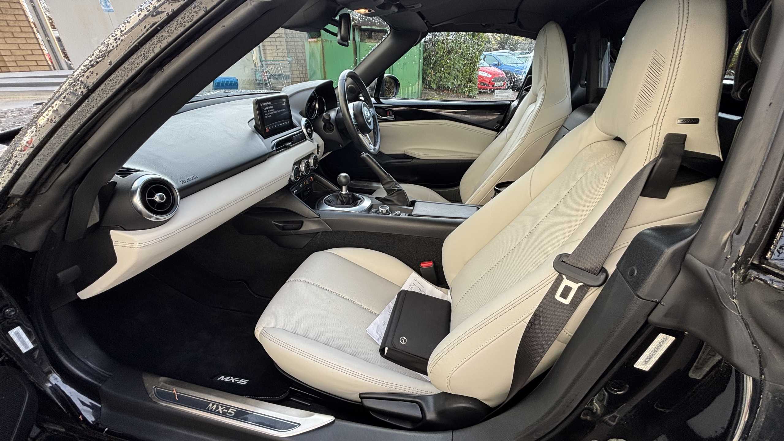 "features": "7\" colour touch screen with Mazda connect infotainment, Aha and stitcher app, Analogue speedometer, Apple car play/Android Auto, Blind spot monitoring with rear cross traffic alert, Cruise control + speed limiter, Driver alert system, eCall emergency call system, Emergency stop signalling system, Engine start/stop button, Hands free phone preparation, Integrated bluetooth with hands-free calling, bluetooth audio and easy access to phone contacts, Integrated navigation system, Lane departure warning system, Multi dot display tachometer and electric odometer, PAS, Rear parking sensor, Reversing camera, Service indicator, Traffic sign recognition, Trip computer, Water temperature gauge, I-ELOOP, i-stop, Limited slip differential, Sports suspension featuring Bilstein dampers, 2 USB/aux input socket, Multimedia Commander including separate volume dial, Premium Bose sound system with 9 speakers with 2 in each front headrest, AM/FM/DAB radio and MP3, Steering wheel mounted audio/bluetooth controls, Adaptive LED Headlights, Auto dimming rear view mirror, Automatic headlamp levelling, Body colour bumpers, Body colour co ordinated interior upper door trim, Coming/leaving home lighting function, Dual exhaust pipes, Dusk sensitive headlamps, Electric front windows/one touch facility, Electrically operated retractable hard top with heated rear glass window, High mounted rear brake light with Black coloured cover, LED 3rd brake light, LED daytime running lights, LED indicator lights, LED rear lights, Piano black electric/heated door mirrors, Piano Black fashion bars, Rain sensing front wipers, Stainless steel scuff plates with MX-5 logo, 12V socket, Centre console storage box, Chrome Air conditioning dials, Climate control air conditioning, Coin Box, Driver and front passenger sunvisors with covered vanity mirror and driver ticket holder, Driver seat manual slide, recline and tilt adjustment, Front centre armrest, Front head restraints, Gear shift indicator, Heated front seats, in 3 heat levels, Interior courtesy light, ISOFIX front passenger seat child seat compliance, Leather gear knob, Leather handbrake lever, Leather steering wheel, Lockable rear centre box with lid, Passenger seat + manual slide/recline adjust, Perforated nappa leather upholstery, Side door trim in light stone vinyl with light stitching, Single front passenger seat, Sports seats, Strut brace, Tilt/telescopic steering column, Transparent windblocker, Two cupholders, 3 point ELR front seatbelts with pretensioners, ABS+Electronic Brake force Distribution, Deployable Hood System (DHS), Driver and front passenger airbags, Driver and passenger seatbelt reminder audible warning, Front dynamic yaw stability control, Hill hold assist, Passenger airbag deactivate switch, SCBS - Smart City Brake Support, rear plus front with autonomous emergency braking, Side airbags, Traction control, Tyre pressure monitor, Remote central locking with deadlocking and remote boot release, Smart keyless entry, Superlocking, Thatcham category 1 alarm + immobiliser, Chrome air vent surrounds, Chrome meter rings, Dashboard panel - vinyl leather Light Stone, 17\" BBS Gun Metallic alloy wheels, Tyre puncture repair kit, ",