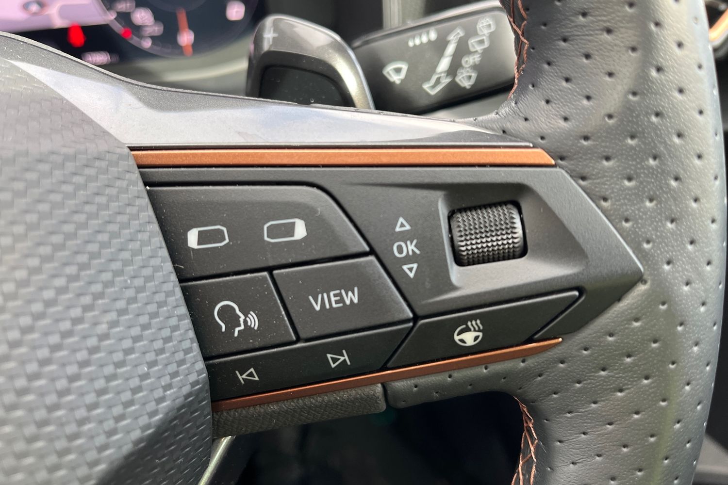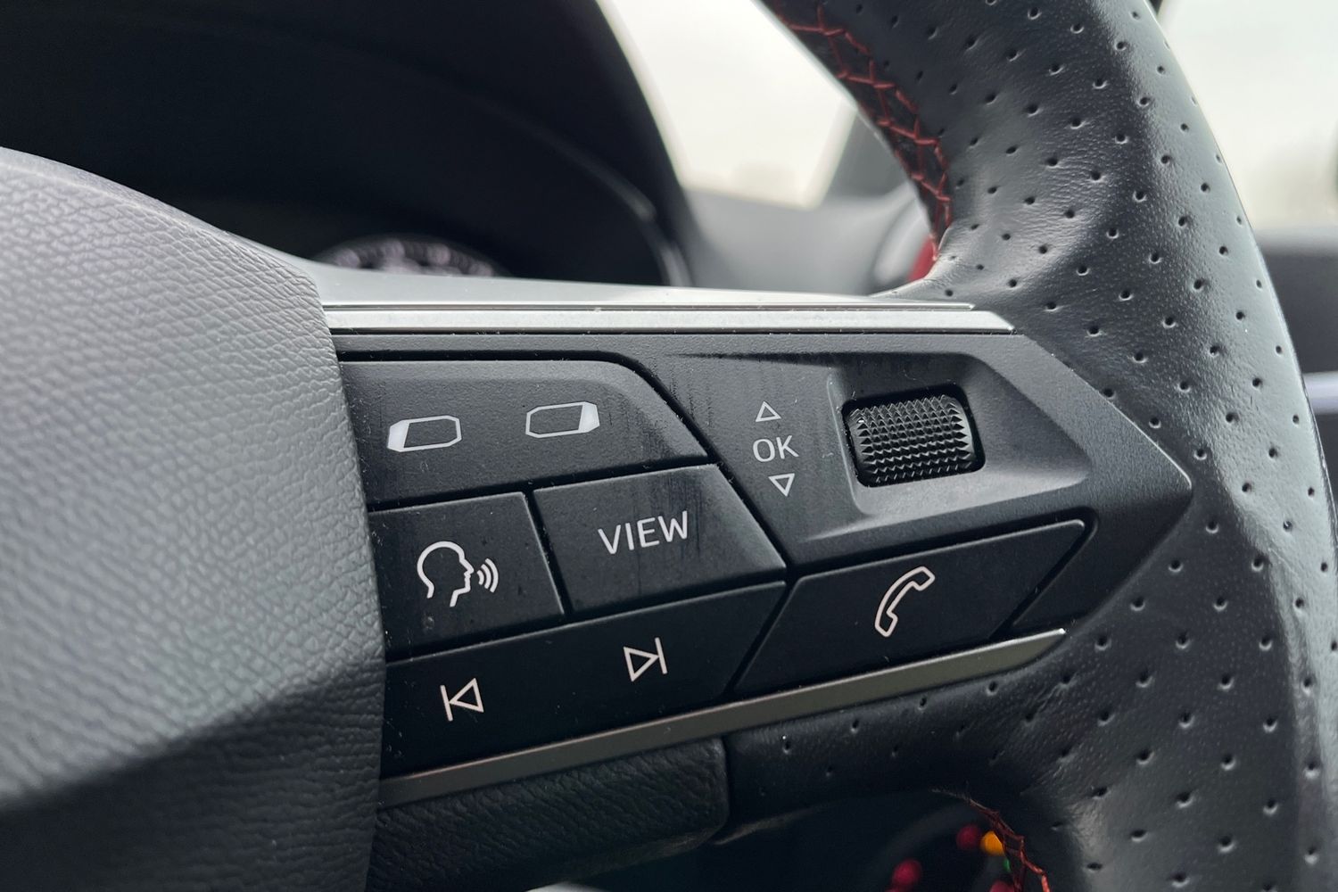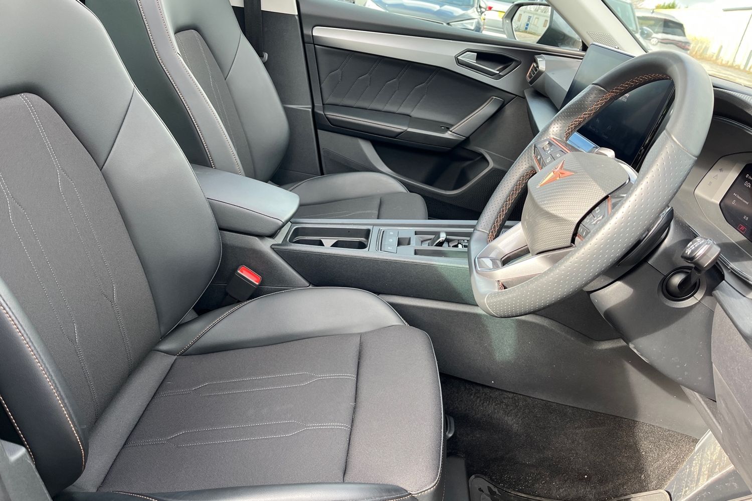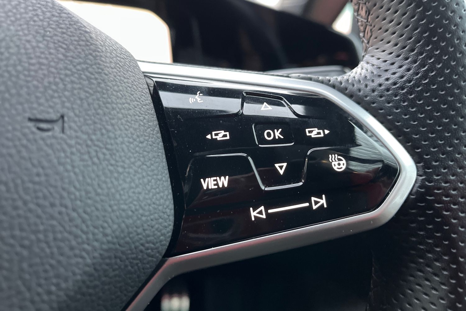 "Steering wheel in black leather with black stitching",
