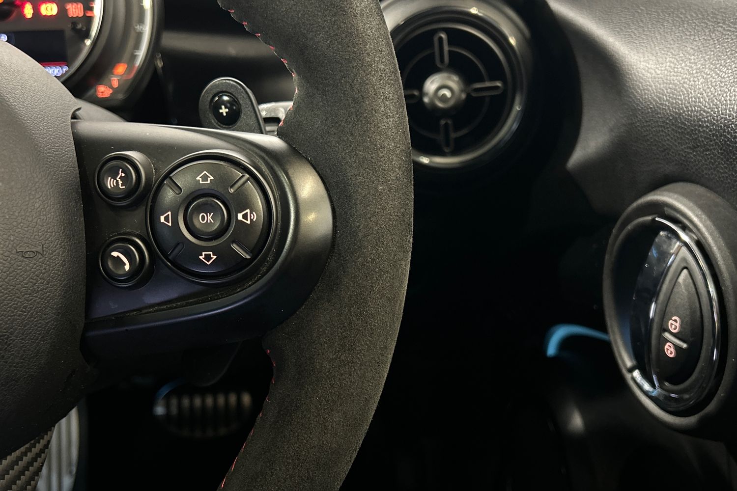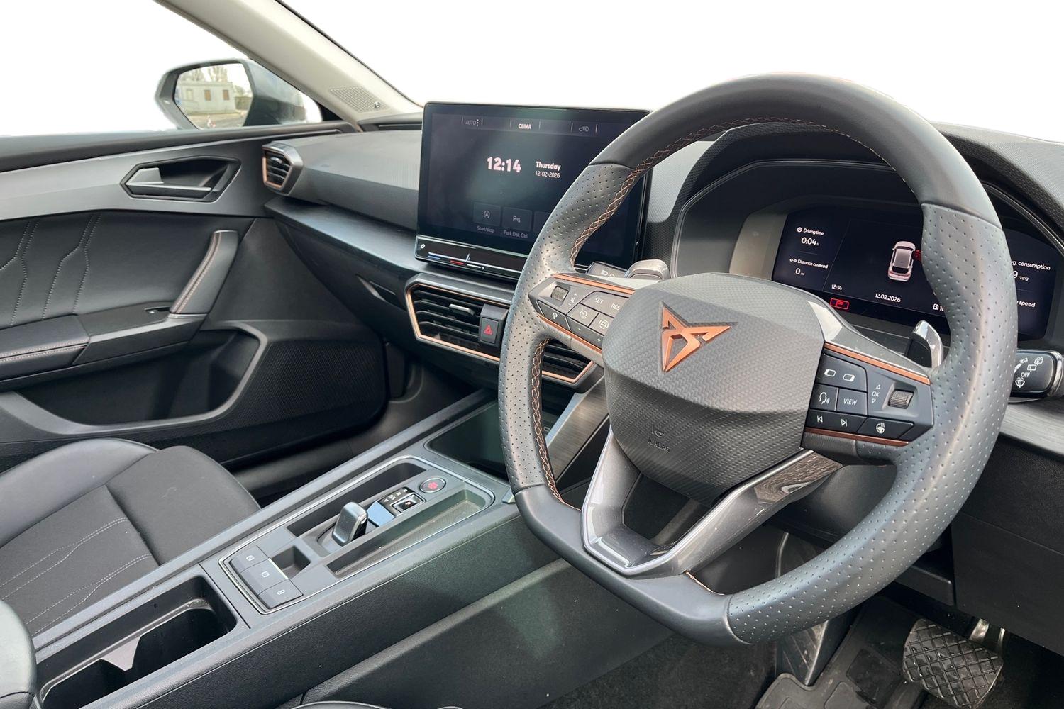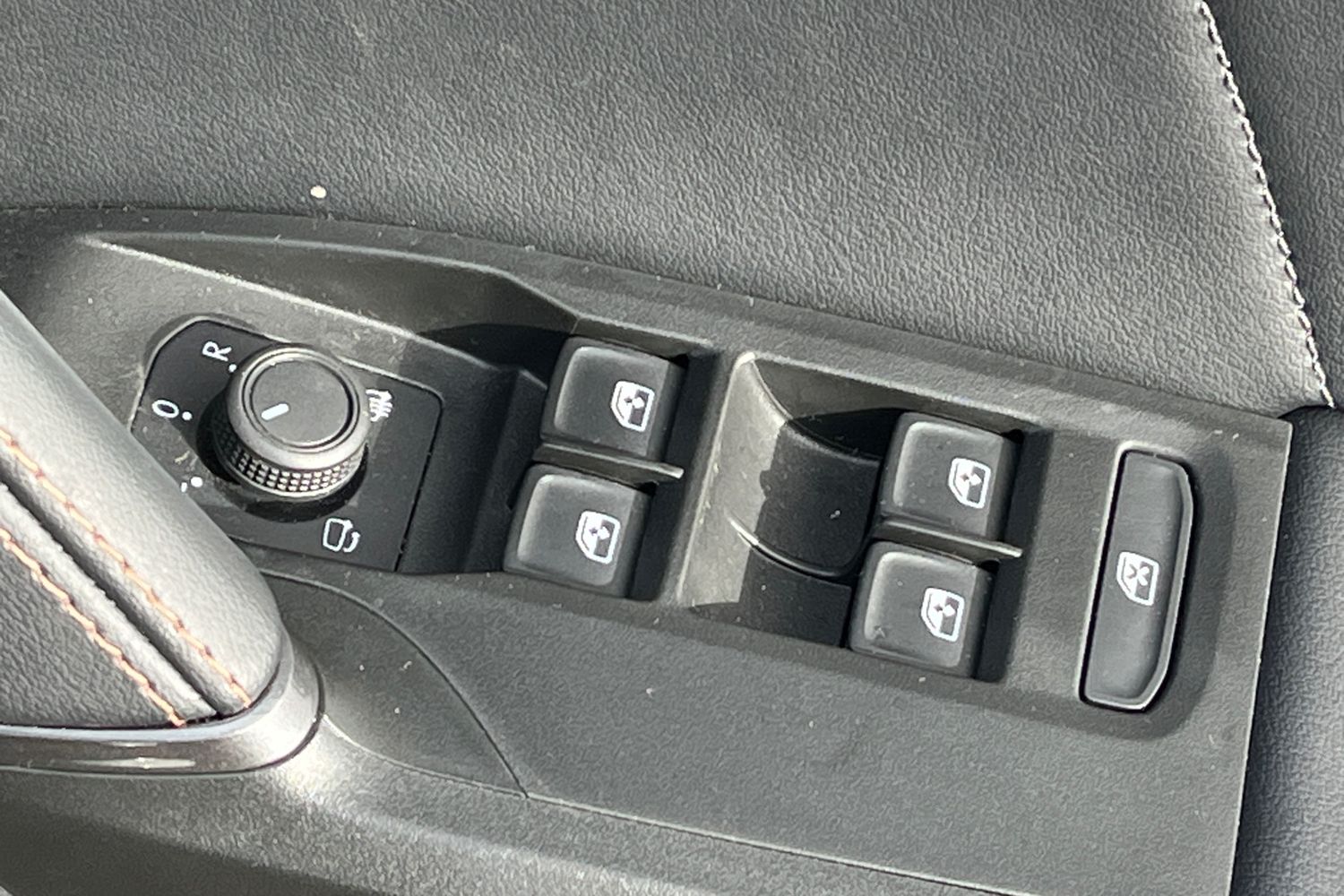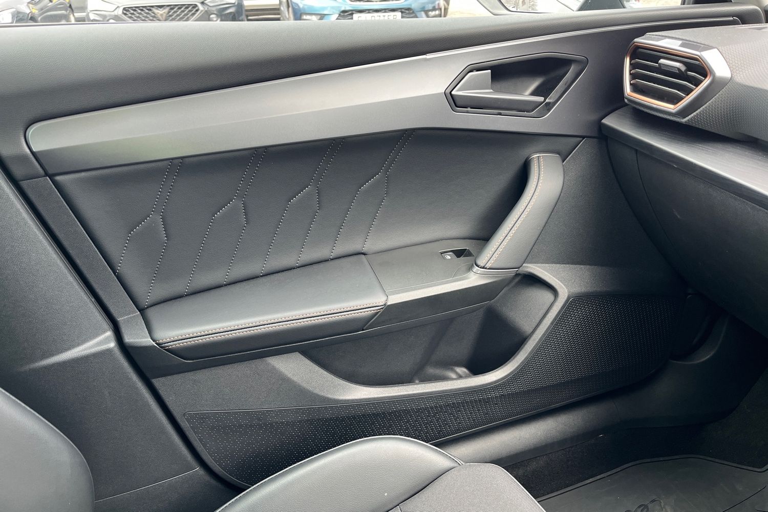 "Steering wheel in black leather with black stitching",