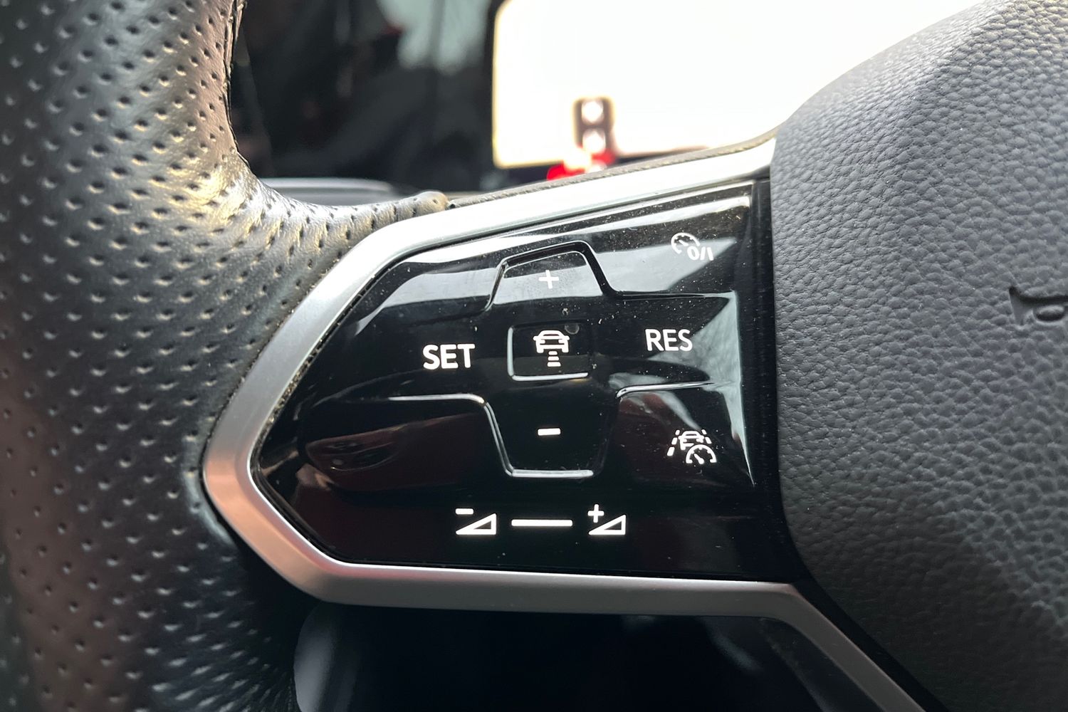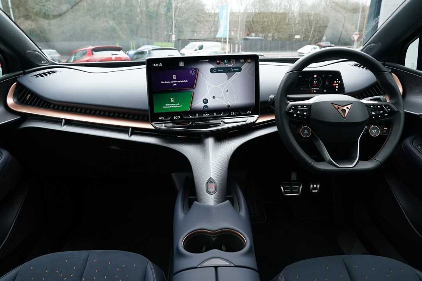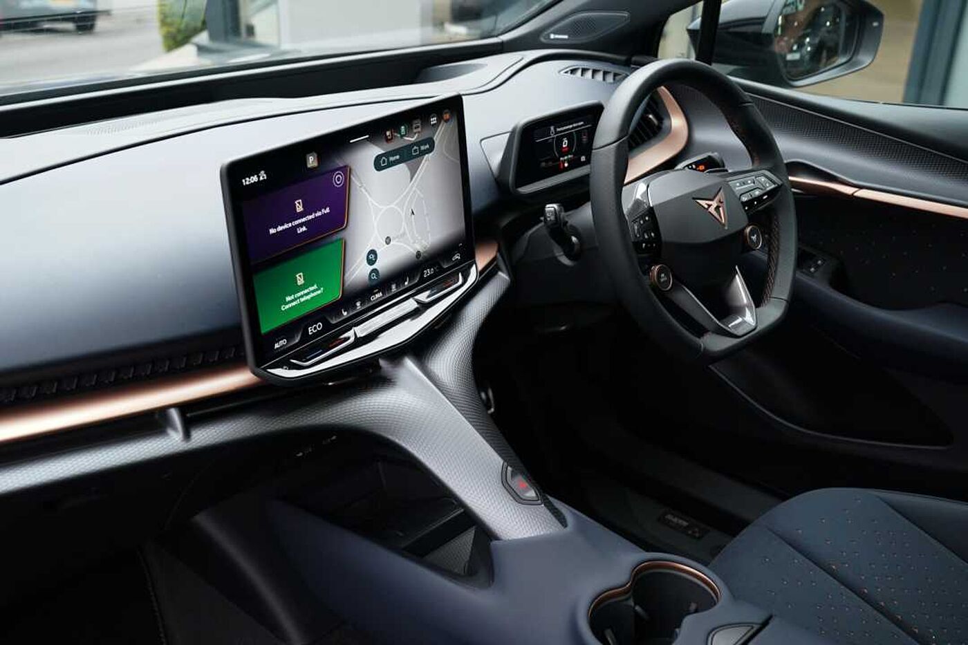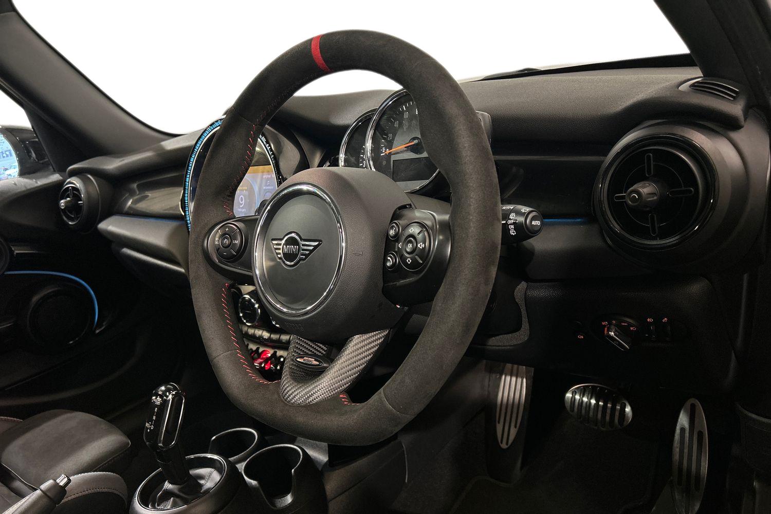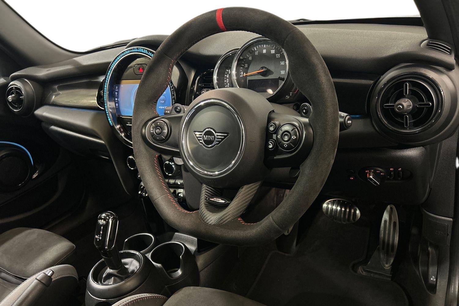 "Steering wheel in black leather with black stitching",