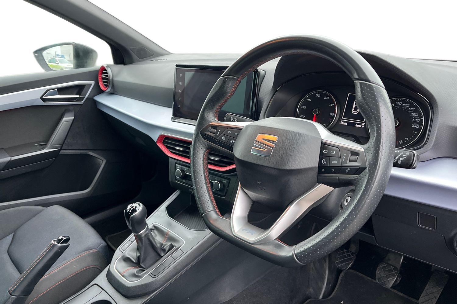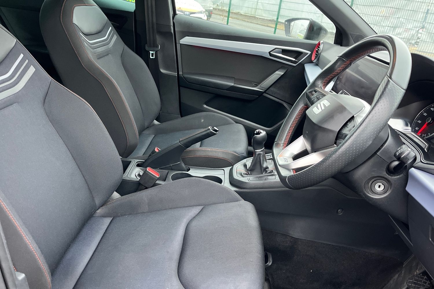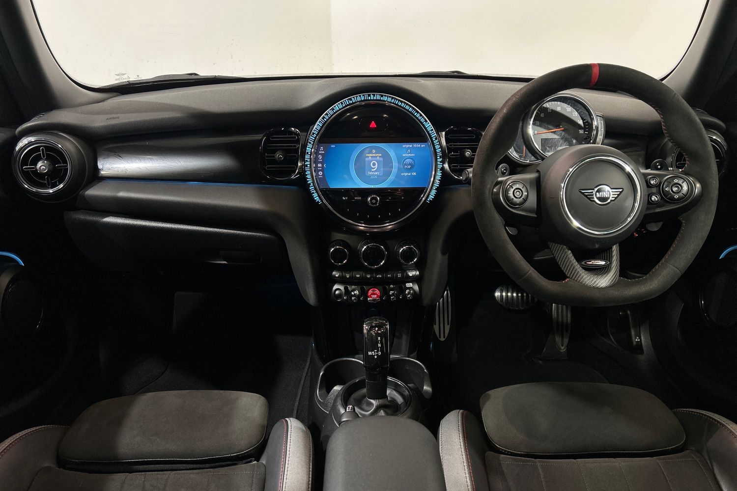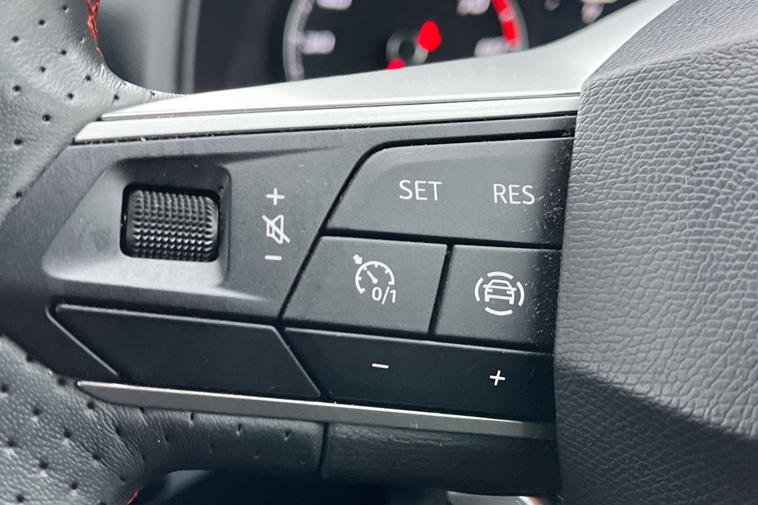 "Steering wheel in black leather with black stitching",