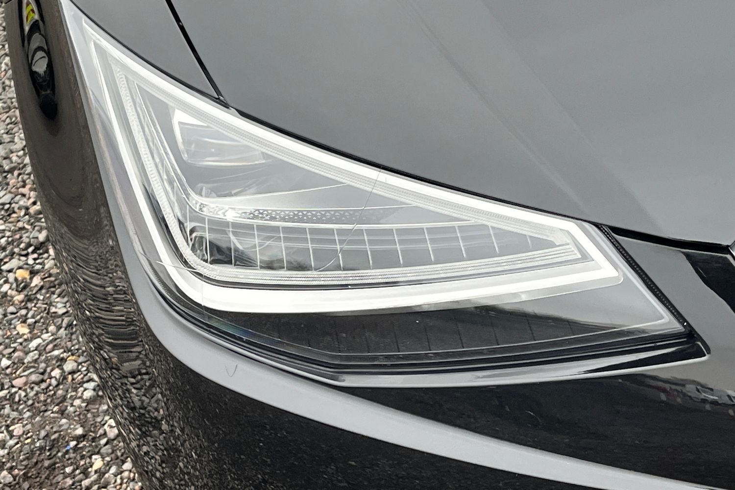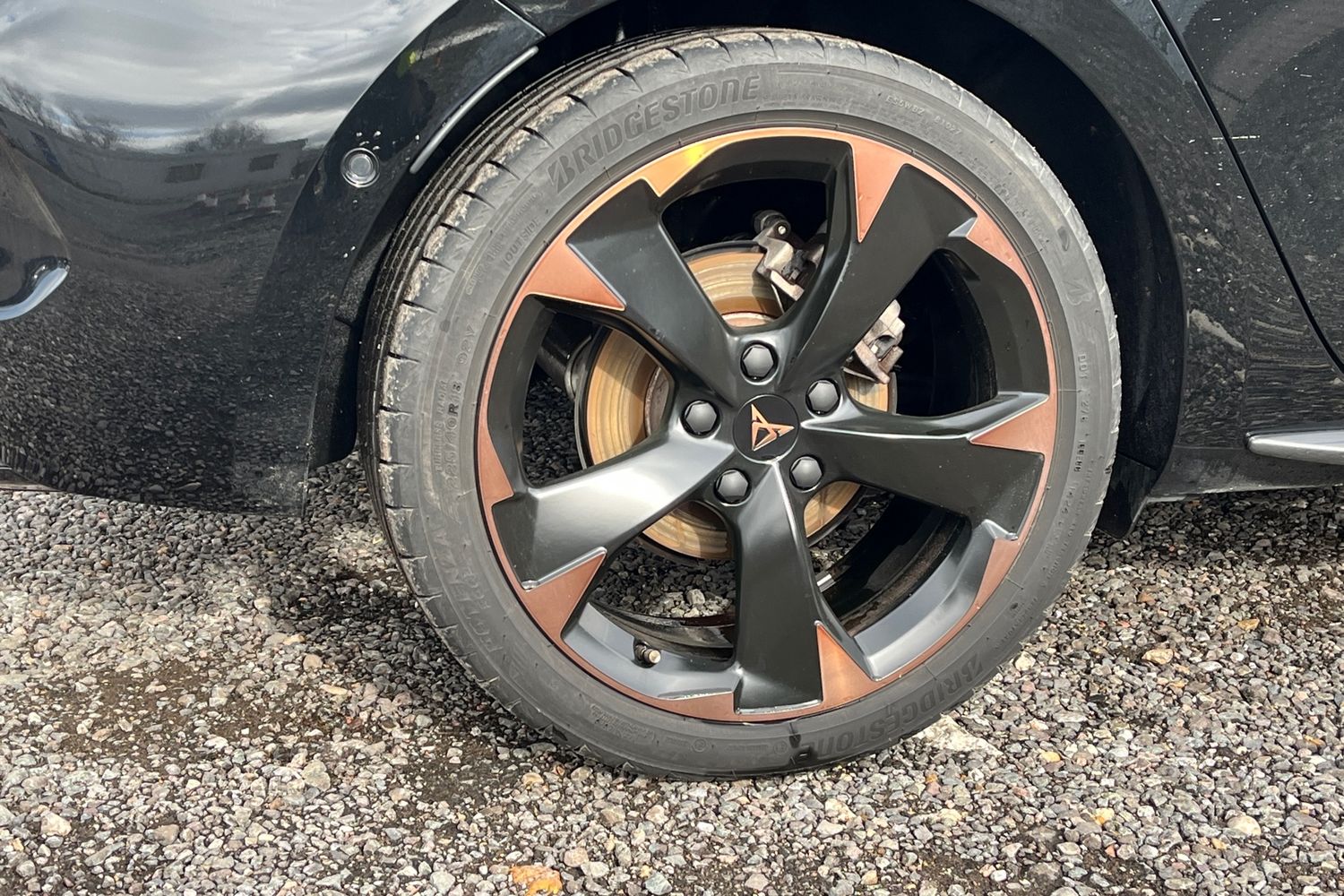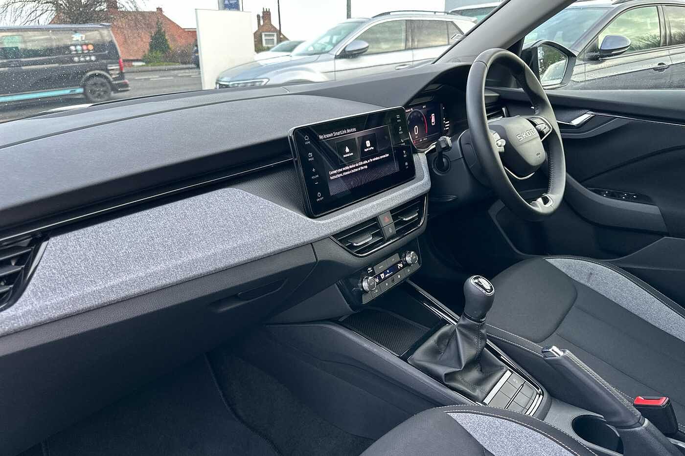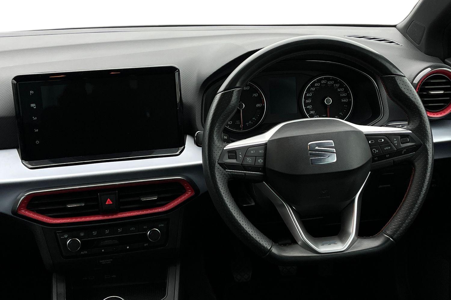 "Steering wheel in black leather with black stitching",