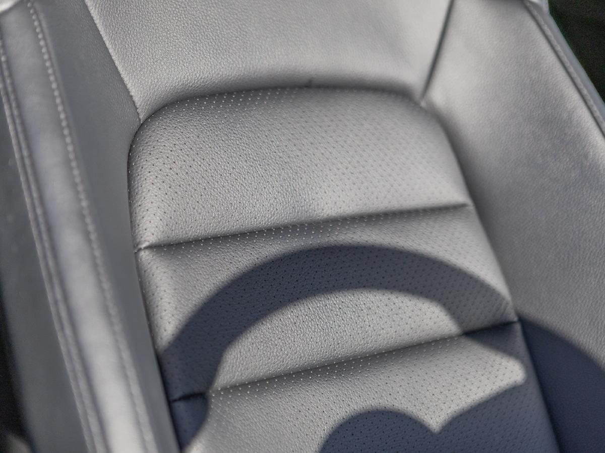 "Cloth upholstery with black and metallic grey syntech leather inserts",
