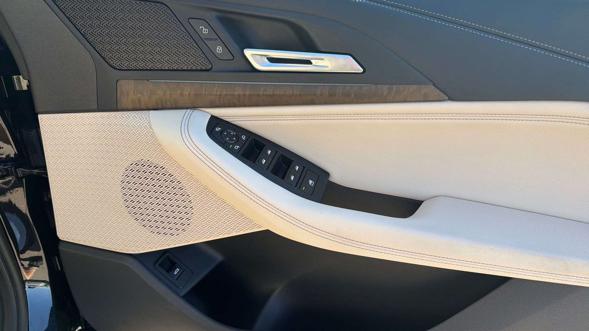 "Smooth finish leather on steering wheel rim, door handles, door panel armrests and centre console storage compartment lid",