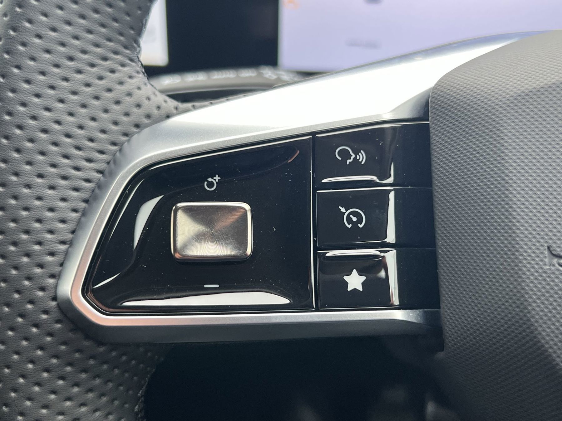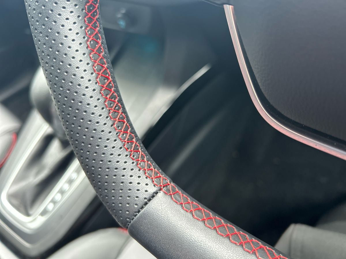 "Premium sensico perforated flat bottomed steering with metal grey stitching",