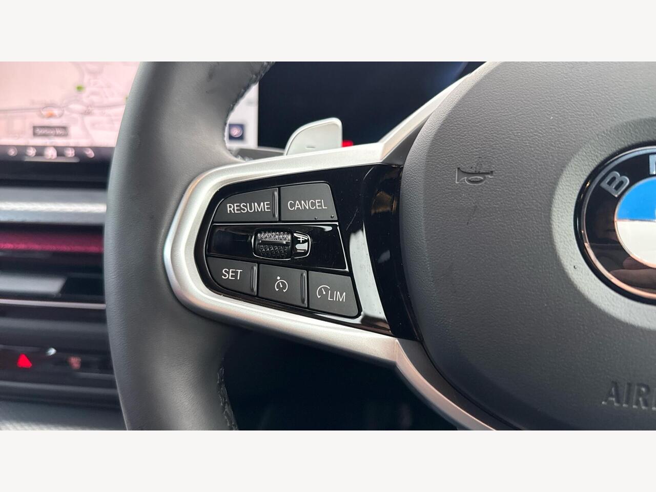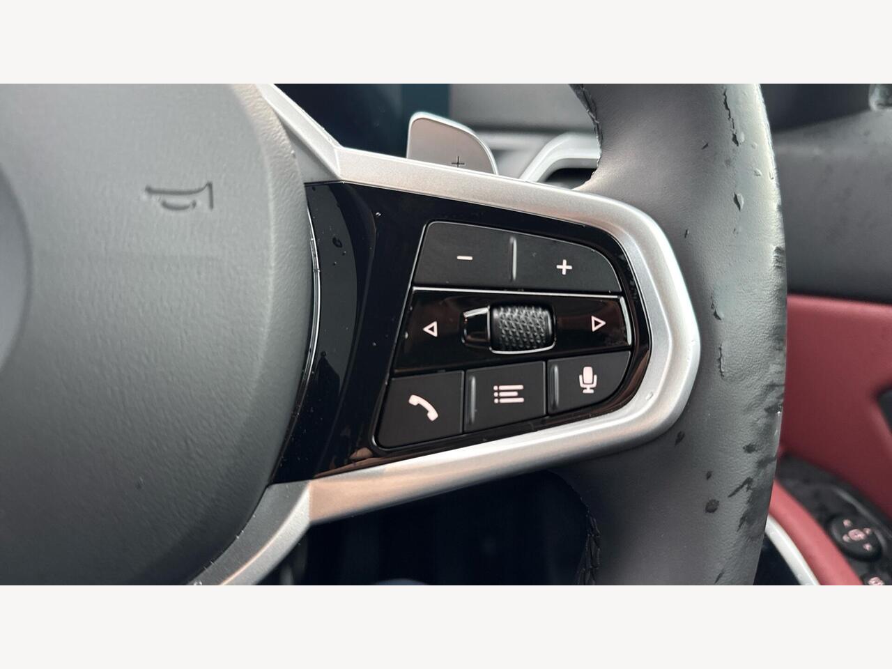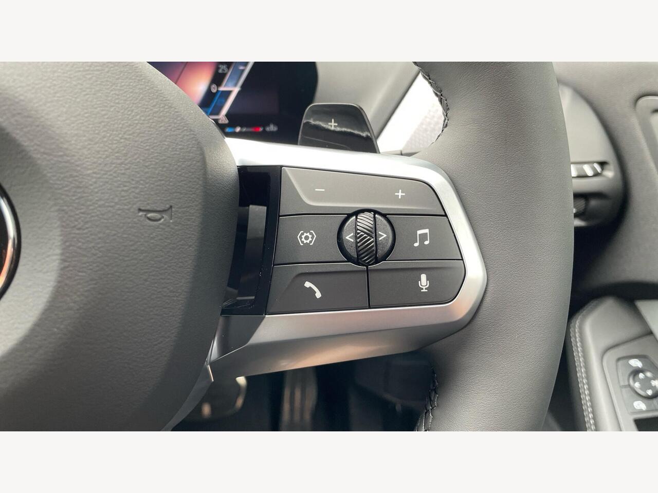 "Three spoke leather wrapped multifunction steering wheel with shifting paddles"