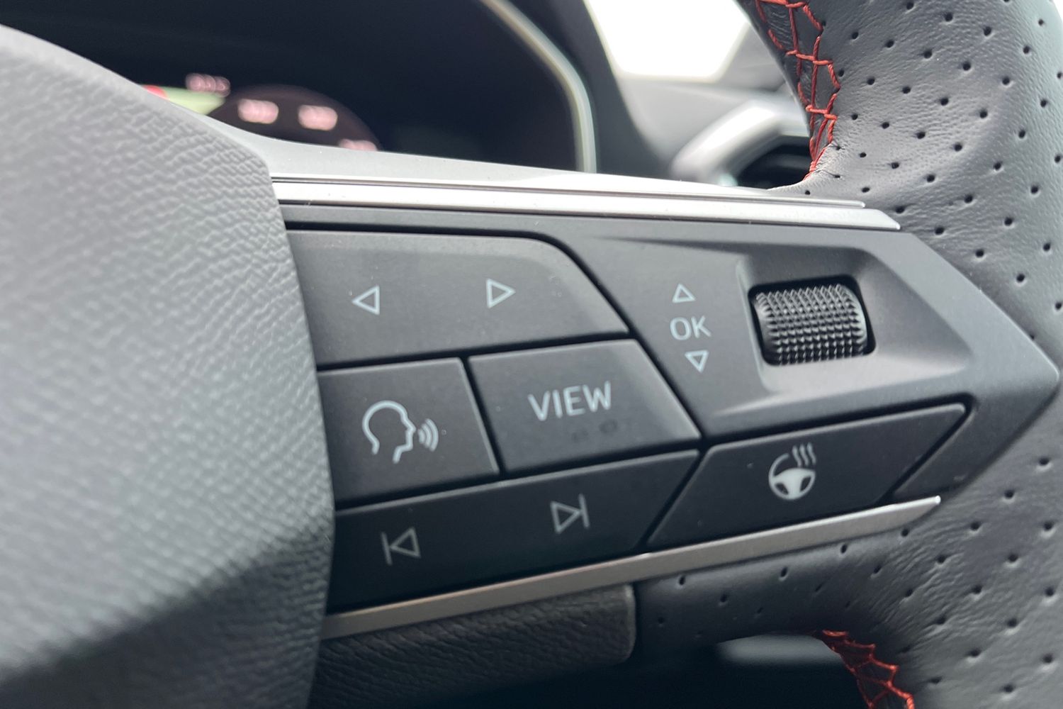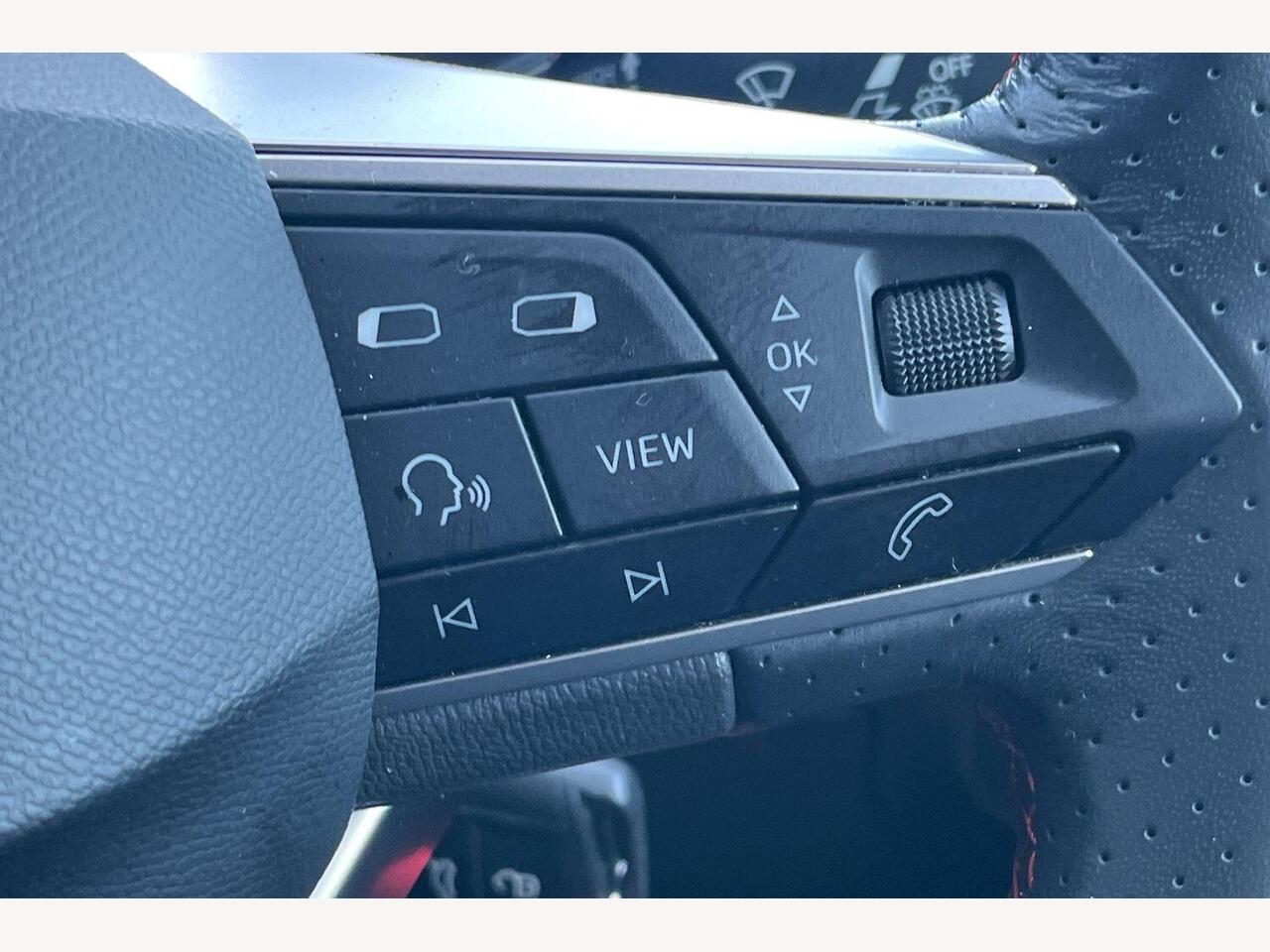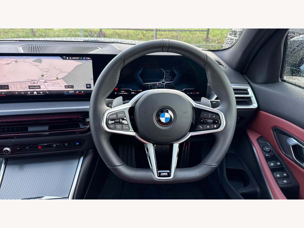 "Three spoke leather wrapped multifunction steering wheel with shifting paddles"