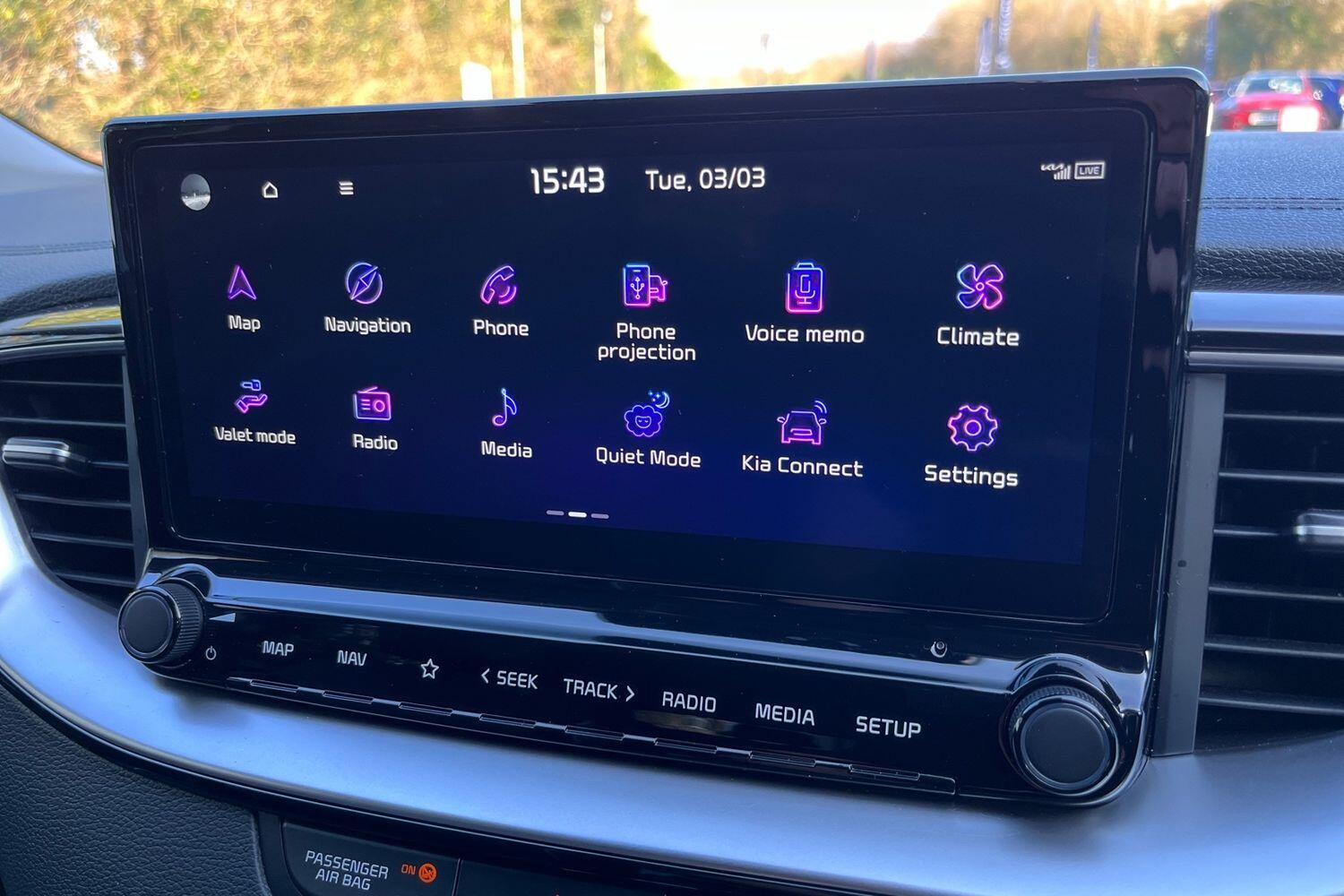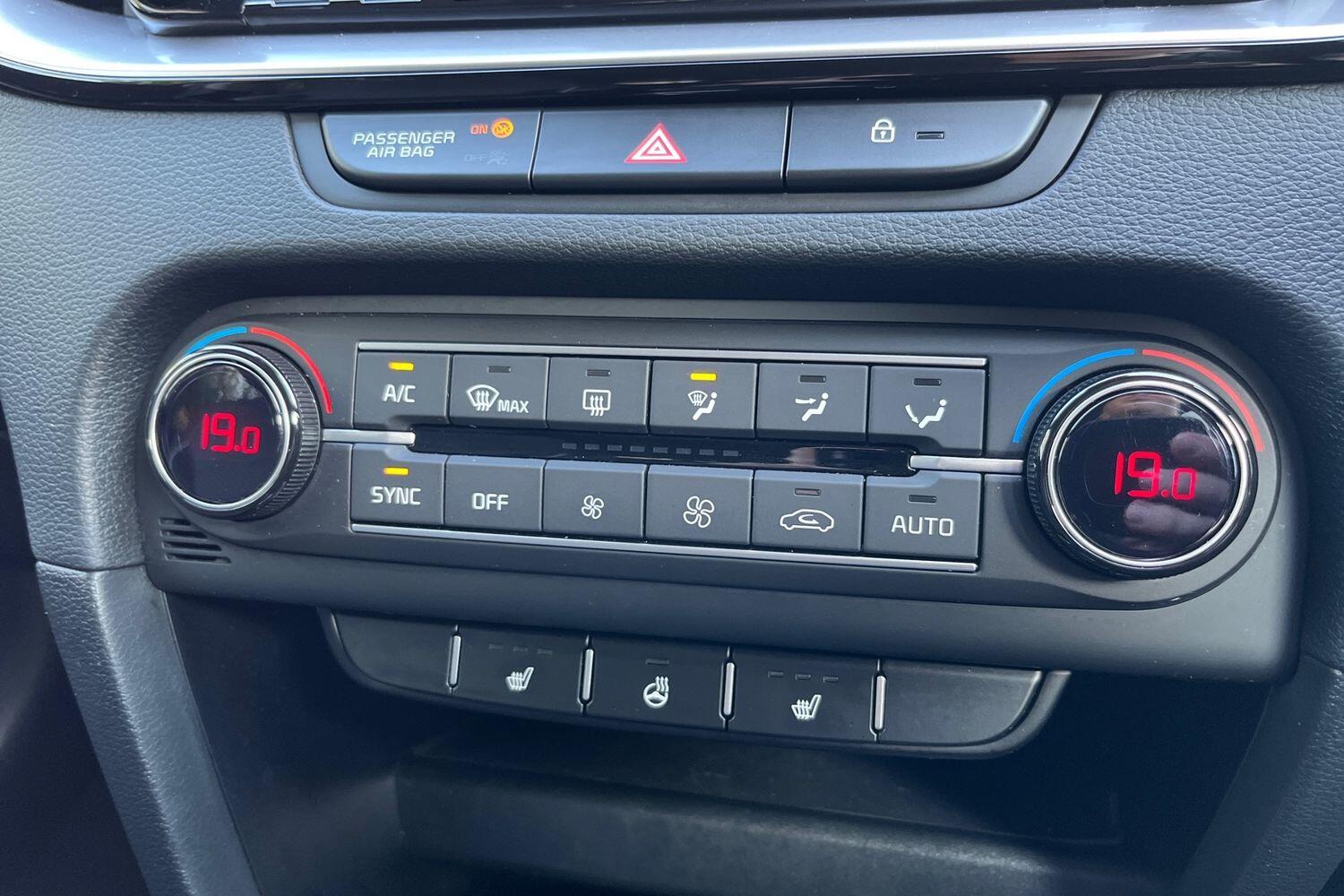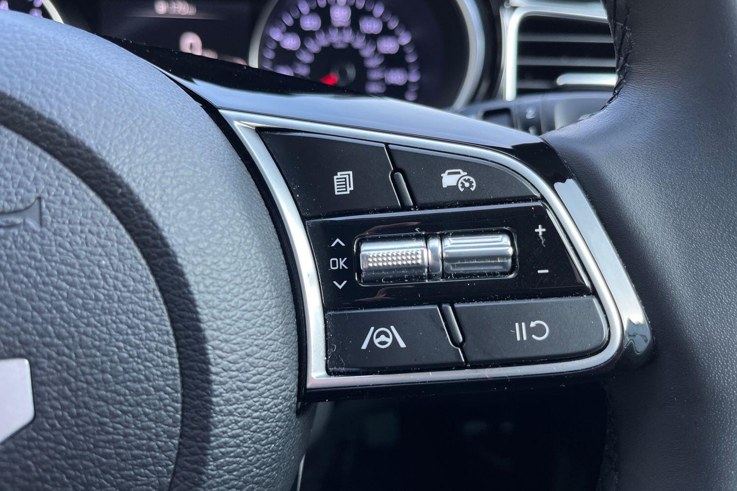 "features": "10.25\" touchscreen satellite navigation, 4.2\" supervision colour cluster display, Apple car play/Android Auto with voice control, Bluetooth with Voice Recognition & Music Streaming, Cruise control + speed limiter, Driver attention warning + (DAW) with leading vehicle departure warning, Emergency call service, Emergency stop signalling system, Forward Collision-Avoidance Assist (FCA) - City/Pedestrian/Cyclist, Kia connect UVO, Lane Following Assist (LFA), Lane keep assist, Manual speed limit assist, Motor driven power steering, Rear parking sensor, Reversing camera system with dynamic guidelines (Integrated into centre fascia screen), Trip computer, Intelligent Stop and Go, 6 speaker audio system, DAB Radio with MP3, Illuminated USB ports, Steering wheel mounted controls, USB Fast Charger in Front Centre Console, USB type A port, All-round Electric Windows with Front Auto Up & Down Function, Auto dimming rear view mirror, Automatic defog system, Automatic headlights control, Body colour bumpers, Body colour door mirrors, Body colour exterior door handles, Body colour rear roof spoiler, Chrome window surround, Electric adjustable/heated/folding door mirrors with LED Indicators, Heated rear window with timer, High beam assist, High gloss black and white chrome coated radiator grille, LED daytime running lights, LED front fog lights, LED Headlights, LED High-mounted Brake Light, LED rear combination lights, Privacy glass (rear side windows and tailgate), Rain sensing front wipers, Rear side wing doors, Rear wash/wipe, Roof rails, Tinted glass, Wide view drivers door mirror, Windscreen Washer Level Warning, 1 x Front 12V socket, 12V power socket in luggage compartment, 3 seat bench in 2nd row, 3 x passenger assist grips, 60/40 split folding rear seat, All-round height adjustable headrests, Centre console storage box/armrest, Cloth upholstery with faux leather bolsters, Cupholders in centre console, Cupholders in rear armrest, Dash illumination dimmer switch, Door courtesy lamps, Driver & Front Passenger Sunvisors with Vanity Mirror Illumination & Ticket Holder, Driver + front passenger electric lumbar support, Driver's seat height adjuster, Dual Height Luggage Area Floor, Dual zone automatic air conditioning, Faux leather door centre trim, Front and rear door storage, Front cabin map light with sunglasses case, Front Passenger Seat Height Adjuster, Front seat back pockets, Heated front seats, Heated steering wheel, Interior door lock/unlock function, ISOFIX Child seat top tethers and anchor fixings, Leather handbrake, Leather trimmed steering wheel, Luggage area light, Luggage area parcel shelf, Luggage hooks, Rear centre armrest, Rear coat hooks, Single front passenger seat, Tilt/telescopic adjustable steering wheel, All round 3-point seatbelts, Anti-lock braking system (ABS), Brake assist system, Dual front side airbags, Dual horn, EBD - Electronic brakeforce distribution, Electronic parking brake, Electronic stability control (ESC) and vehicle stability management (VSM), Front passenger airbag cut-off switch, Height adjustable front seatbelts, Hill start assist control (HAC), Impact sensing auto door unlocking, Rear door child safety locks, Seatbelt reminder warning, Twin curtain airbags, Twin front airbags, Tyre pressure monitoring system, Alarm system, Engine Immobiliser & Deadlocks, Engine Start/Stop Button with Smart Entry System, Locking wheel nuts, Speed sensitive auto door locking, Satin Chrome Fascia Trim, 17\" Alloy wheels, Tyre mobility kit, ",