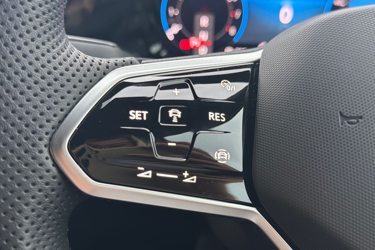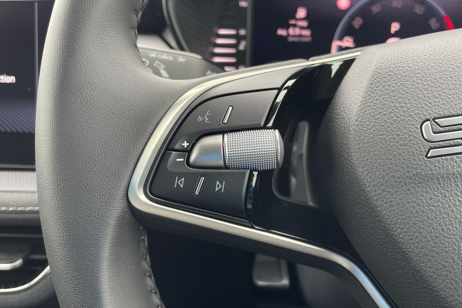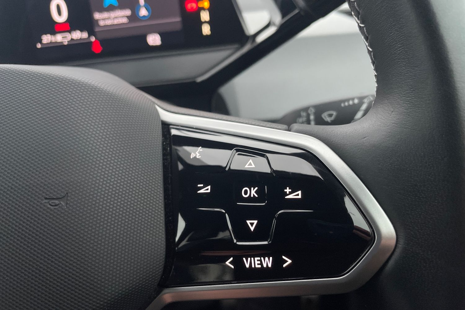 "Flat bottomed perforated leather steering wheel with white stitching and CUPRA logo",