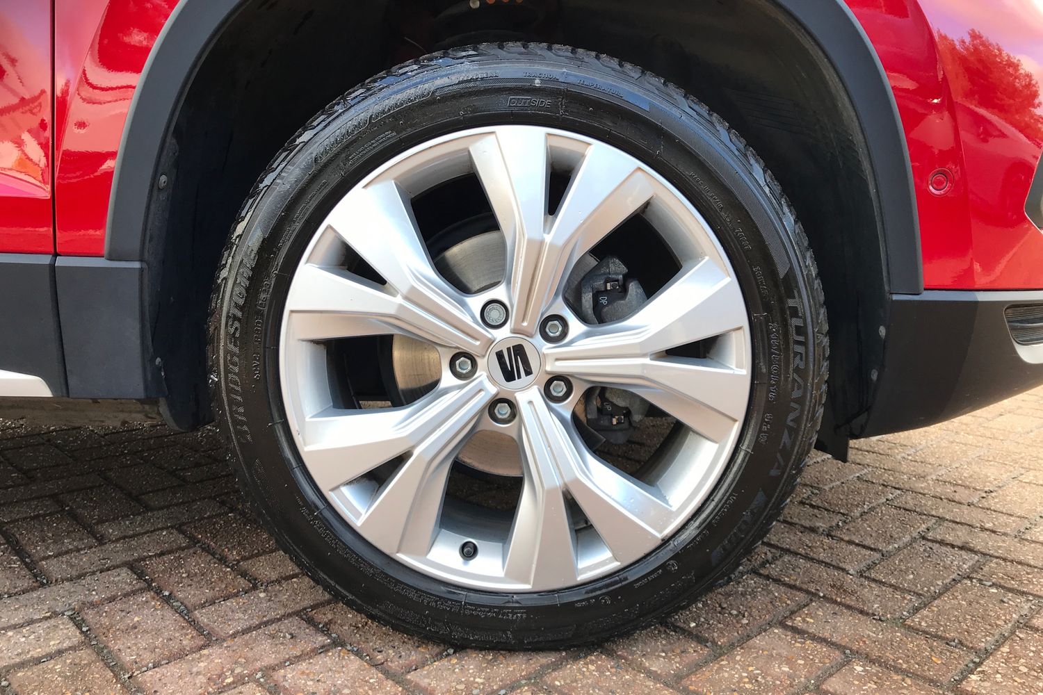 "Front and rear black brake calipers with cupra logo",