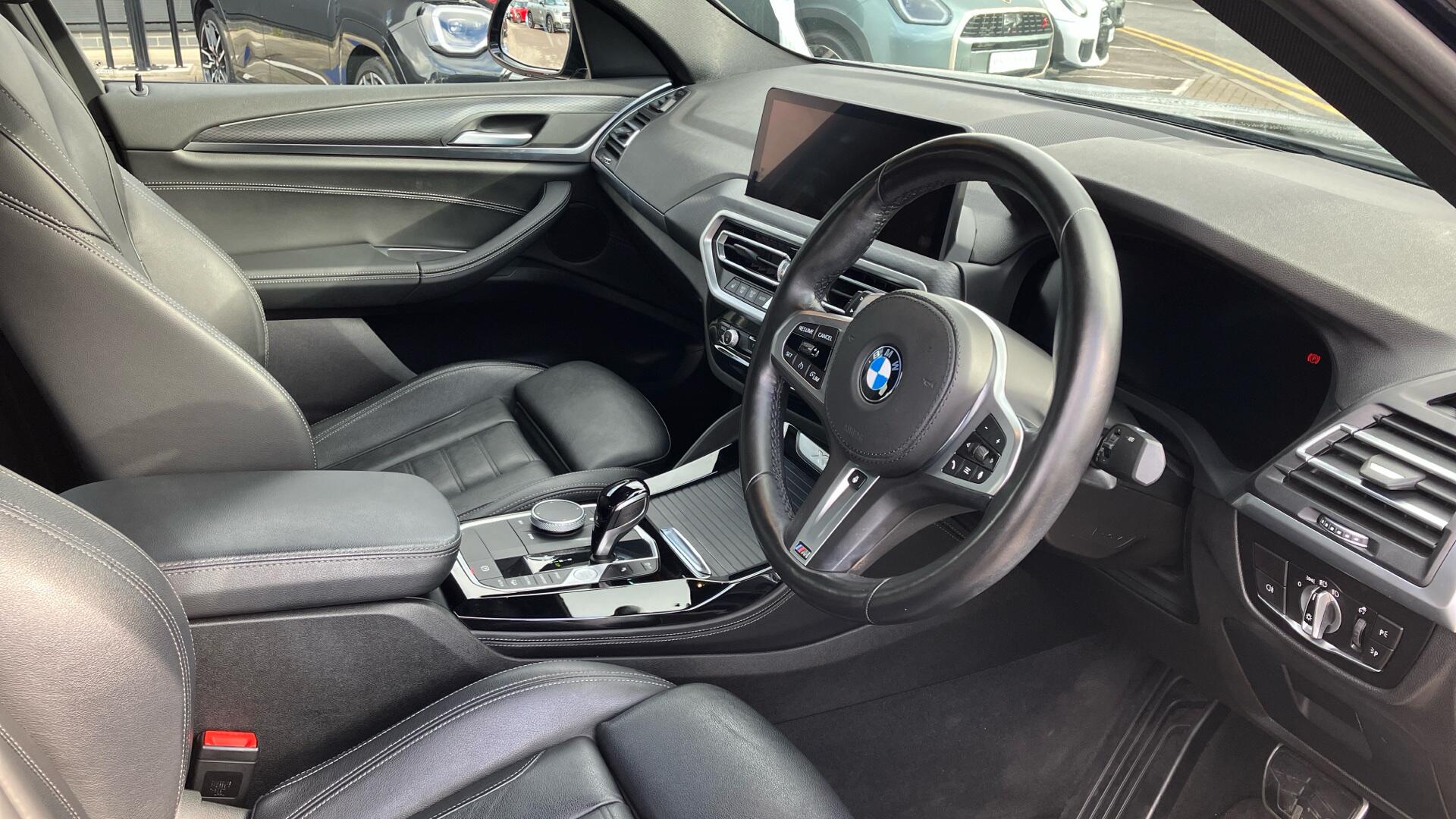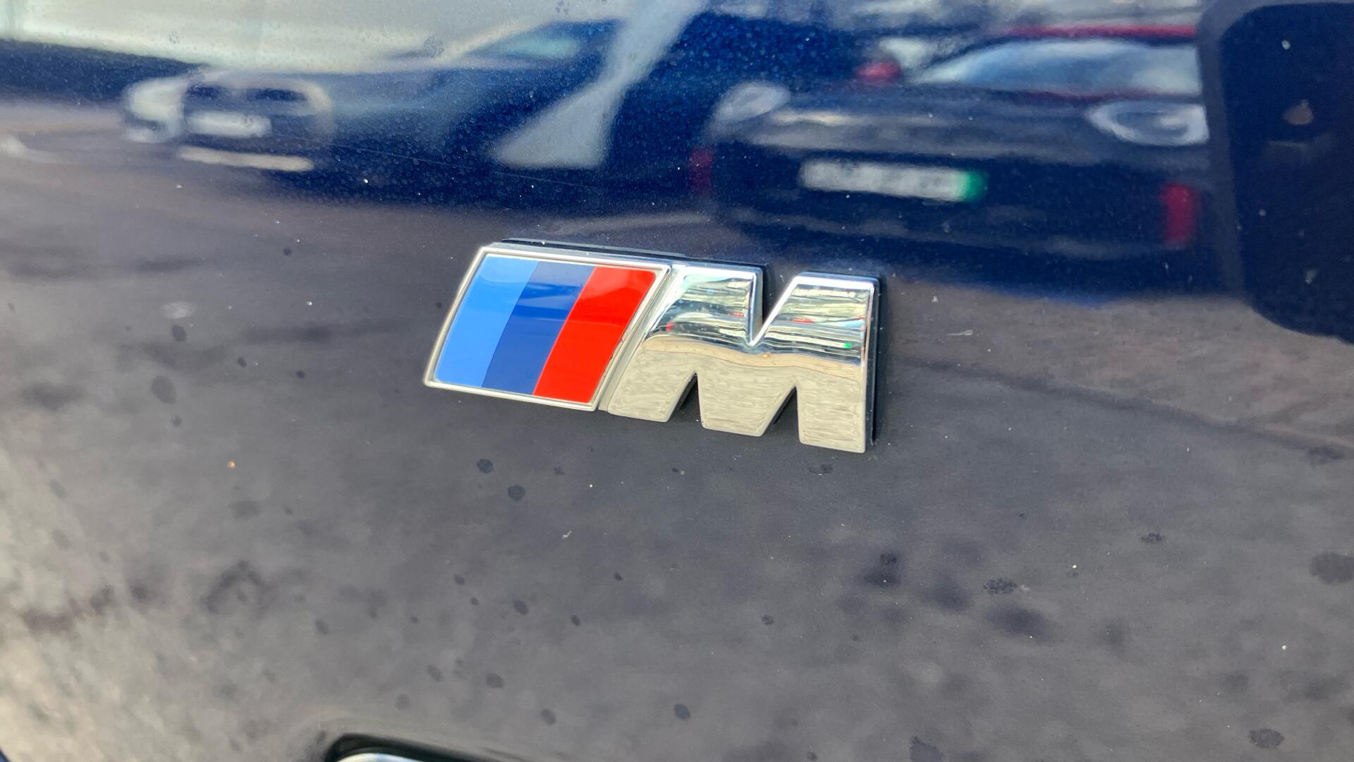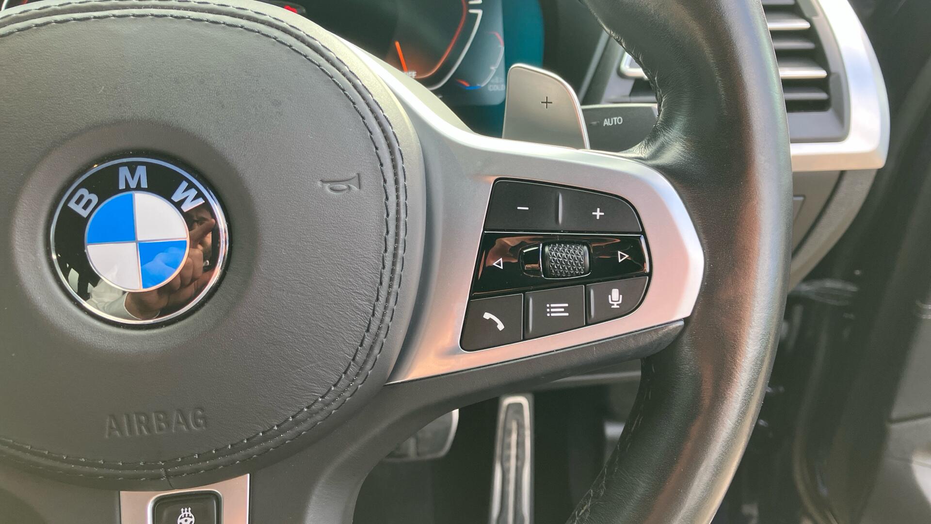 "3 spoke sports leather steering wheel with black leather and stitching, pearl chrome decorative finish, specific M Badge",