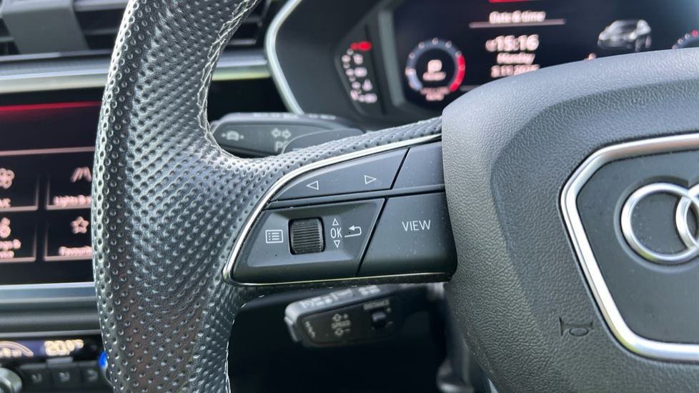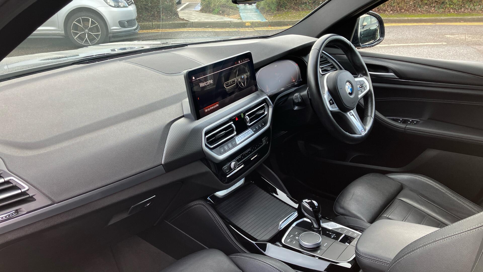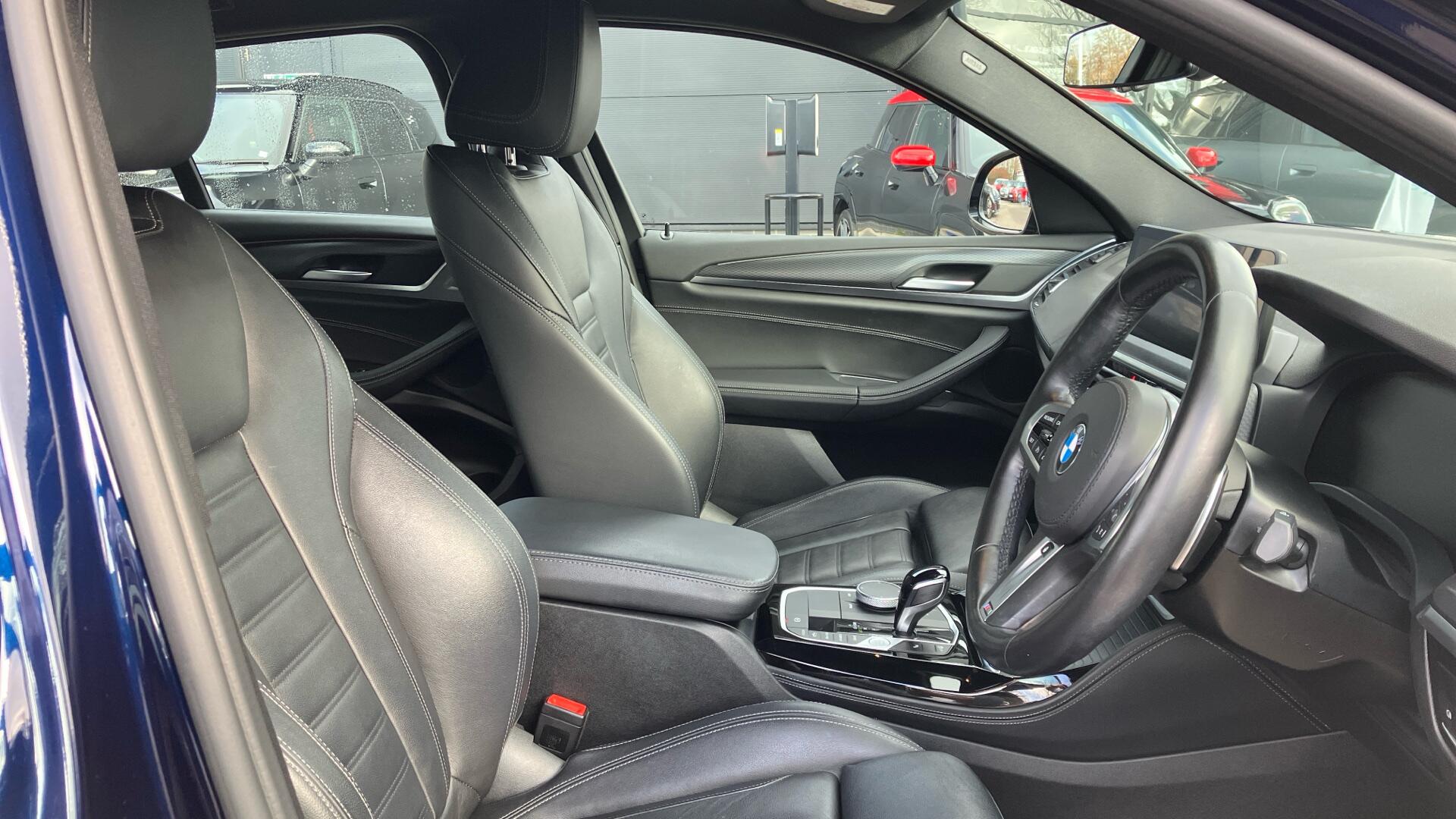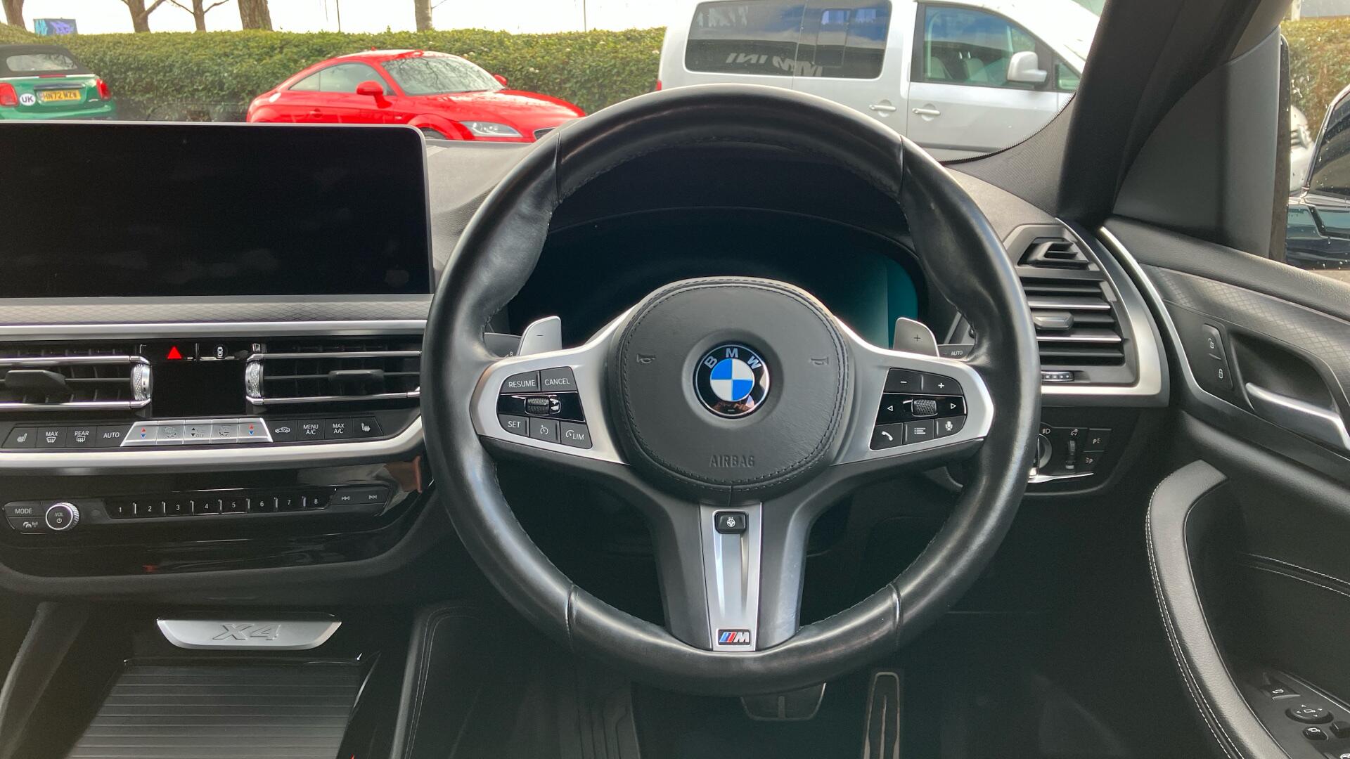 "3 spoke sports leather steering wheel with black leather and stitching, pearl chrome decorative finish, specific M Badge",