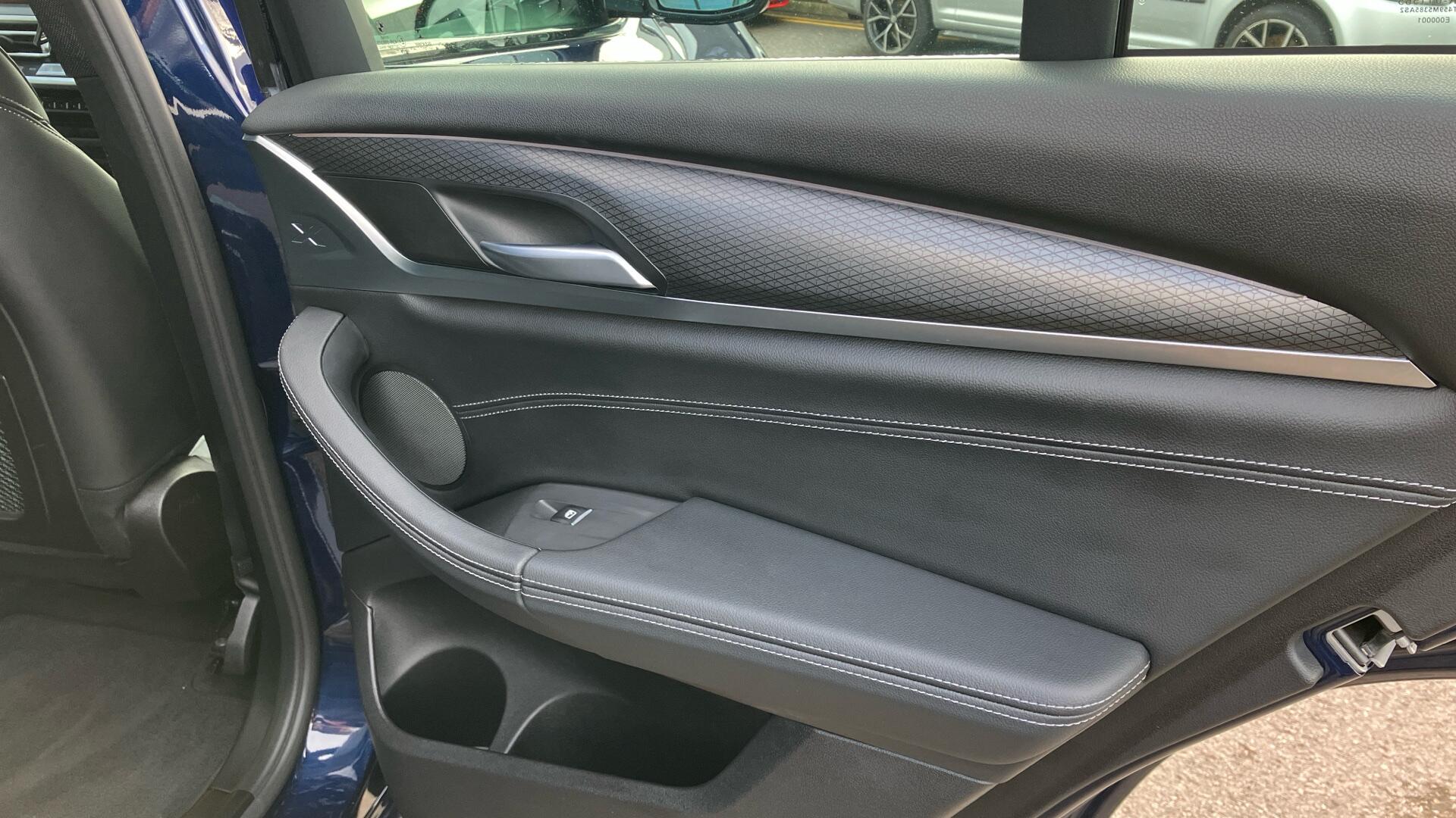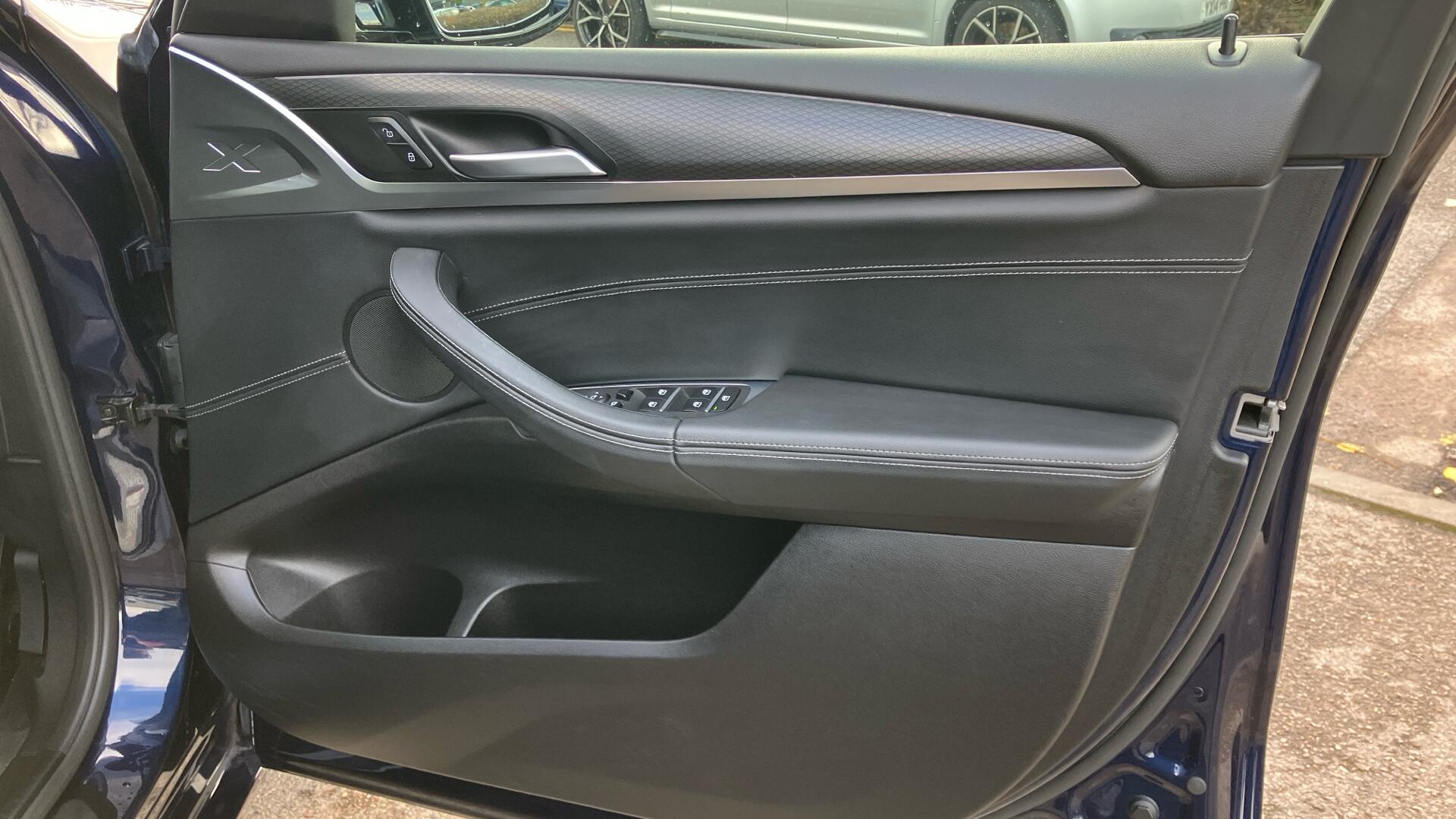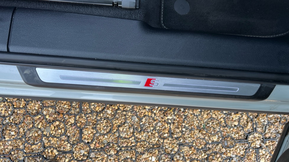 "Front door sill finishers in black plastic with M designation in metallic look",