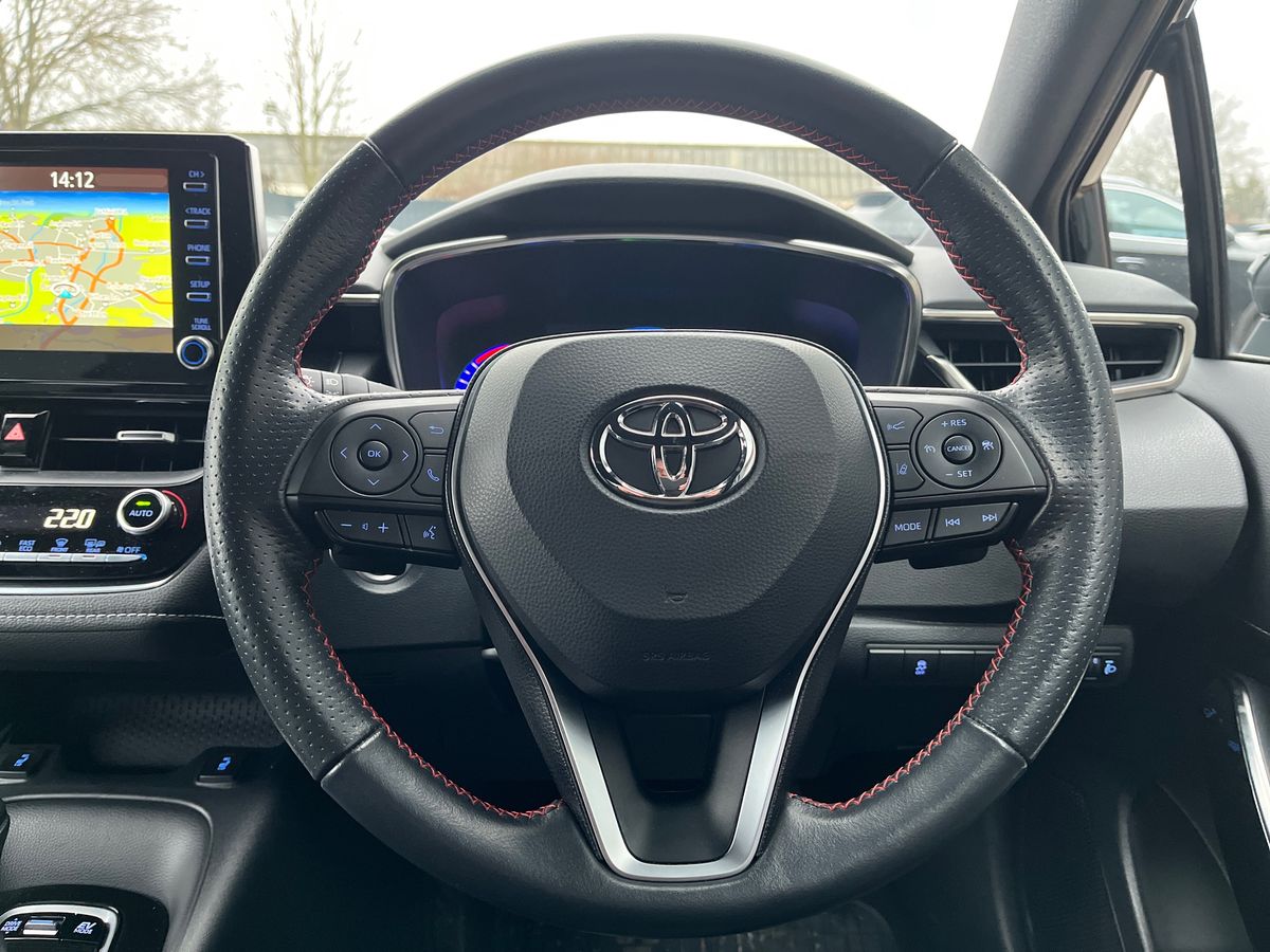 "3 spoke leather steering wheel with multi-function buttons with touch control, flattened on top and bottom, with S badging and contrast stitching",