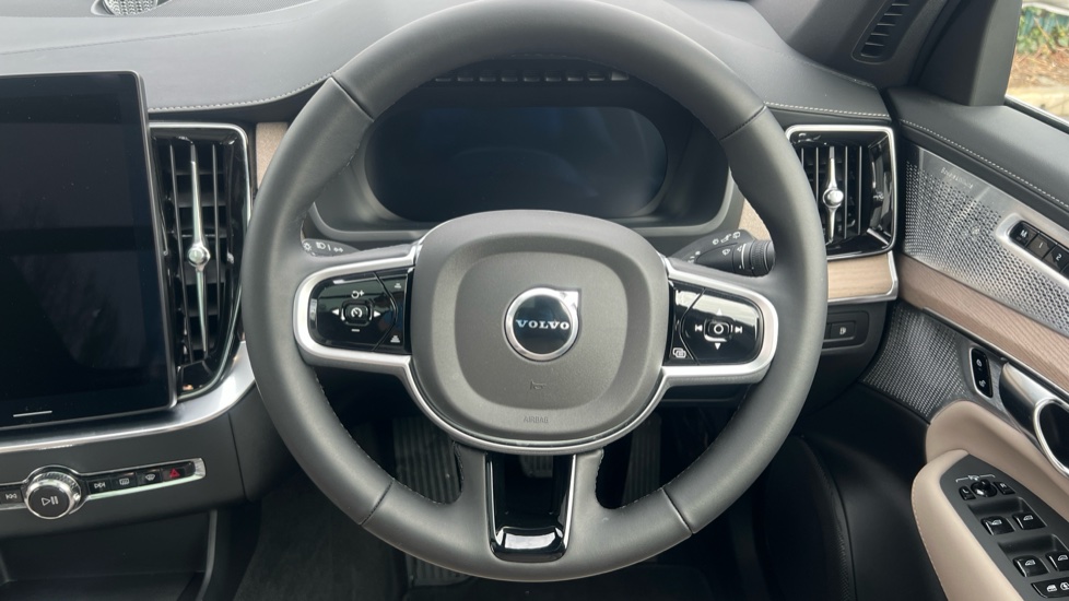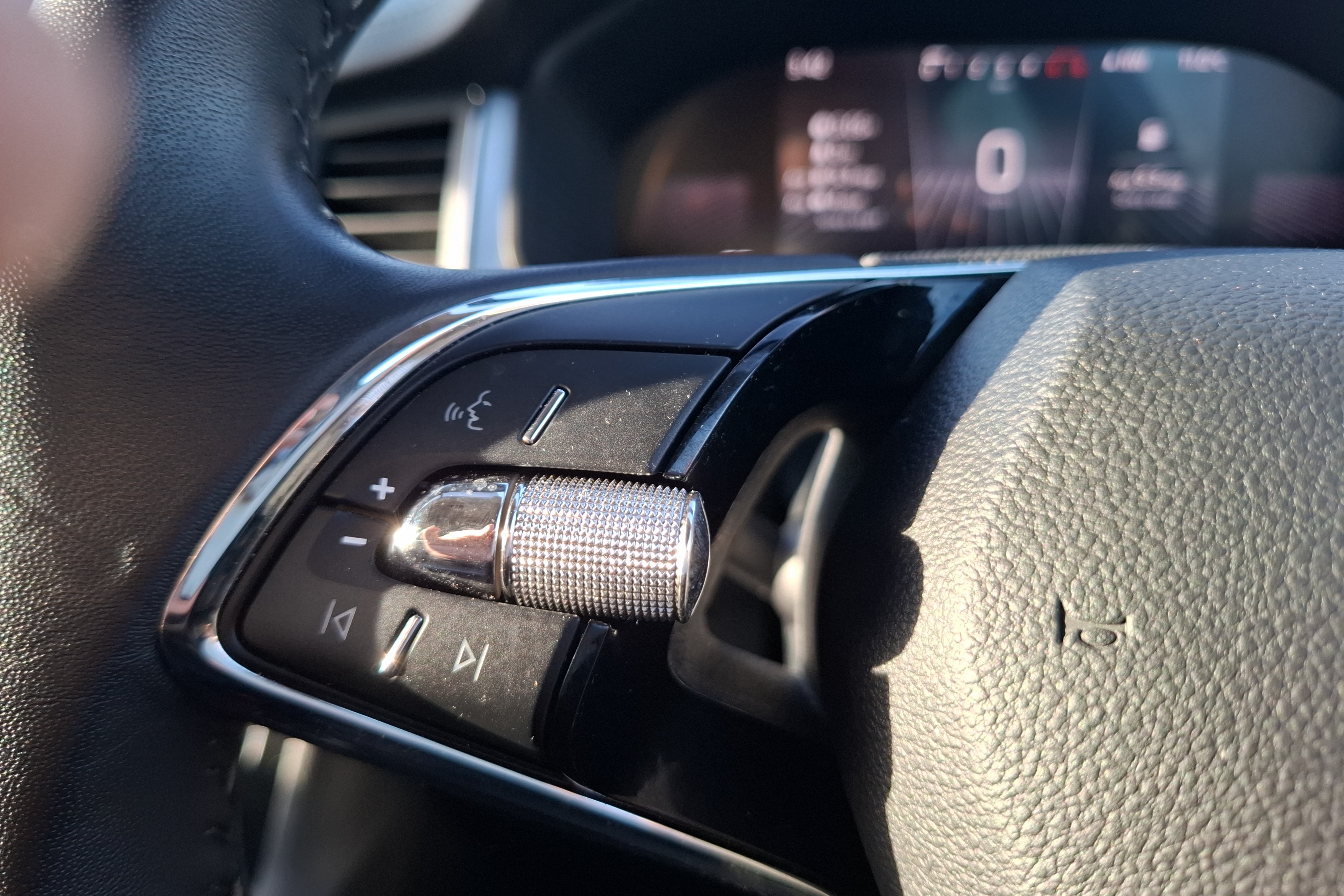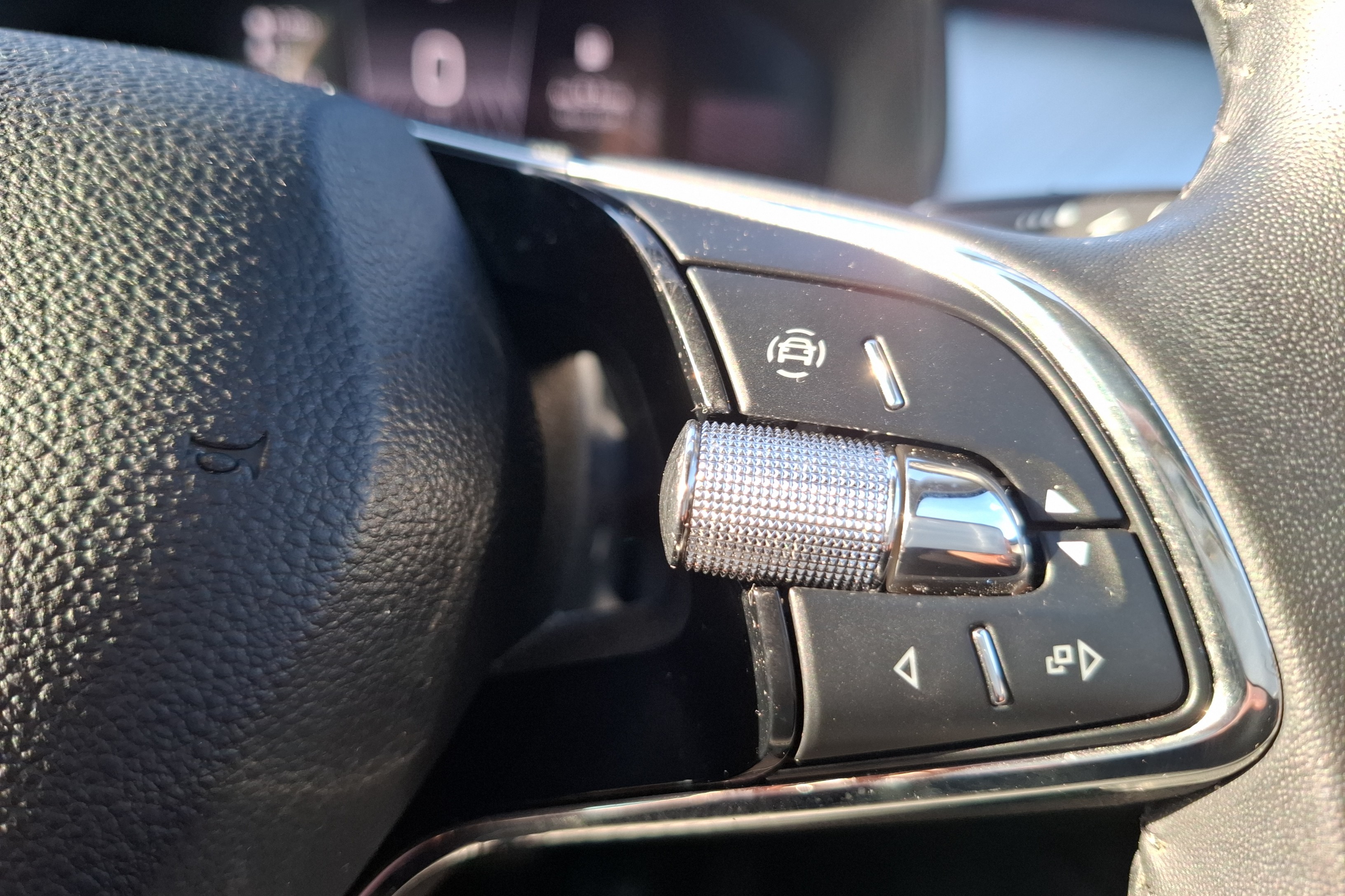 "3 spoke AMG multifunction sports steering wheel in nappa leather with chrome control panels and flattened bottom section with perforated grip area",